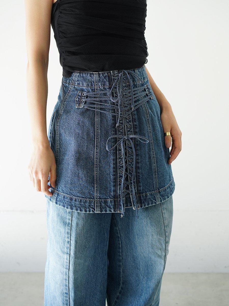 Chika Kisada(チカ キサダ)から、デニムコルセットベルトのご紹介です。柔らかなデニム素材で作られたレースアップが華やかでブランドらしさが溢れる一枚。フロントはバックル、バックはレースアップと、片面それぞれ異なるシルエットでどちらでも着用が可能です。同素材のデニムパンツと合わせたレイヤードスタイルもおすすめです。