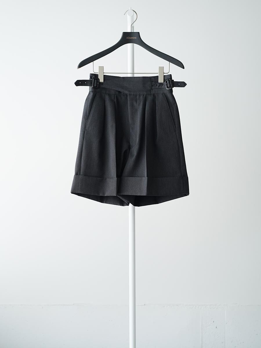THE RERACS (ザ・リラクス)からメリノウールのバラシャ素材を使用したグルカショーツのご紹介です。イギリス軍のグルカパンツをベースにTHE RERACSらしいシルエットと素材に落とし込んだデザイン。ウエストのベルトバックルのアクセントが特徴です。フロントはベルトをクロスさせ、両脇のバックルでウエストをアジャストでき、バックルは高級感のある本革を使用。バックポケットはフラップ仕様で、オリジナルのボタンは希少な水牛を用いており、一般的な物よりも立体的で厚みのある形状となっております。素材のハリ感とパターン設計が見事にマッチしたシルエット。インタックで腰回りと裾のけまわしを広めに設定しダイナミックなボリュームを形成しています。