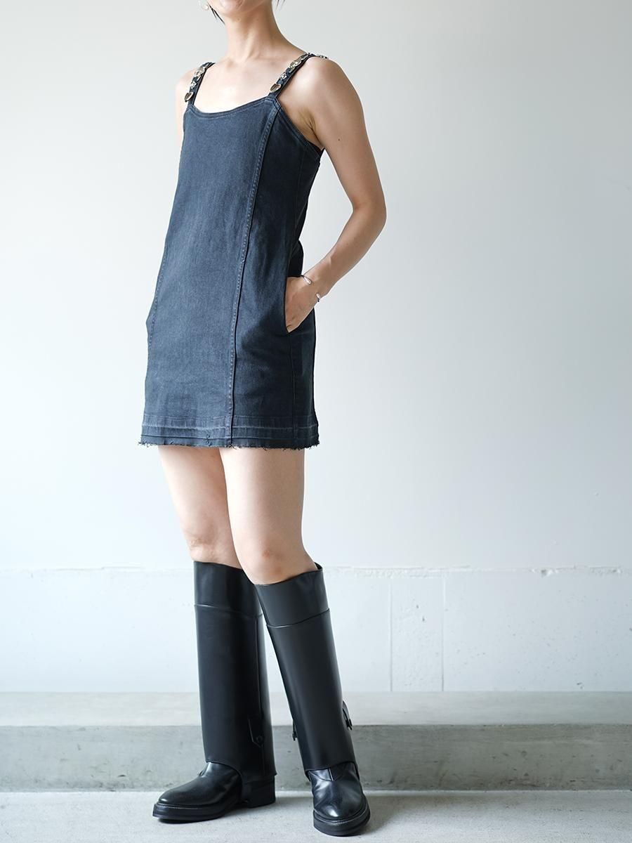 ボディラインを美しく引き立てるタイトなシルエットはコットンにポリウレタンが少し入っていることで、伸縮性があり柔らかな着心地も確立しながらデニムの素材感も楽しんでいただける一着。一枚で着るのもTシャツやシャツとのレイヤードスタイルもおすすめです。バックスタイルにはダブルジップが付いておりスムーズな着脱が可能な上、レザーモチーフがついていたりと着こなしにアクセントを与えます。