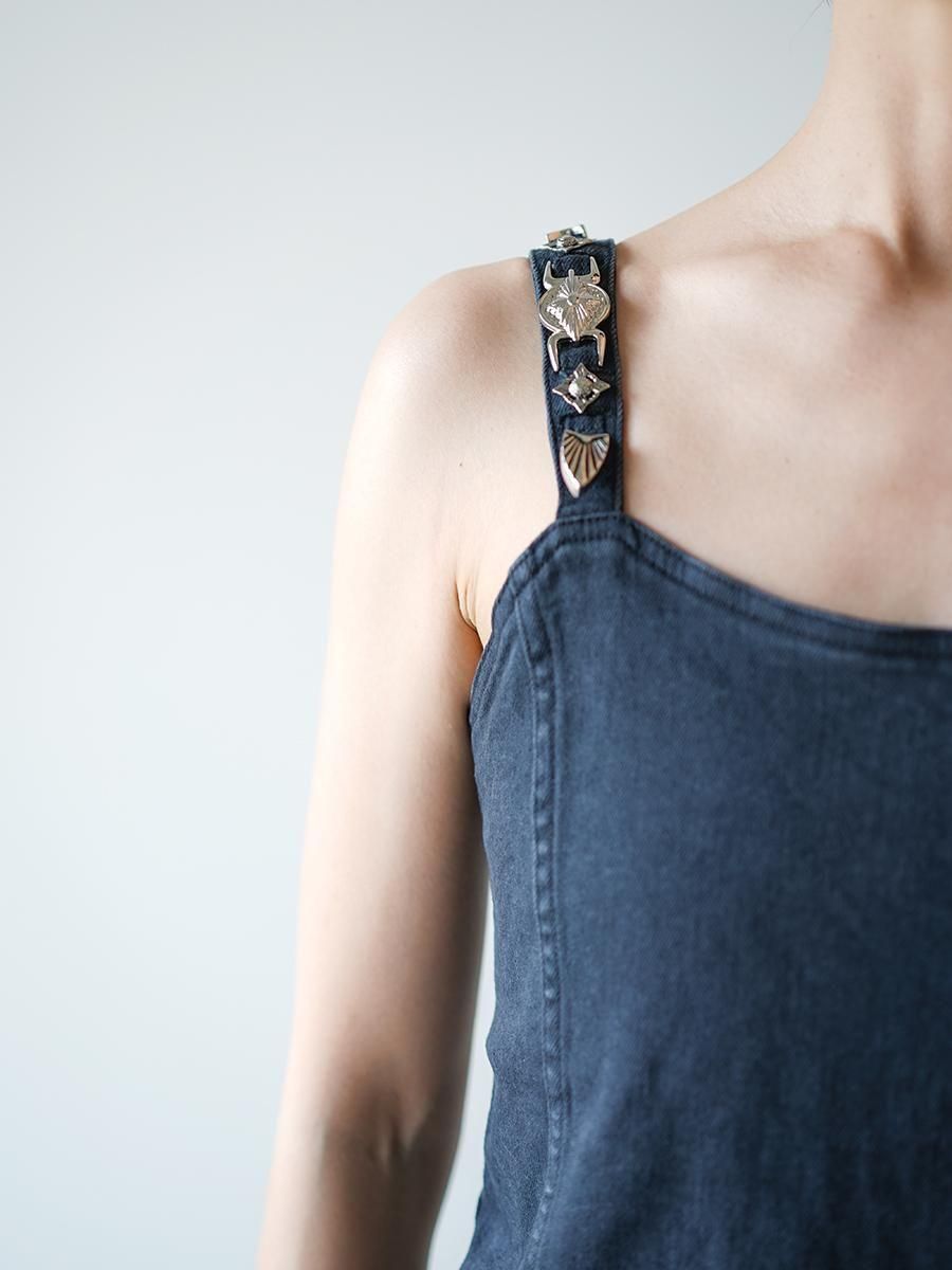 ショルダー部分にブランドのアイコニックなメタルパーツがあしらわれたデニムビスチェは女性らしいシルエットの中にハードさを感じるTOGAらしいデザイン。