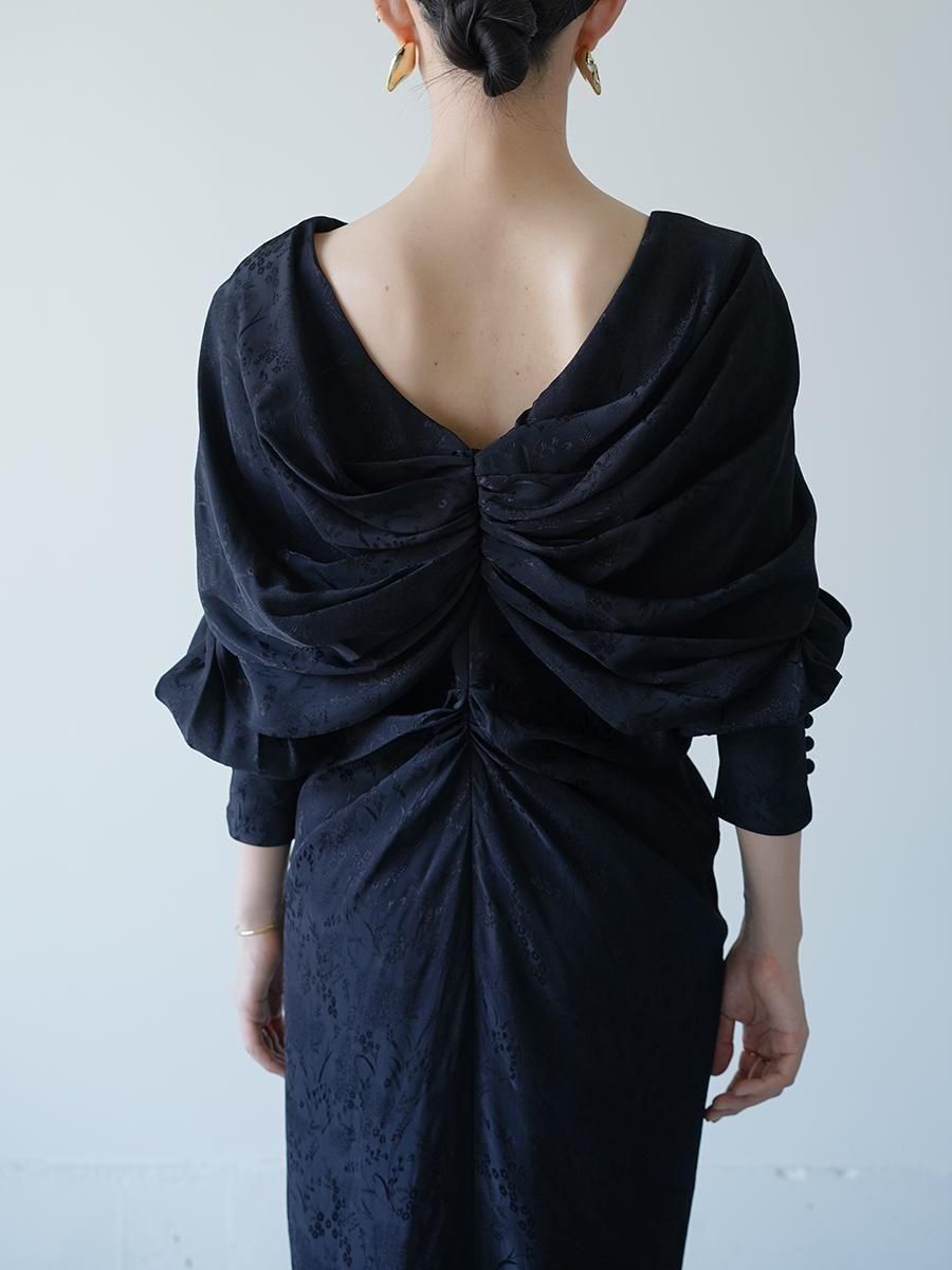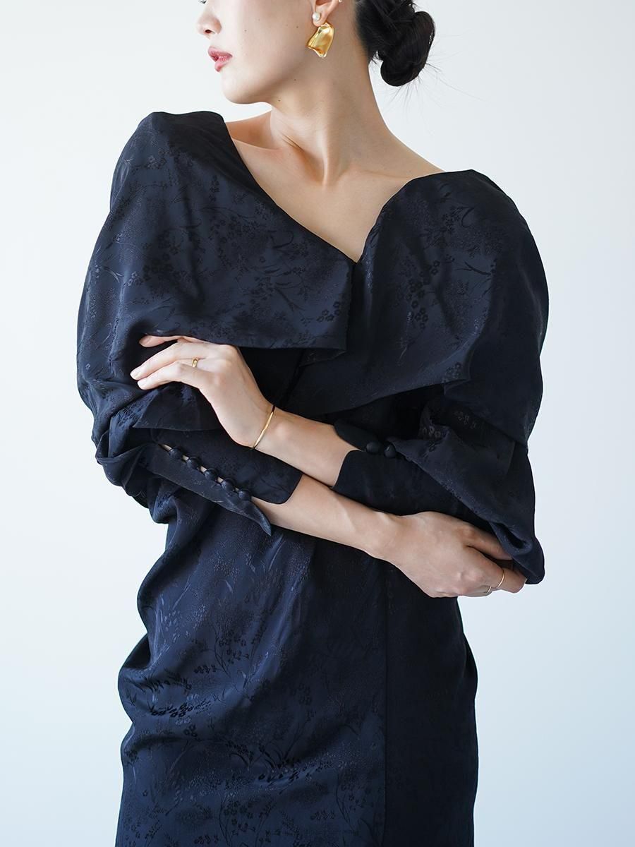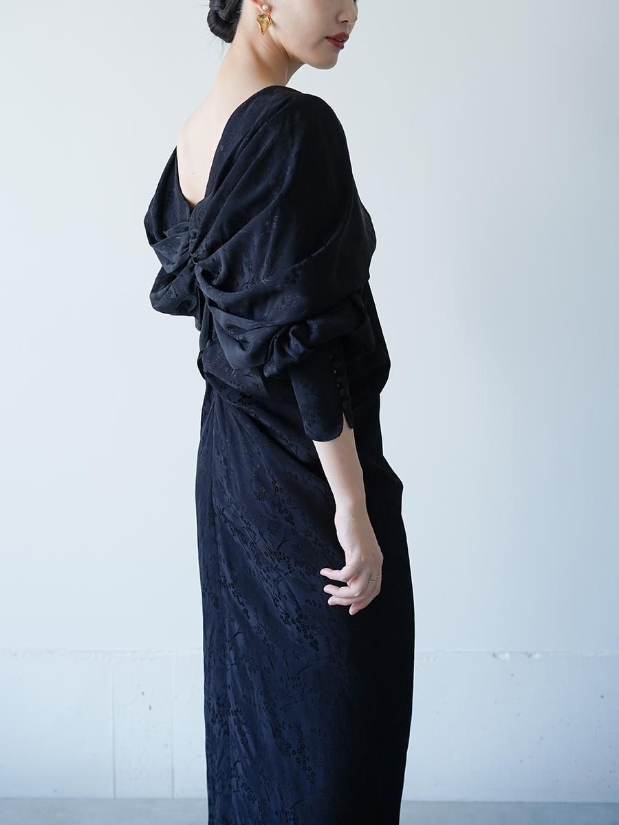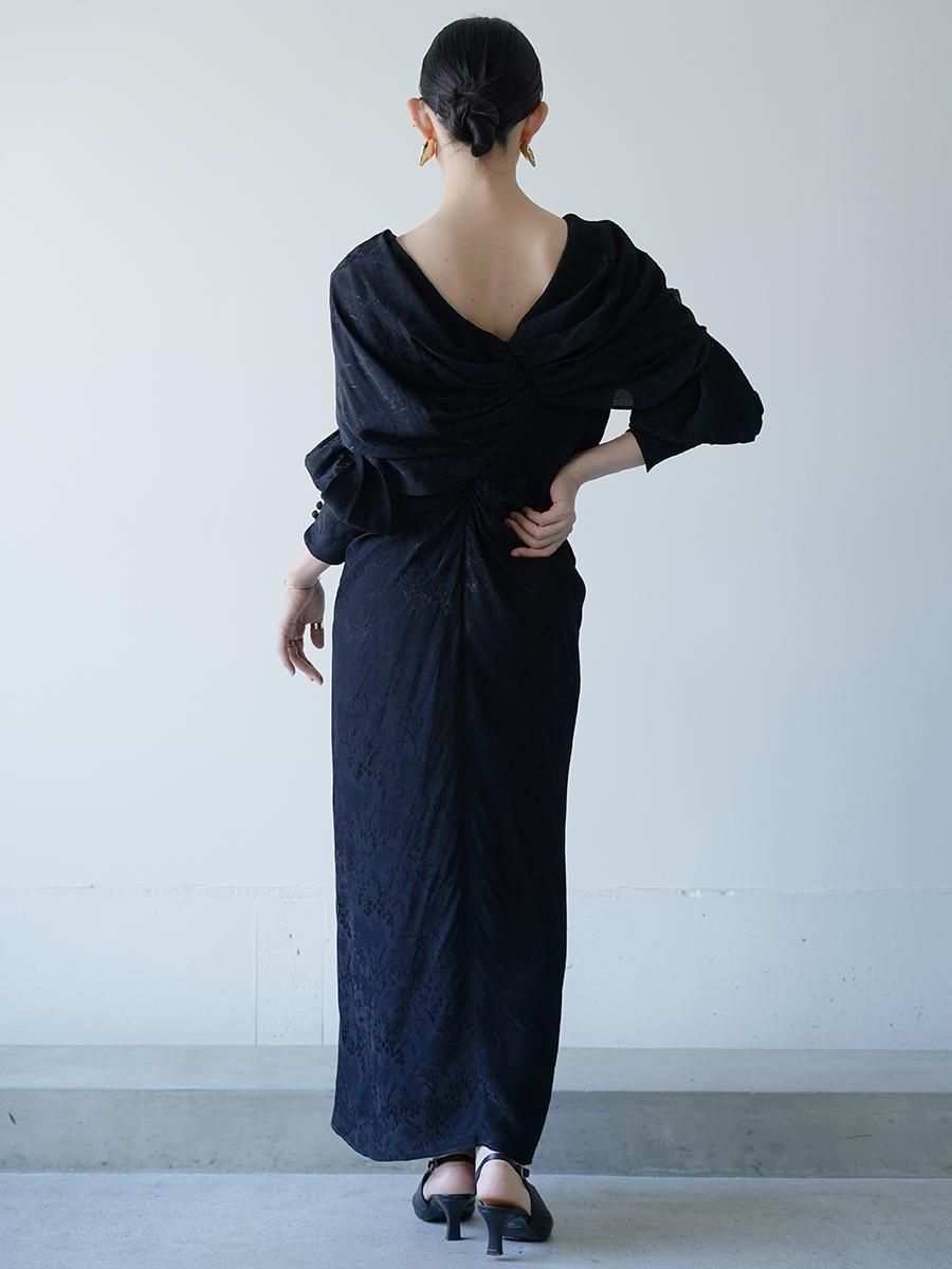 レーヨンを使用することで、肌触りの良さや鮮やかな発色、上品な光沢感を獲得し、細やかな野草柄の陰影が動くたびに見え隠れする。程よい落ち感が美しいドレスは、デコルテのカーブするラインからウエストにかけて身体に沿うように流れるドレープが美しく、バックスタイルはより華やかで贅沢なドレープがあしらわれる。細やかなディテールが随所に散りばめられた特別な1着。