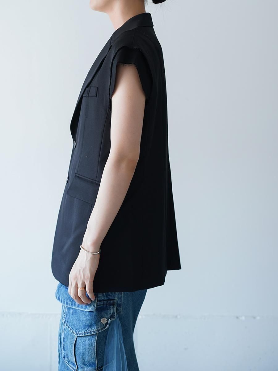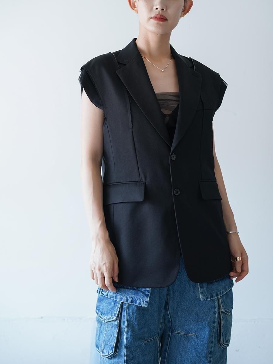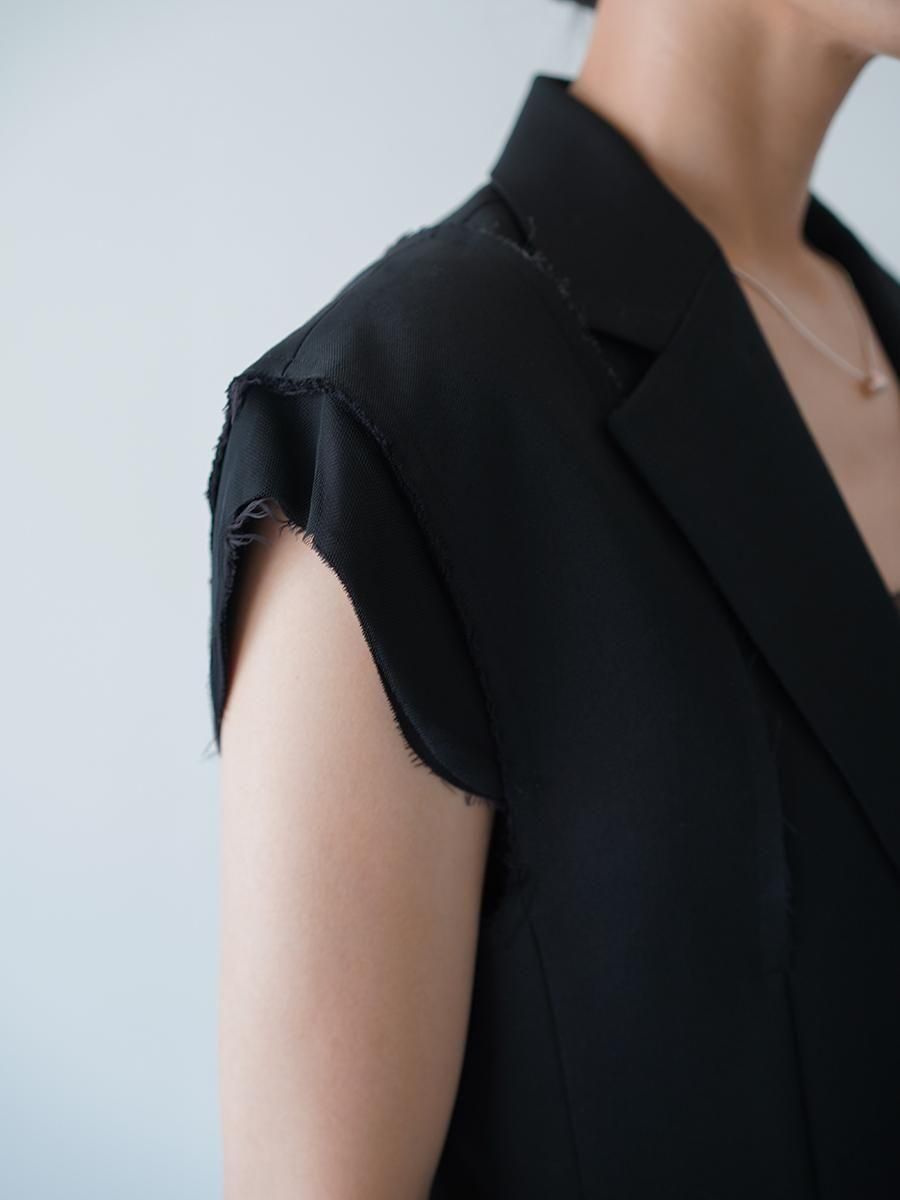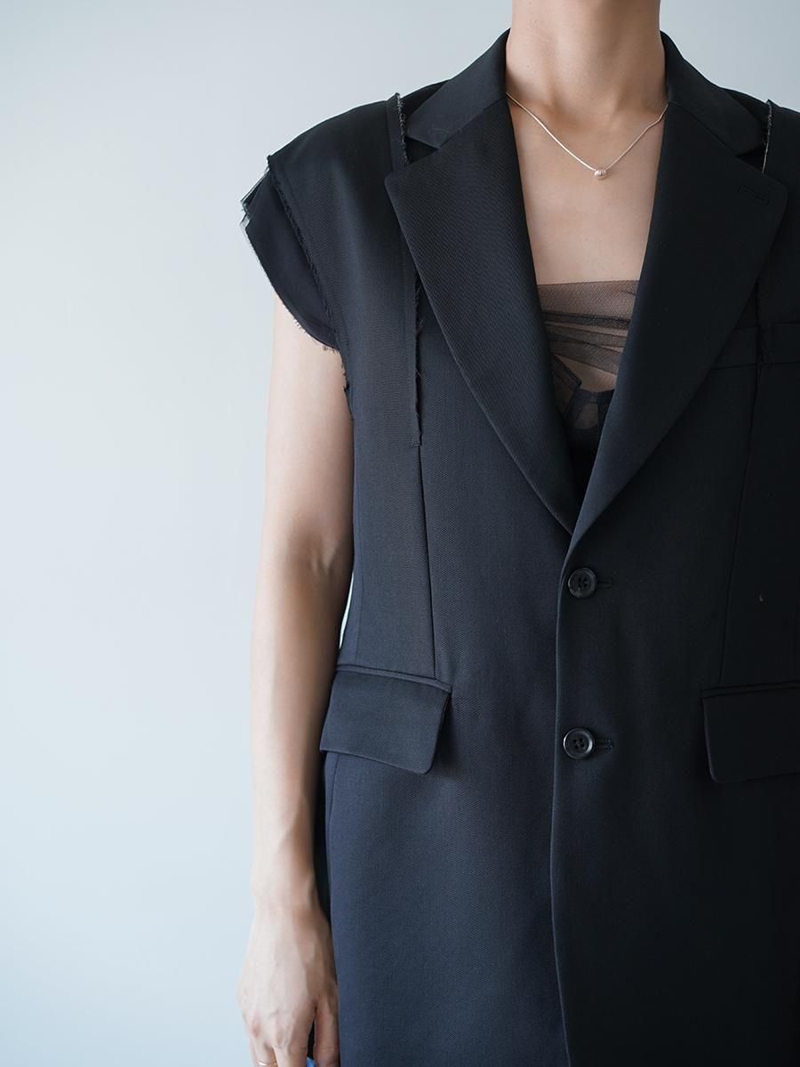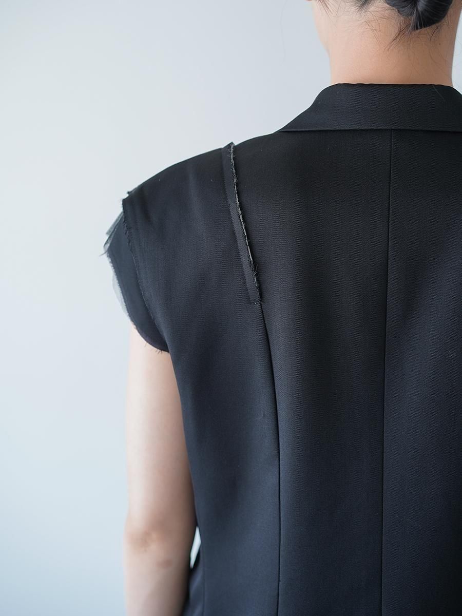 Chika Kisada(チカ キサダ)から、カットアウトされたショルダーから覗くチュールが印象的な、ブランドらしさ溢れるジャケットのご紹介です。洗練された美しいテーラードジャケットと、ショルダー部分に大胆に施されたカットアウトのデザインがスタイリングにアクセントを与えてくれる一枚。ショルダーの内側に重ねられたチュールは、まるでレイヤードしているかのような奥行きを感じさせます。シルエットはストンと落ちるボックス型で、程よいラフさを残しつつも、さりげないウエストのシェイプで女性らしさも引き出してくれるようなラインを出します。