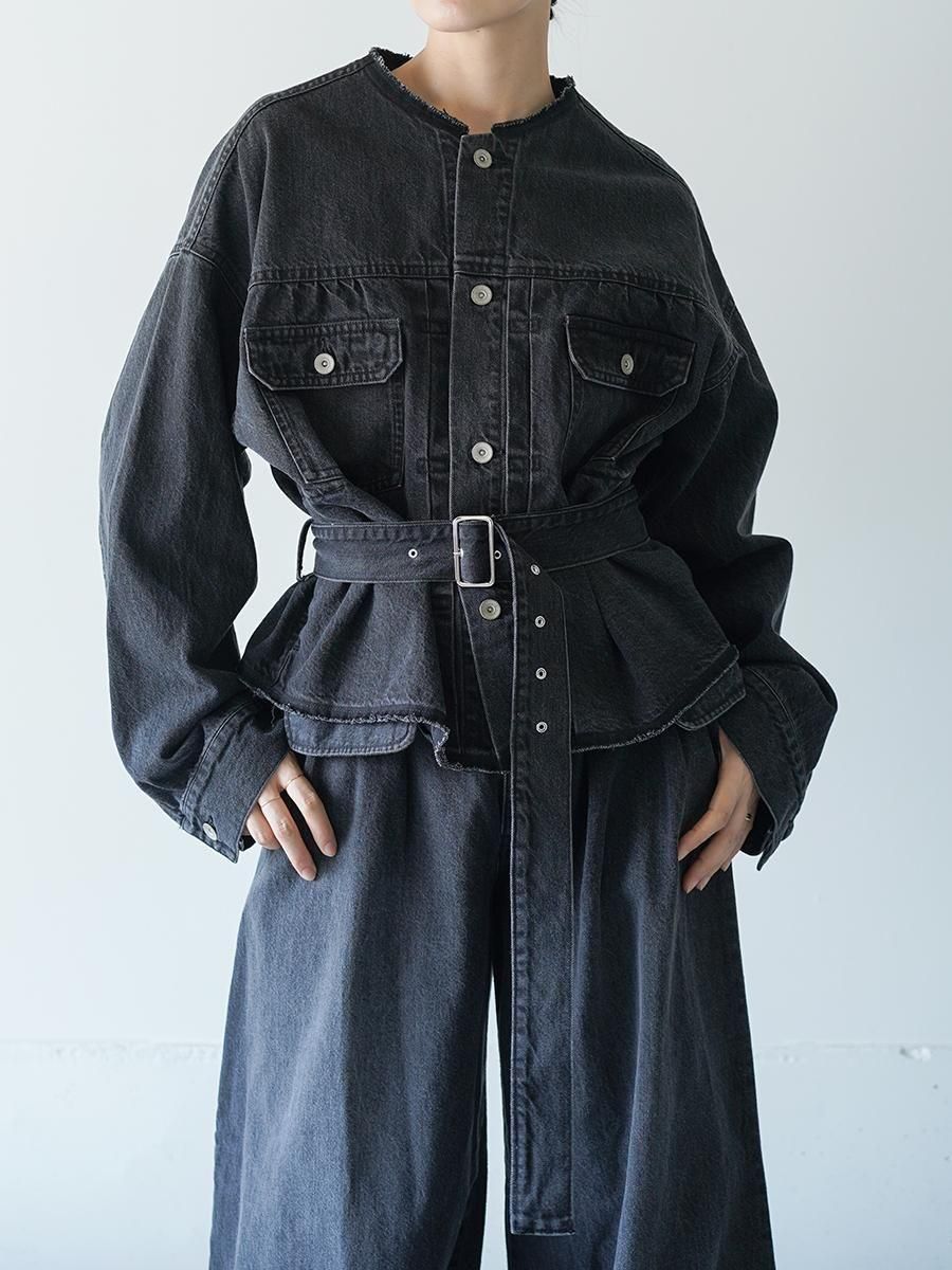 ブランドでは定番となるの岡山県児島産の空紡糸を使用したデニム素材。独特のムラ感、シボ感が特徴的で、空紡糸のため重量を感じさせません。製品加工(バイオブリーチ)を施しており、スレやムラ感、アタリの見え方が1点1点少しずつ異なります。裾ベルトはウエストのバックルベルトにリメイクを施しており、サスティナブル且つ、他には見ないブランドらしいデザインへ仕上がっております。ベルトは完全取り外し式、ベルトループが4箇所あるので、ウエストマークしたスタイリングも可能。同素材のデニムパンツとのセットアップスタイルもおすすめです。