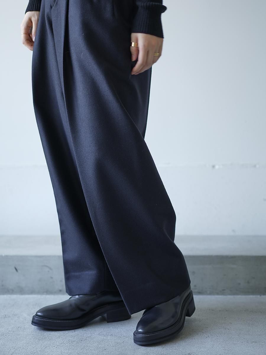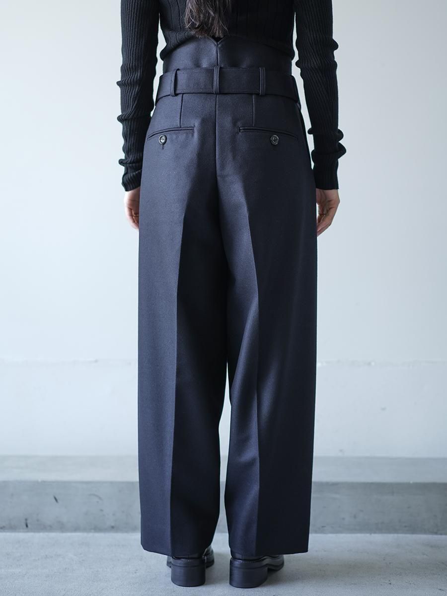 イギリス軍のスコットランド連隊のパレード用ウールトラウザーズをベースに、RERACSらしいシルエットと素材に落とし込んだデザイン。伝統的なミリタリーアイテムとドレスのように美しく構築されたパターン設計が融合したシルエットに仕上げました。