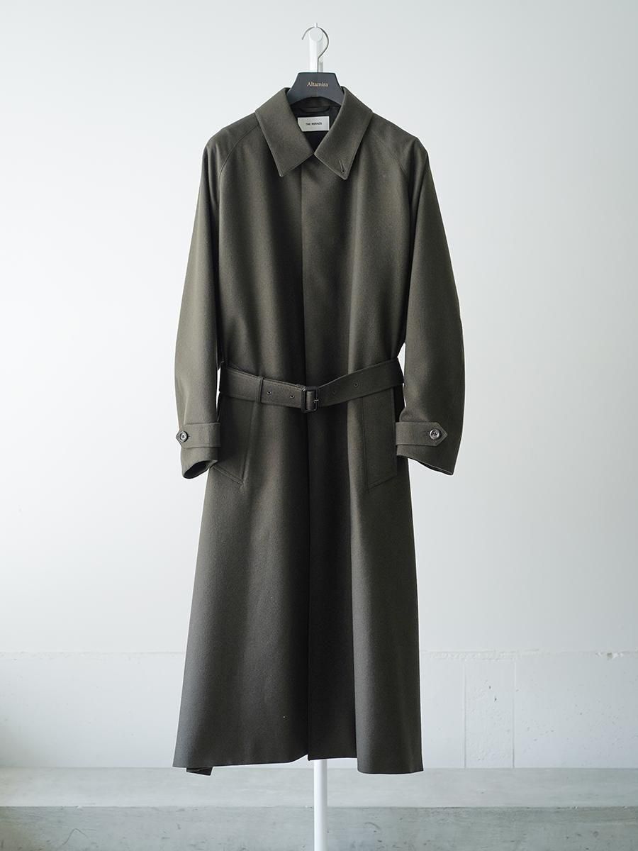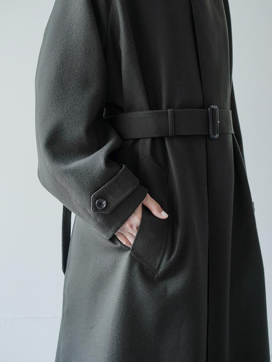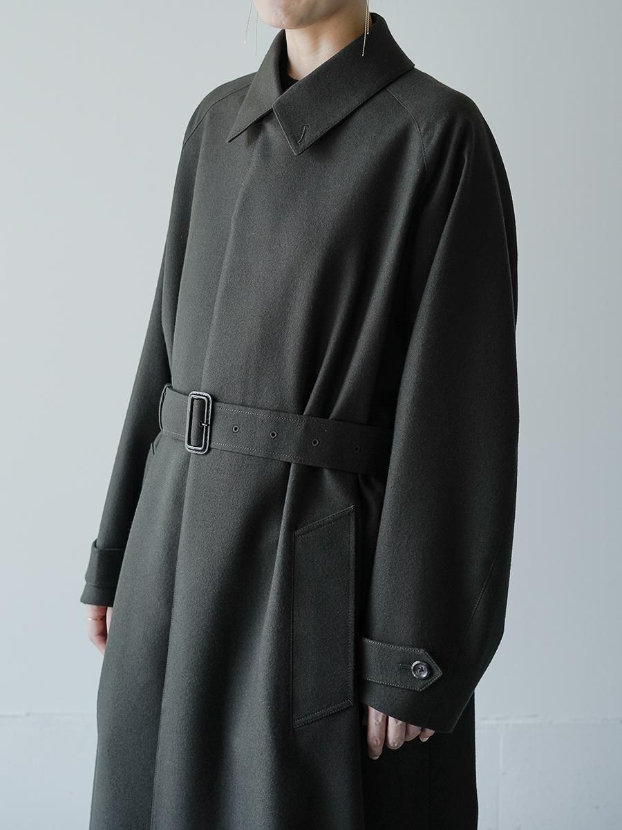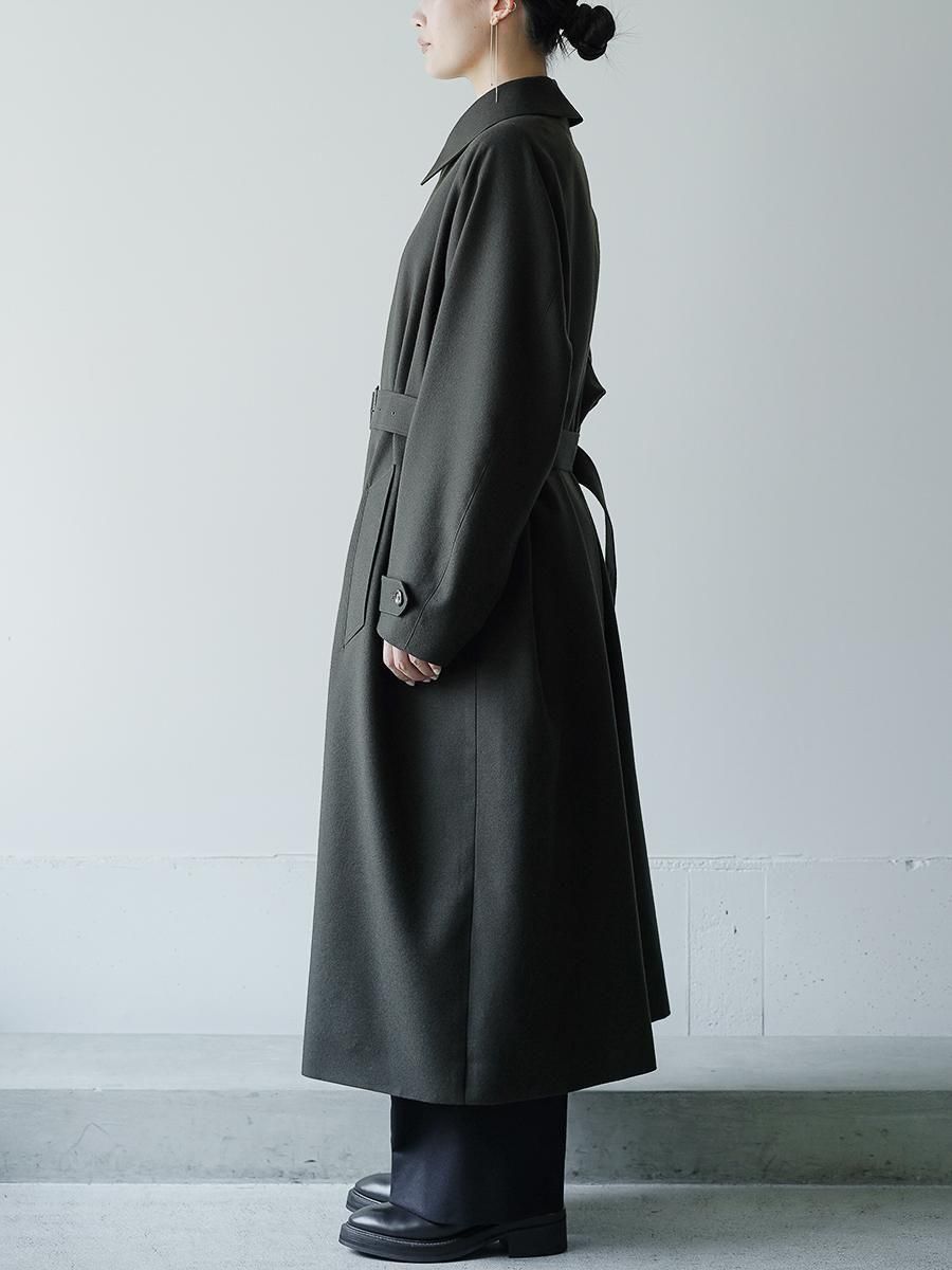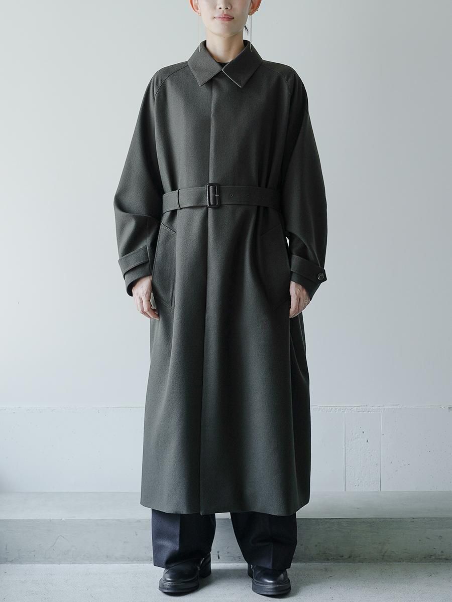 ダブルブレストではなく比翼のシングル仕立ての前立てやラグランスリーブにより柔らかな印象を演出。また、肩のエポーレット、ガンフラップを取り除き極限までディテールをそぎ落とすことで洗練された仕上がりとなっております。また、身幅の分量をたっぷりと取り、ポンチョに近いダイナミックなシルエットが特徴です。やや高めに配置されたウエストベルトを絞ることで腰回りがブラウジングされメリハリのあるシルエットに。襟は折り返して着用する以外に、襟を立たせてボタンを留めることでスタンドカラーとしても着用できる設計です。後身頃の裾にスリットを施しており、通常のトレンチコートのデザインを継承しています。伝統的なアイテムをよりRERACSらしくアップデートさせた実用性の高いMADE IN JAPANコートに仕上げています。