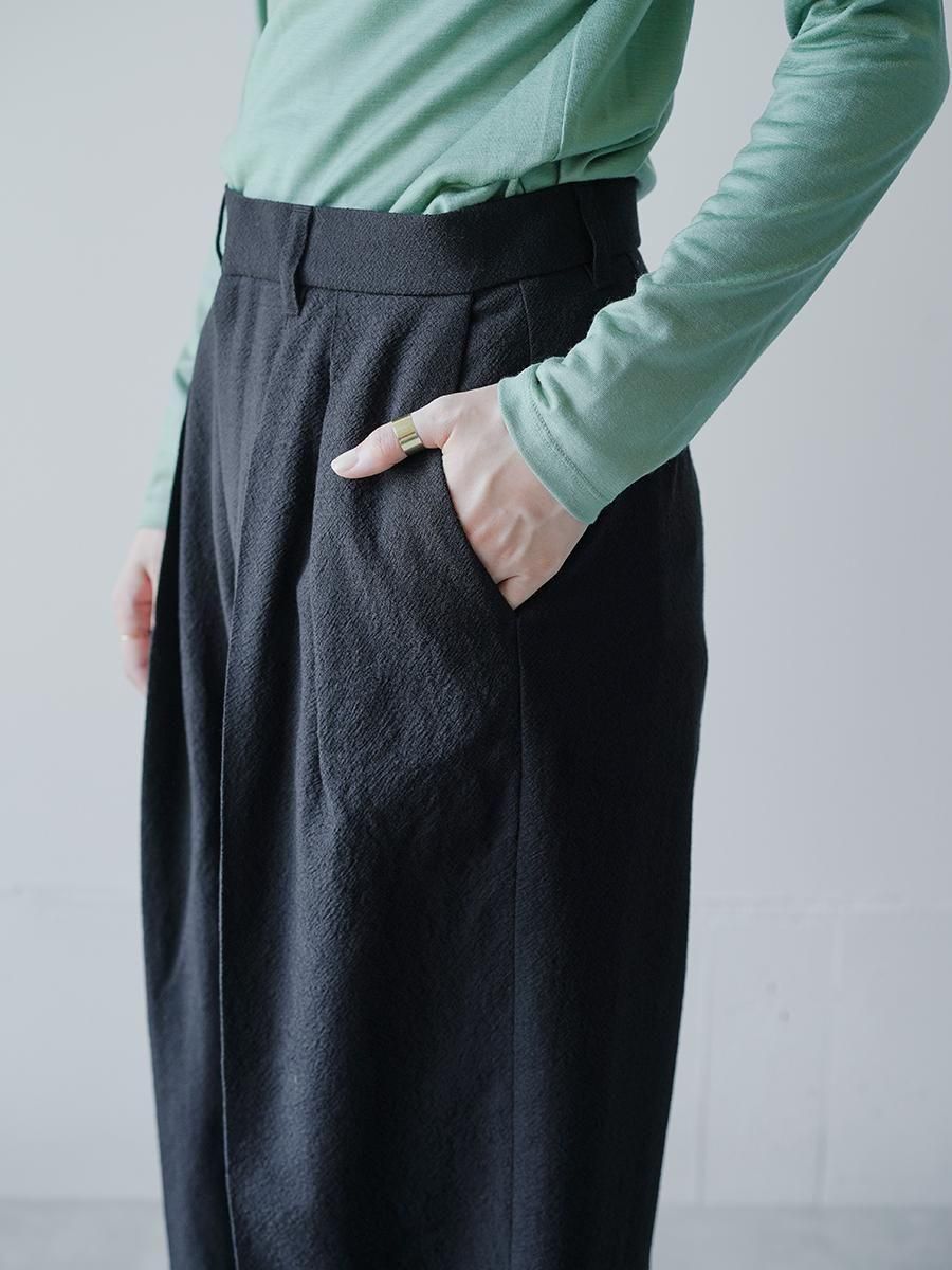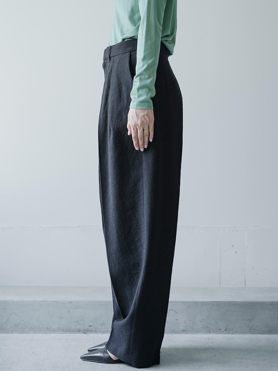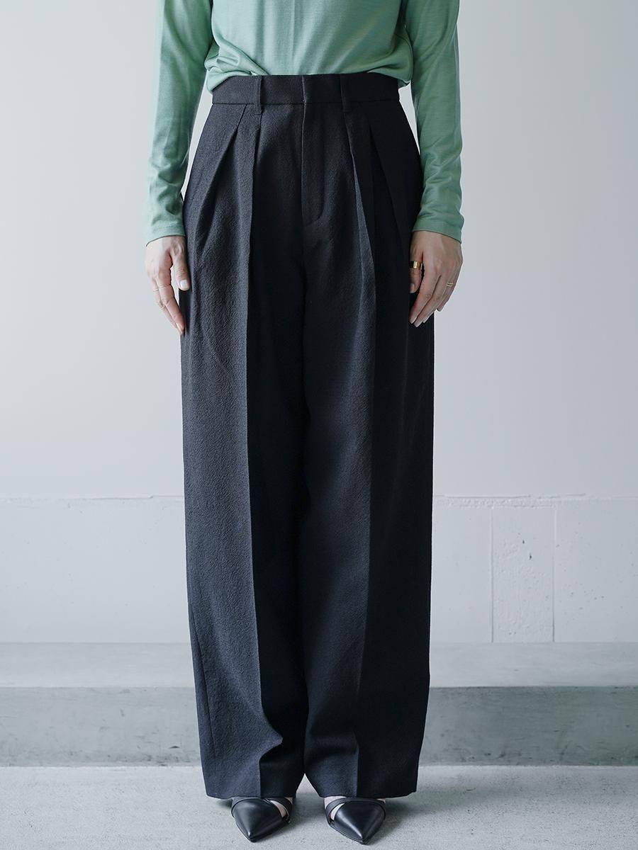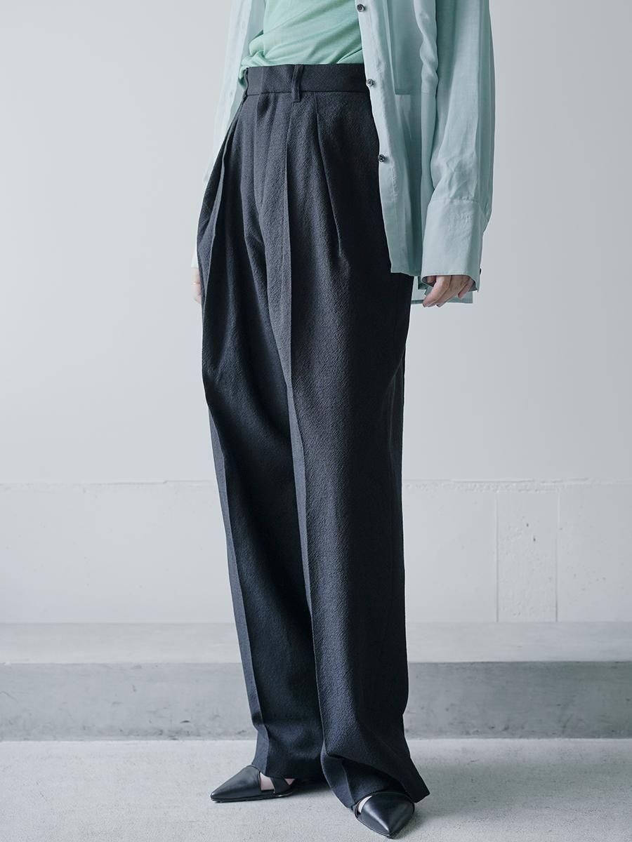 AKINARAKA(アキラナカ)から、フレッシュなシルエットと個性的なテクスチャーで見せるデザインが洗練された大人の佇まいへと導くツータックパンツ。
