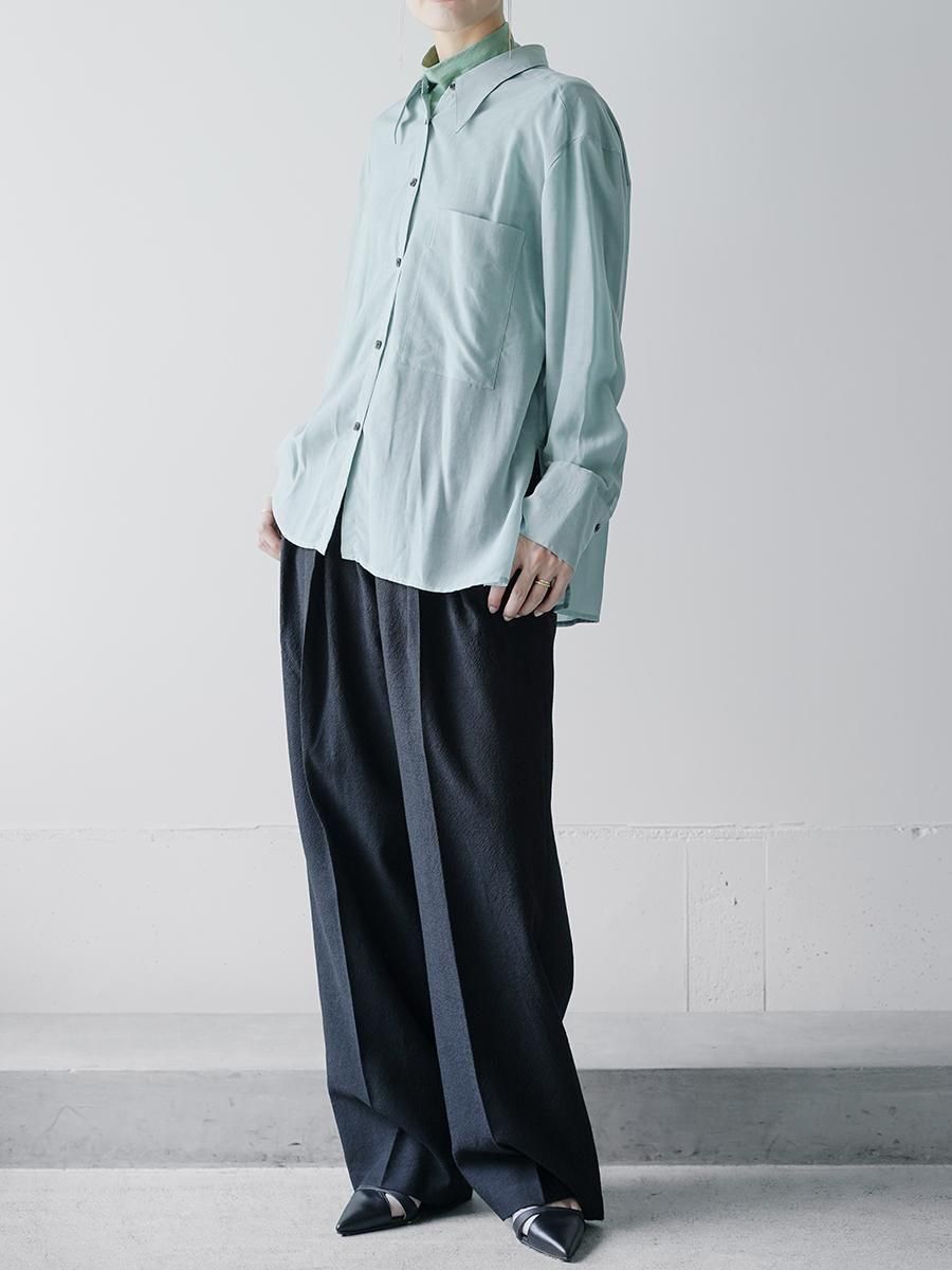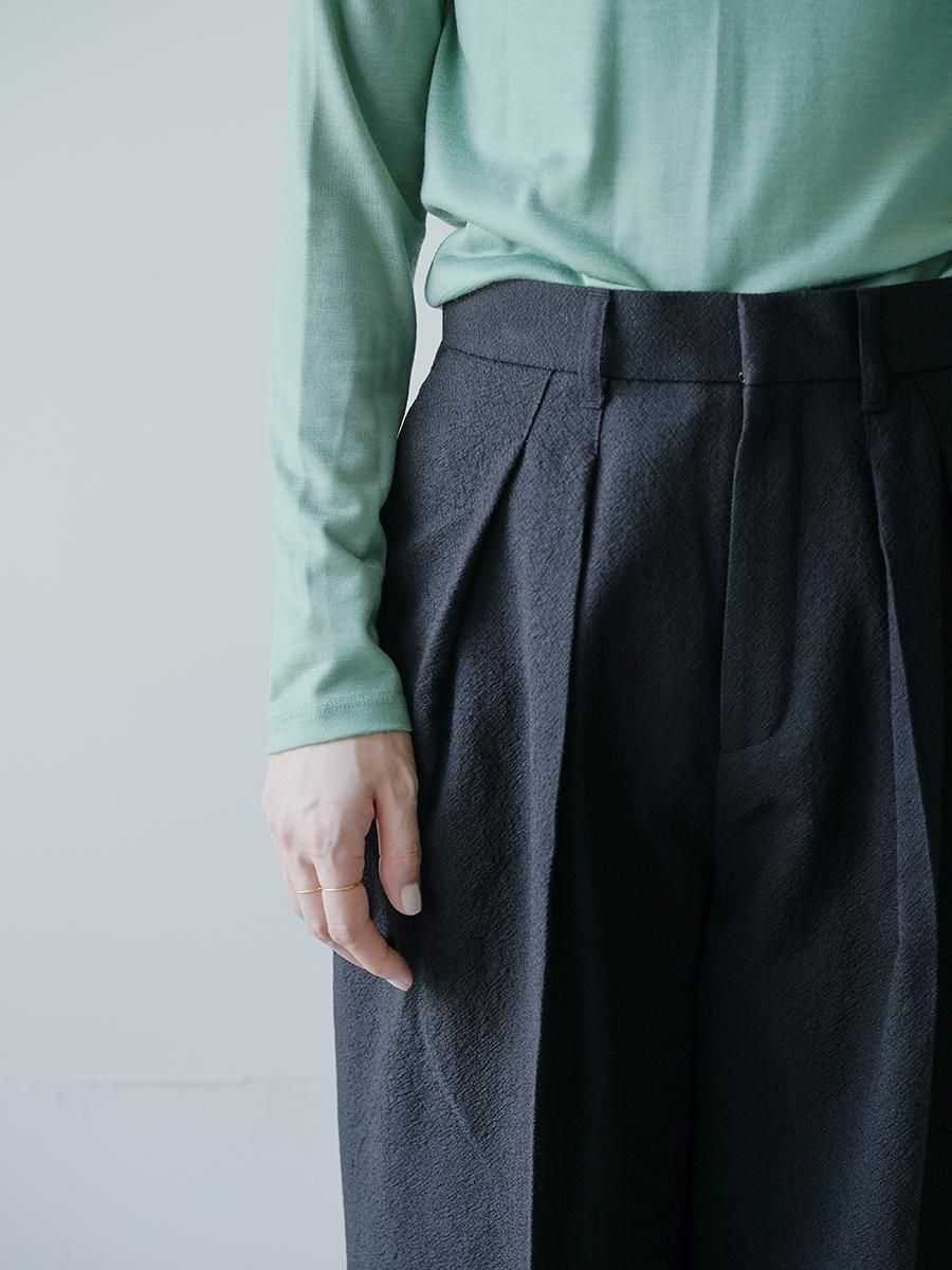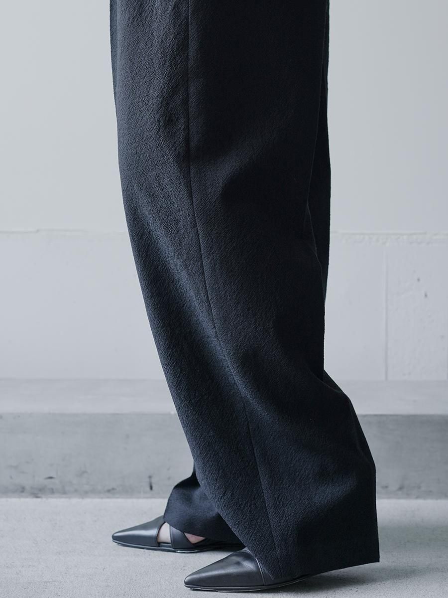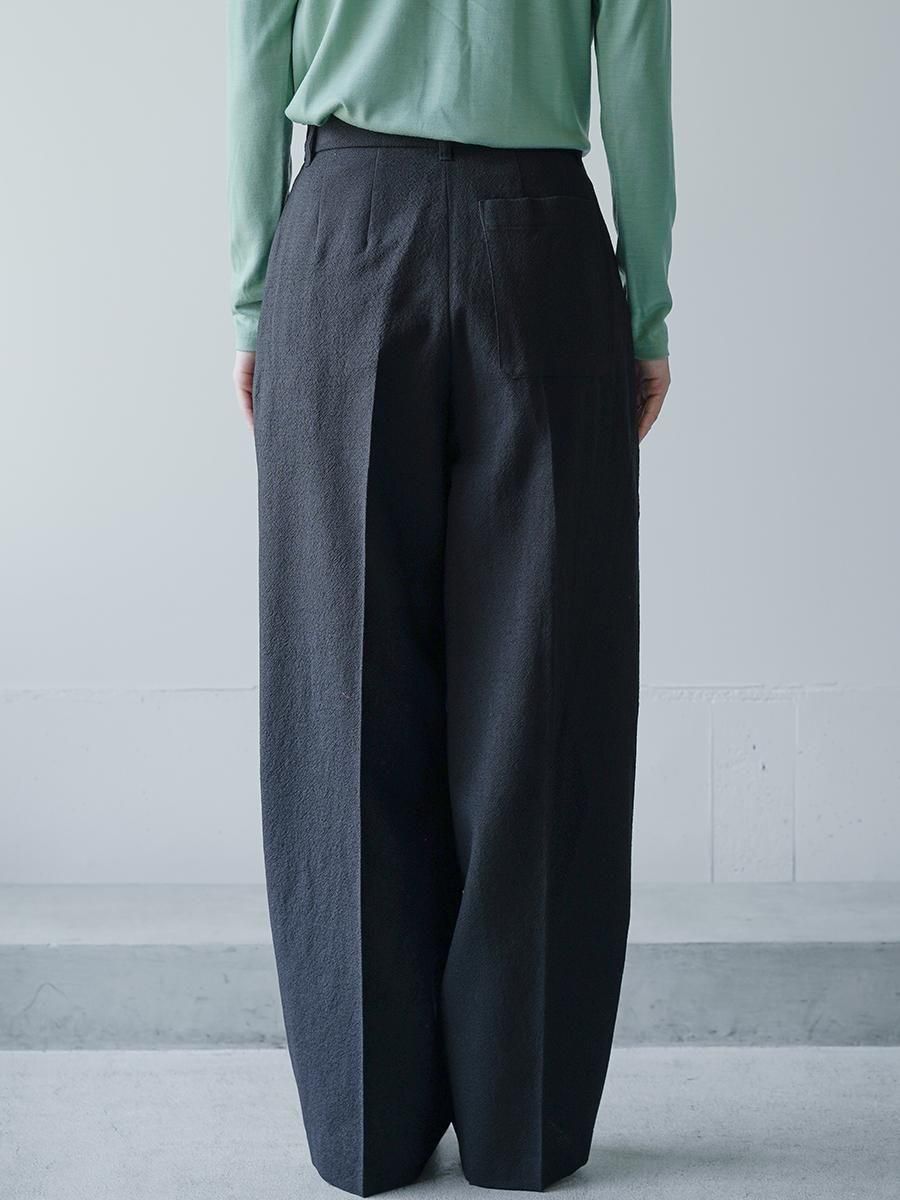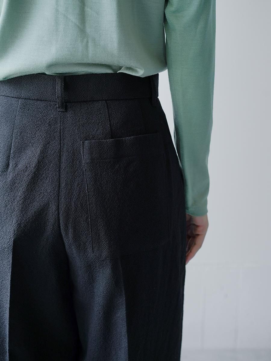 AKINARAKA(アキラナカ)から、フレッシュなシルエットと個性的なテクスチャーで見せるデザインが洗練された大人の佇まいへと導くツータックパンツ。