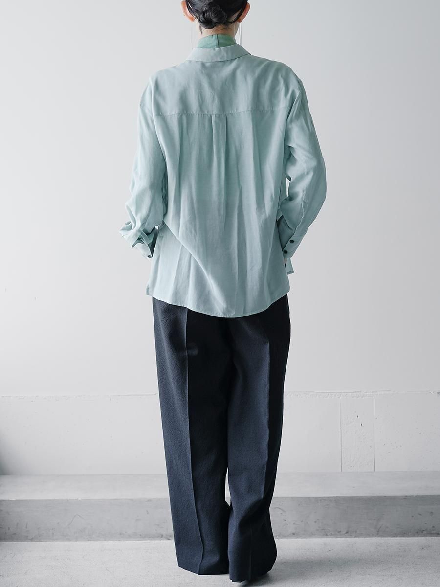 フロントに深く採られたインタックと裾に向かってテーパードするラインで仕立てられた緩やかなバレルシルエットは、独特な素材感を持った軽く適度なハリ感のウール素材を採用することで、そのフォルムを美しく保ちます。ミニマルな佇まいでありながら確かな個性とアーティテュードを演出する一着は、日々の装いをエレガントなムードへと導くだけでなく、大人の女性のエスプリの効いたスタイルを完成させます。