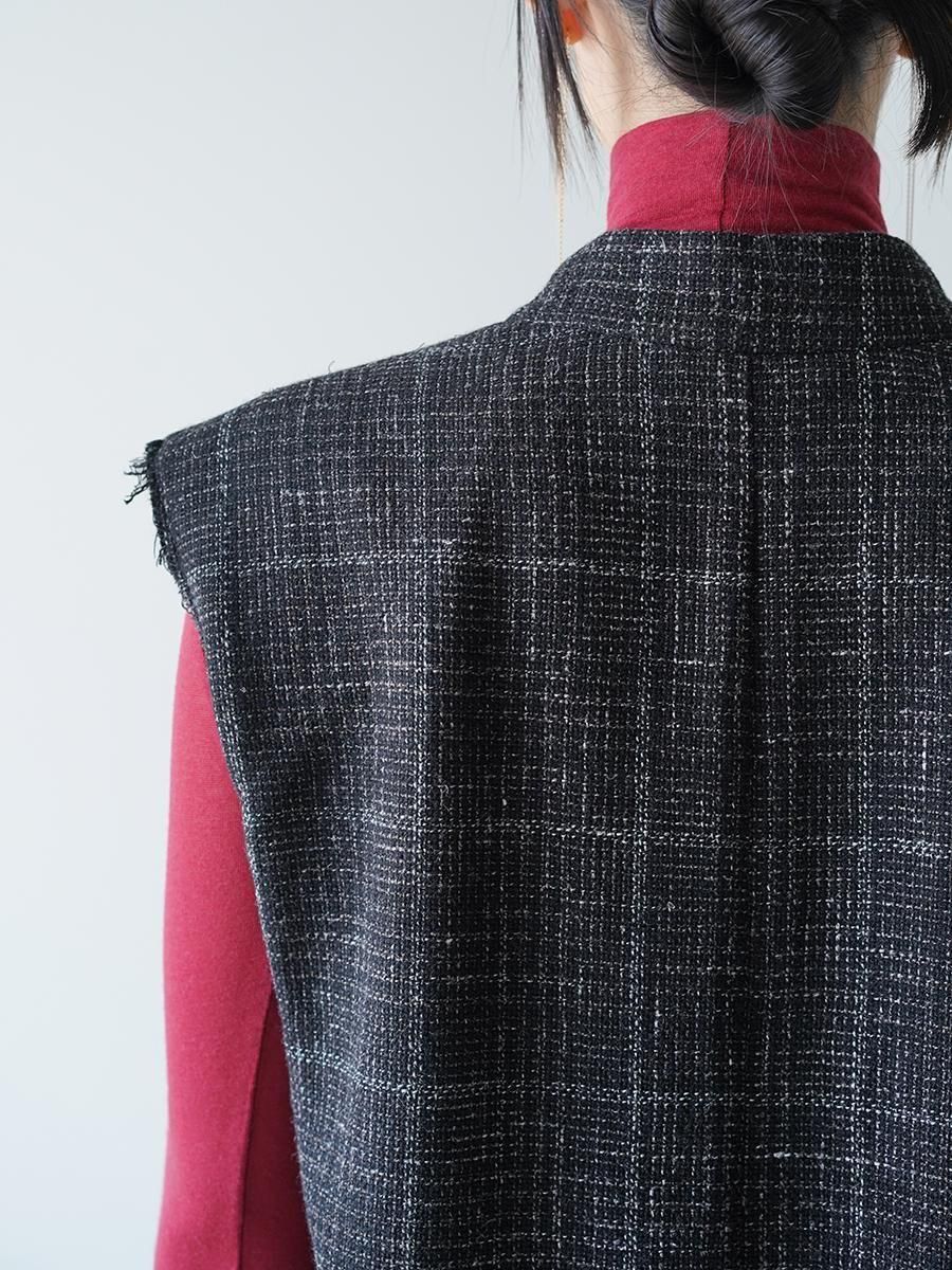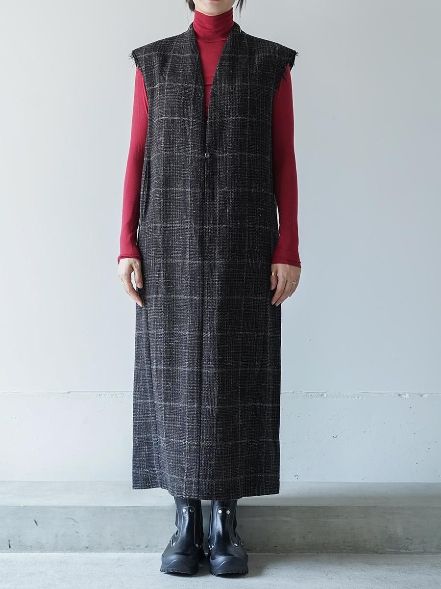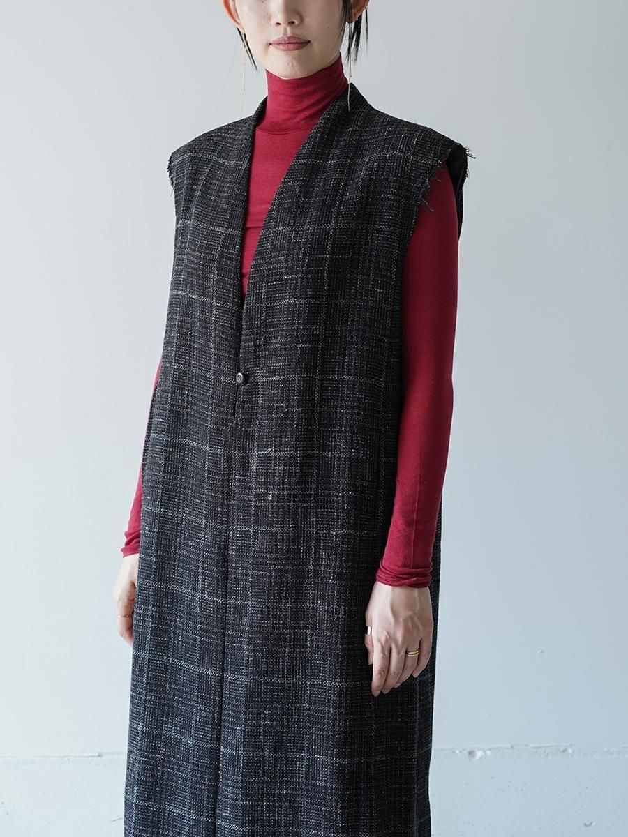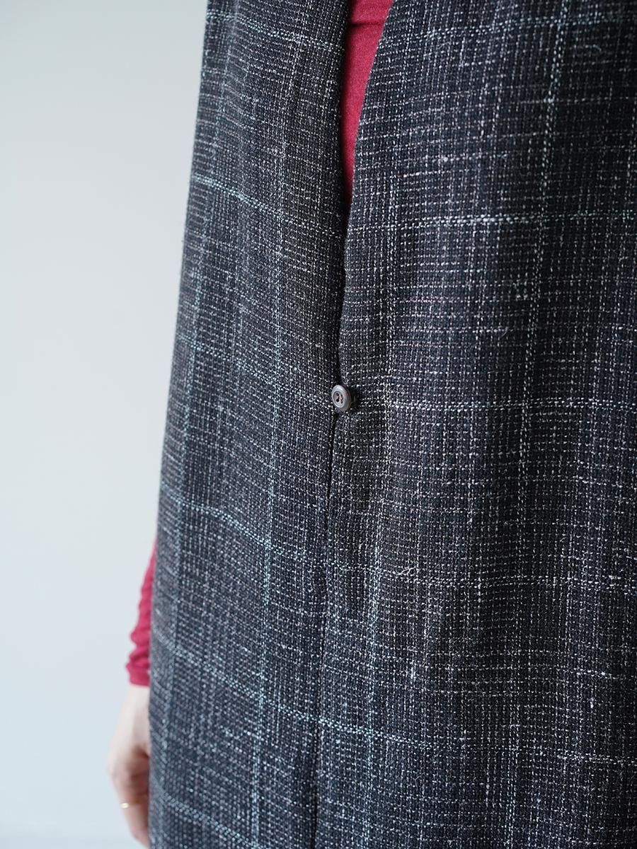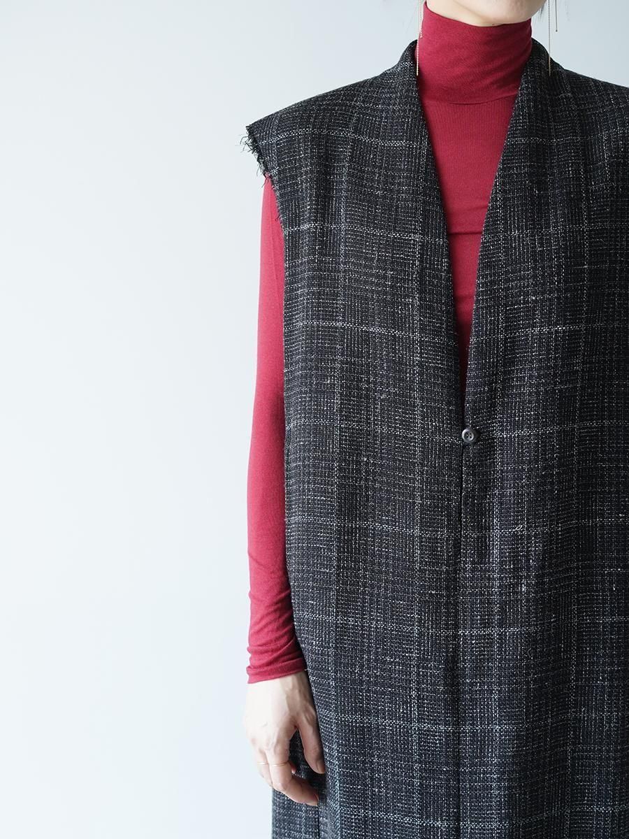 PHOTOCOPIEU(フォトコピュー)から、ロング丈のヴァルーズのご紹介です。フロントが深く開いたシルエットが特徴的なヴァルーズは、着脱がしやすく着心地豊かな一枚。V字に開くラインがすっきりして見え、洗練された印象を与えます。紡毛のラフな見た目に対して、エアリーでしなやかなタッチのリネンウール素材は、どこか温かみのある雰囲気を感じさせます。袖口は断ち切り、あえて肩パッドの断面が見えるデザインに。切りっぱなしの生地から伸びる糸がフリンジのように揺れ、軽やかな動きを演出します。