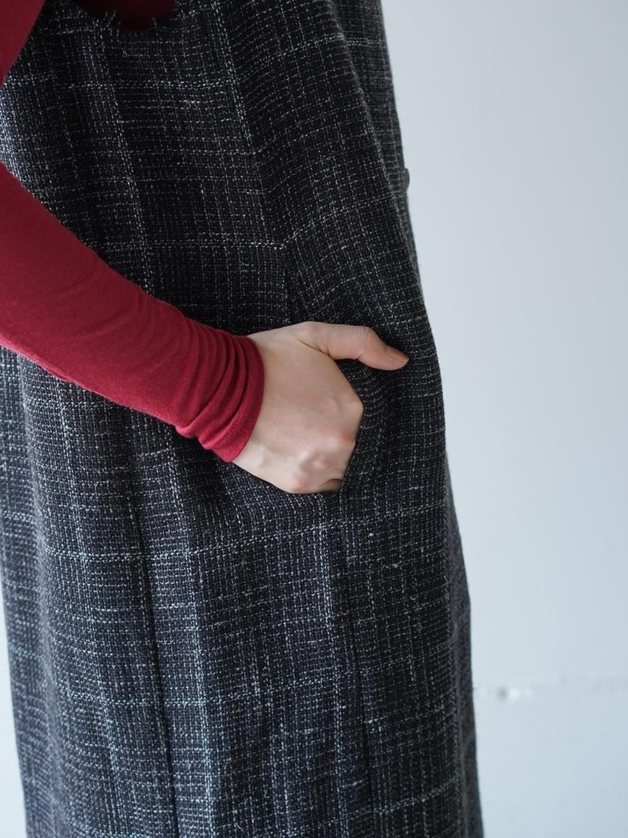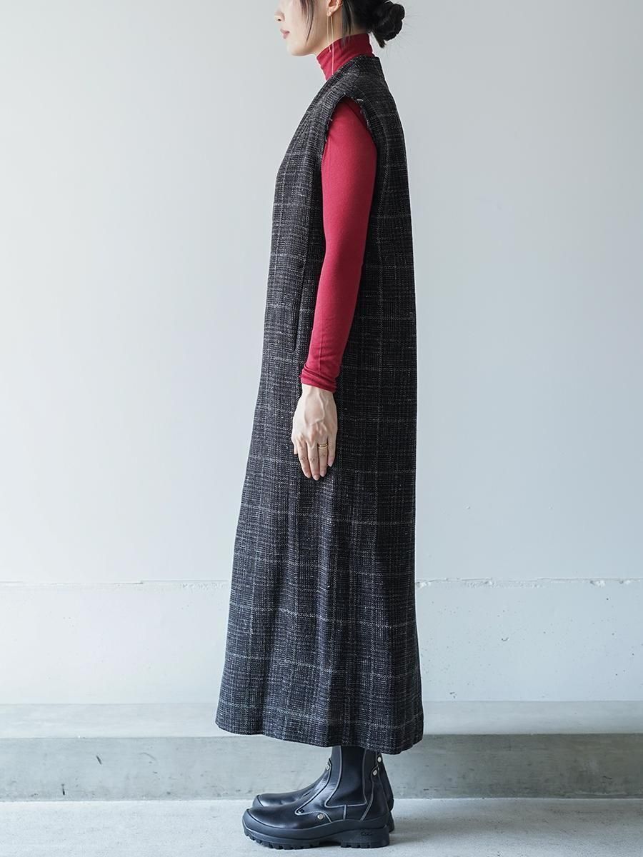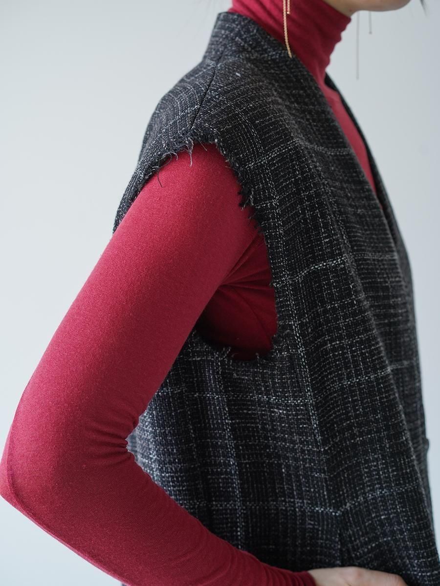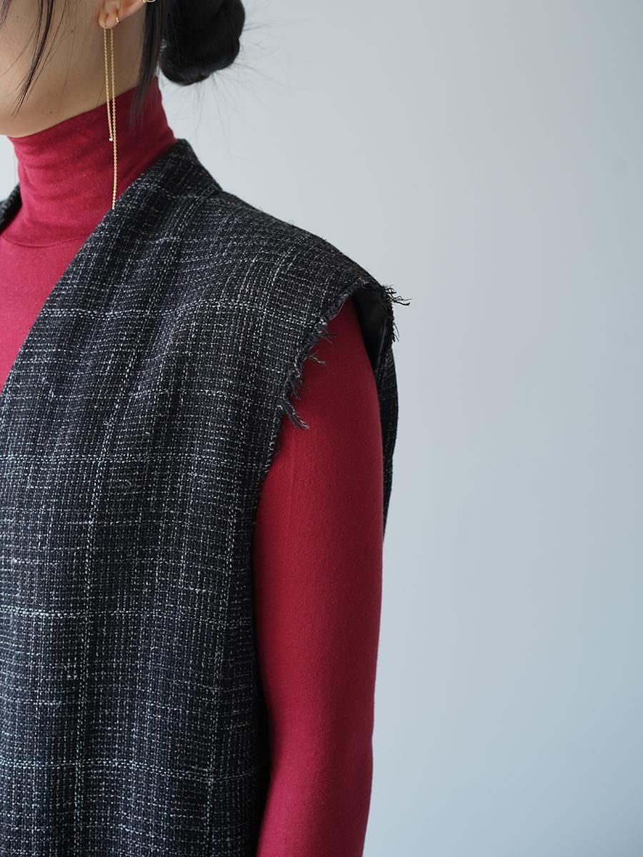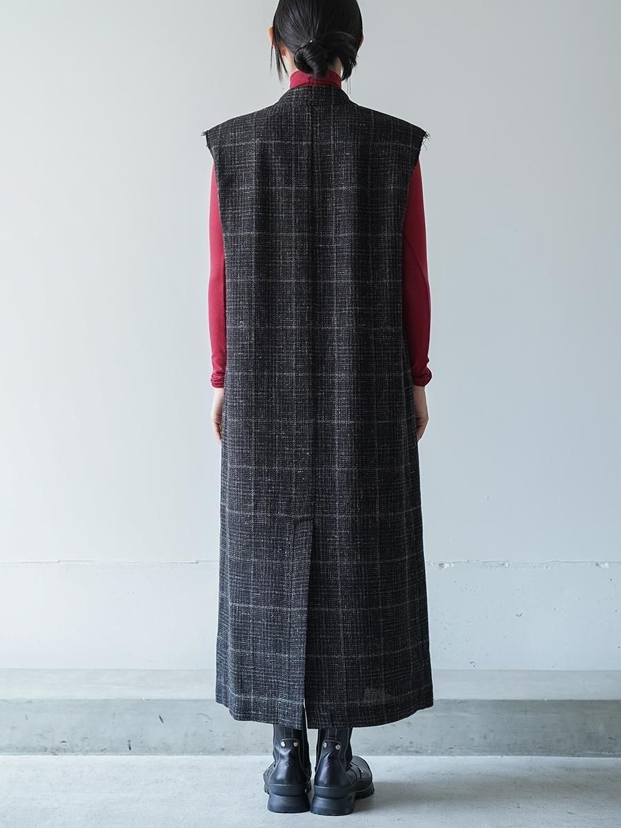PHOTOCOPIEU(フォトコピュー)から、ロング丈のヴァルーズのご紹介です。フロントが深く開いたシルエットが特徴的なヴァルーズは、着脱がしやすく着心地豊かな一枚。V字に開くラインがすっきりして見え、洗練された印象を与えます。紡毛のラフな見た目に対して、エアリーでしなやかなタッチのリネンウール素材は、どこか温かみのある雰囲気を感じさせます。袖口は断ち切り、あえて肩パッドの断面が見えるデザインに。切りっぱなしの生地から伸びる糸がフリンジのように揺れ、軽やかな動きを演出します。