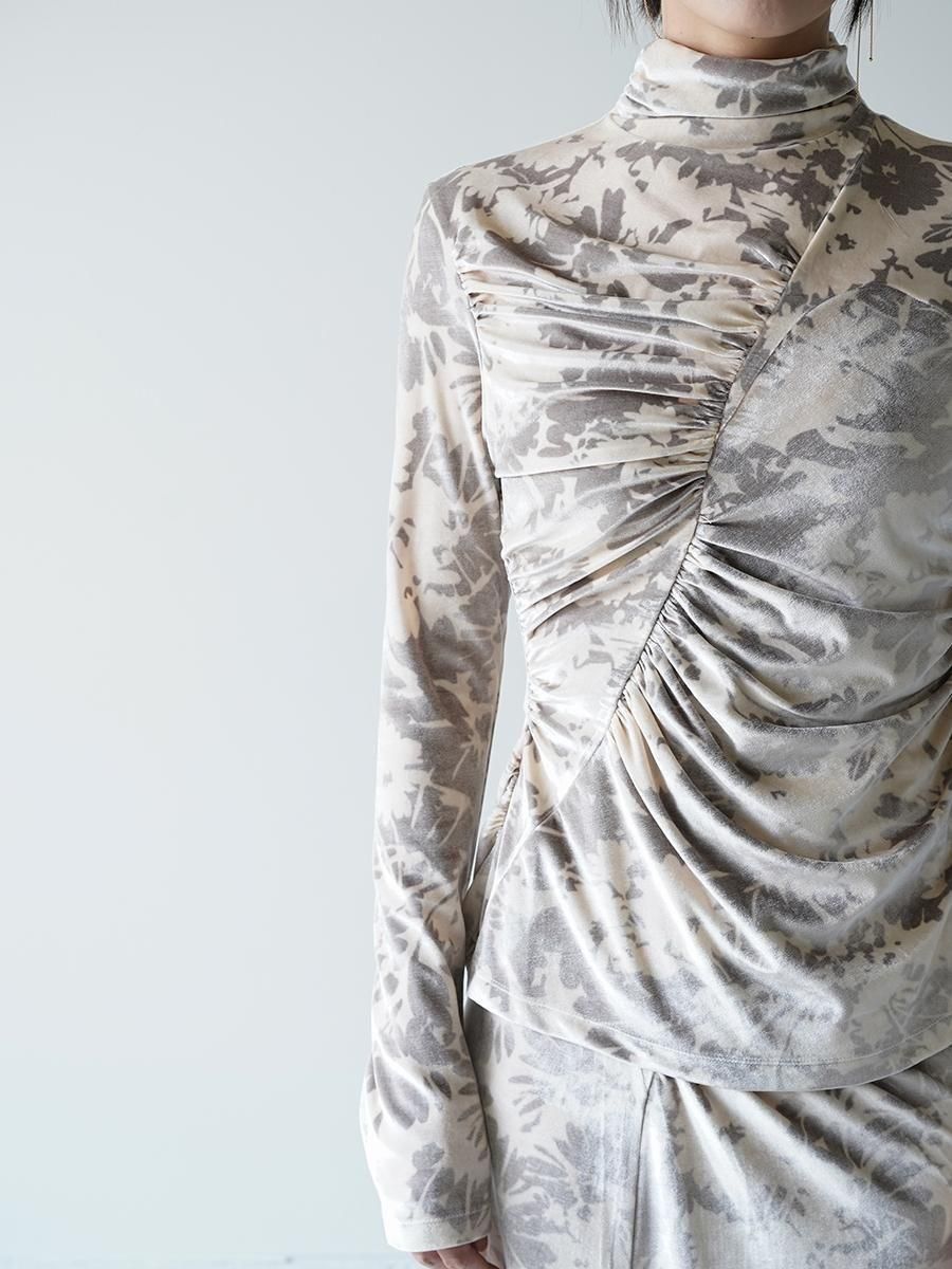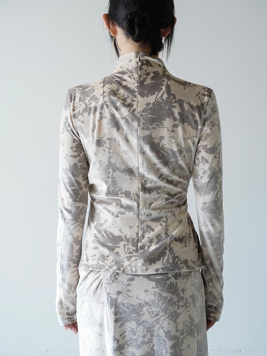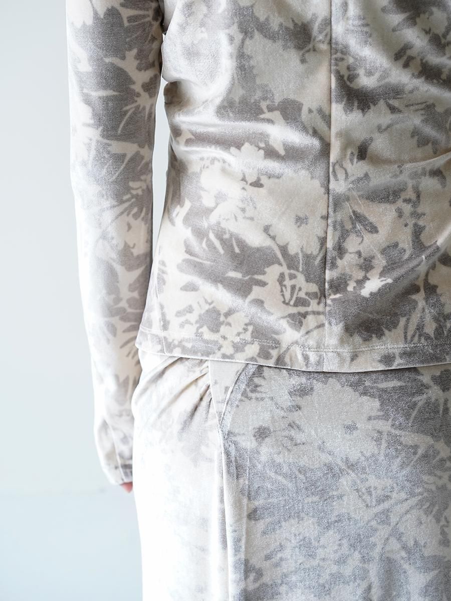 PHOTOCOPIEU(フォトコピュー)から、ベルベット生地に裏側からガーベラのカモフラージュをプリントした生地を使用したアシンメトリートップスのご紹介です。ストリートの印象が強いカモフラージュを落とし込んだ新鮮なバランスのアイテム。程よい光沢感でエレガンスな雰囲気も演出します。アシンメトリーに寄せられたギャザーが、立体感のある美しいシルエット。伸縮性にも優れた素材感で、リラクシングな着心地を実現します。バックにはコンシールファスナーを使用し、すっきりとした仕上がりに。スムーズに着脱が可能で上品さと実用性を兼ね備えた一枚です。同素材のスカートとセットアップのスタイリングもおすすめです。