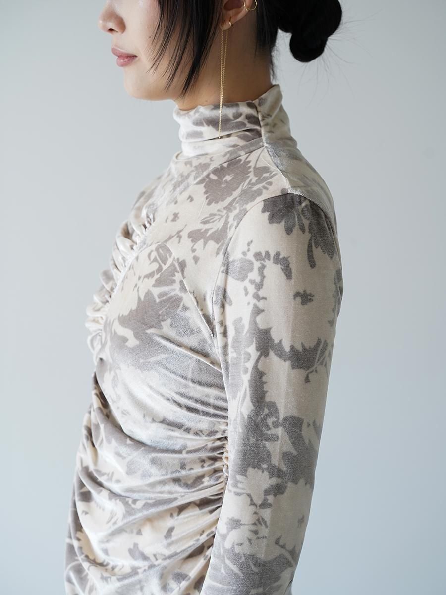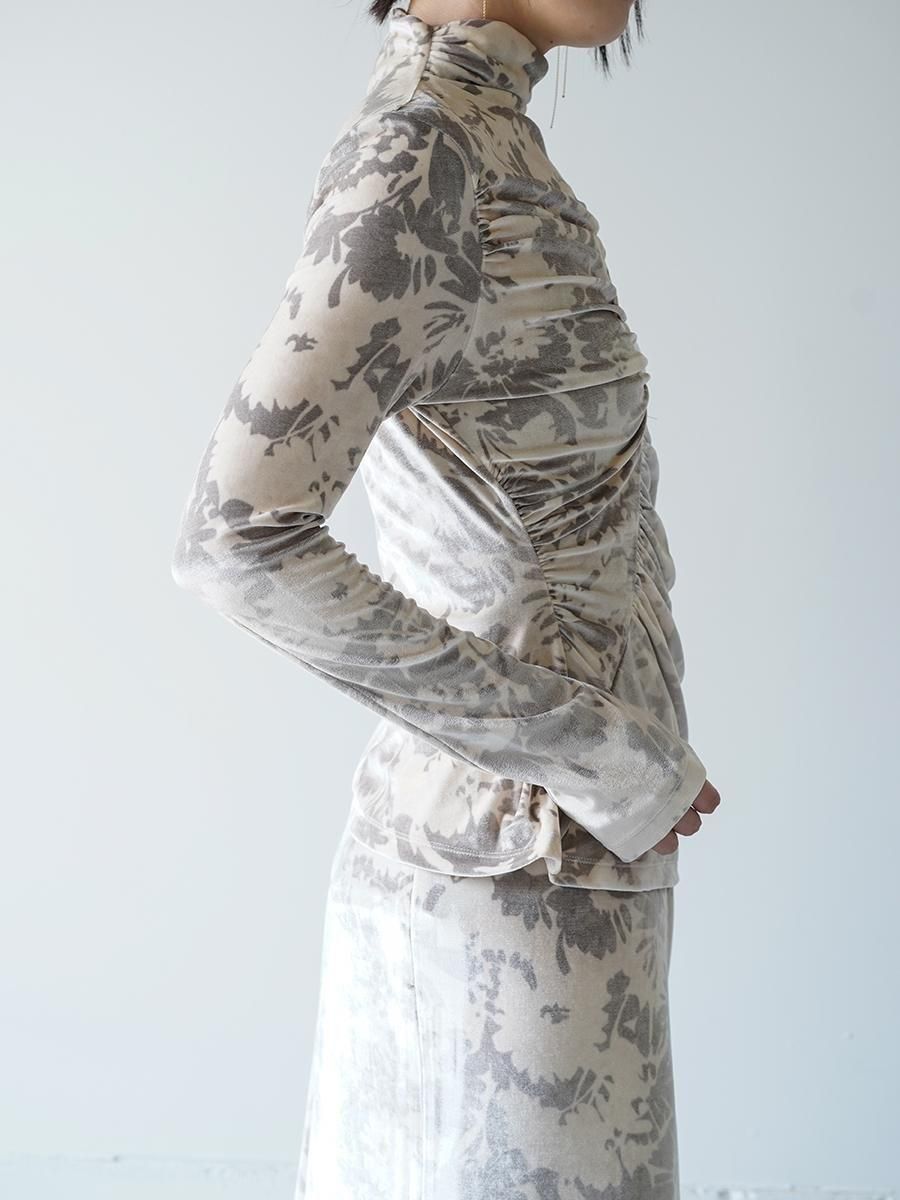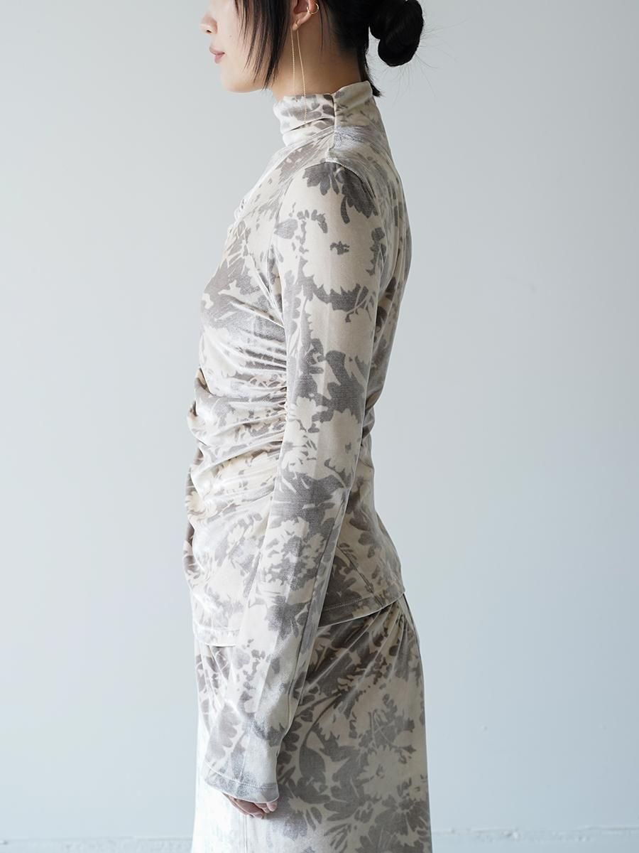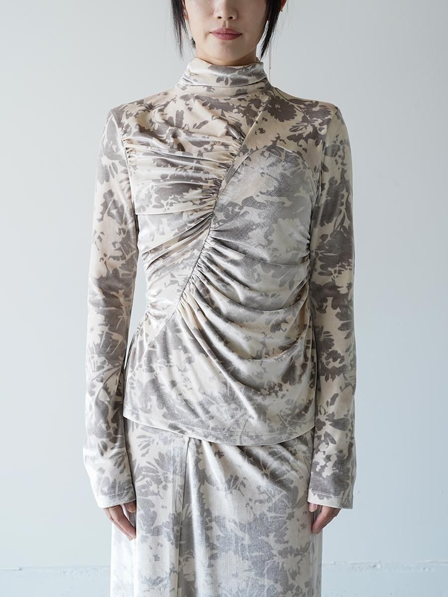 PHOTOCOPIEU(フォトコピュー)から、ベルベット生地に裏側からガーベラのカモフラージュをプリントした生地を使用したアシンメトリートップスのご紹介です。ストリートの印象が強いカモフラージュを落とし込んだ新鮮なバランスのアイテム。程よい光沢感でエレガンスな雰囲気も演出します。アシンメトリーに寄せられたギャザーが、立体感のある美しいシルエット。伸縮性にも優れた素材感で、リラクシングな着心地を実現します。バックにはコンシールファスナーを使用し、すっきりとした仕上がりに。スムーズに着脱が可能で上品さと実用性を兼ね備えた一枚です。同素材のスカートとセットアップのスタイリングもおすすめです。