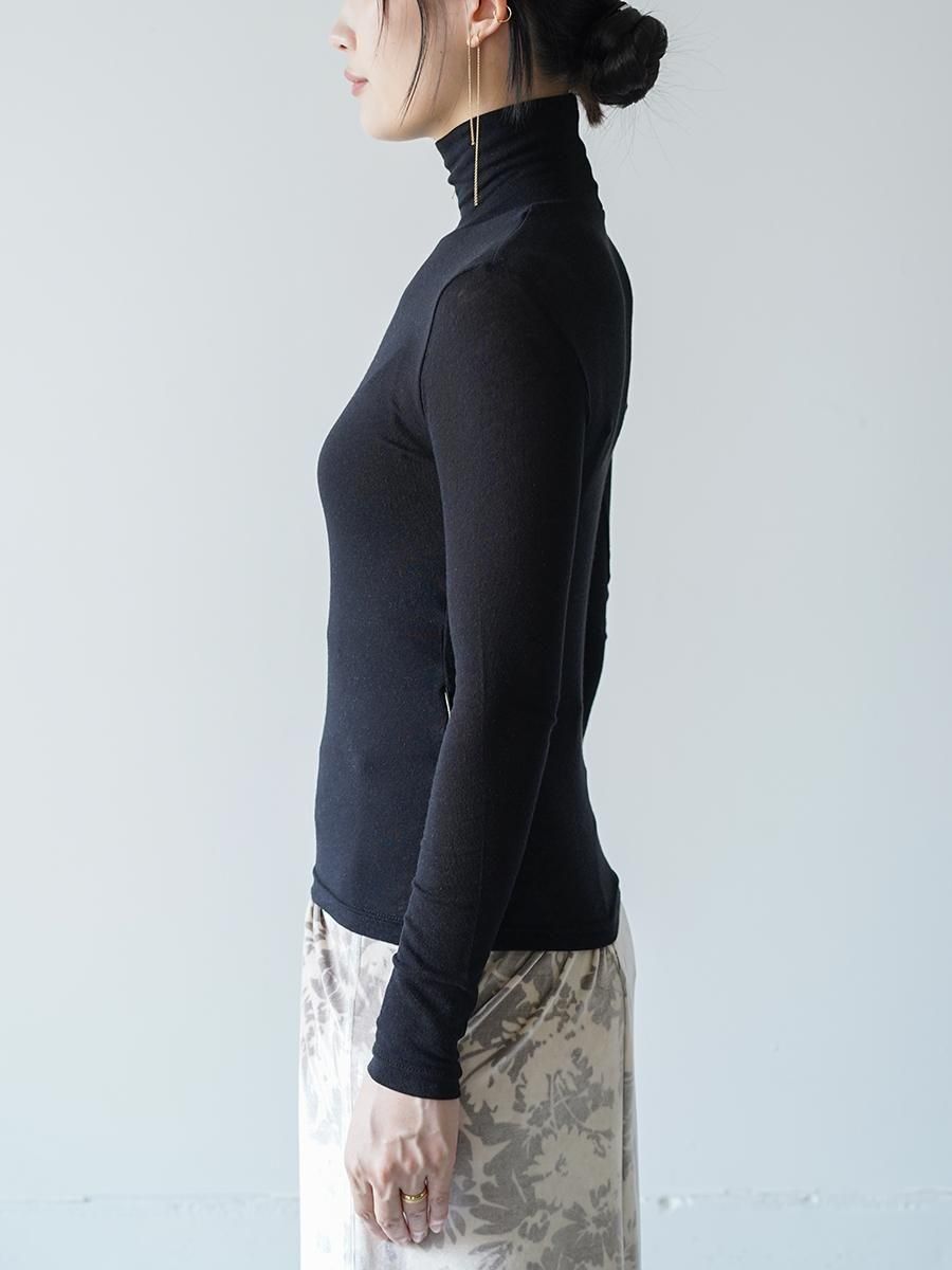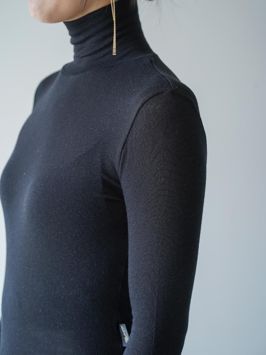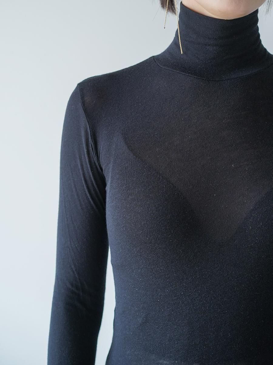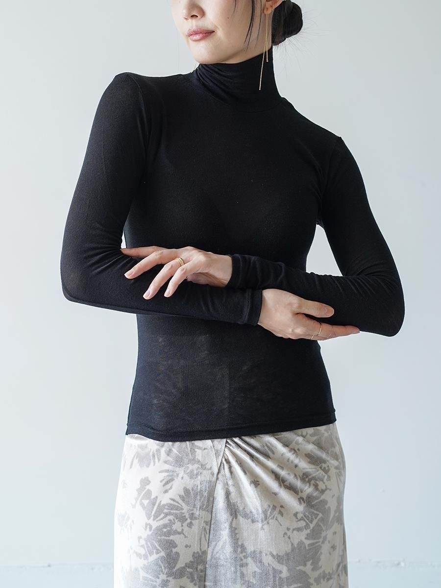 PHOTOCOPIEU(フォトコピュー)から、シルク混のベア天を使用したハイネックインナーのご紹介です。ポリウレタンを含むことで、優れたストレッチ性を持たせ、タイトなシルエットでありながらも快適な着心地を実現した一枚。もっちりとした肌あたりで、体に心地よく寄り添いながら、動きやすさも持ち合わせているのも魅力です。ほんのりと透ける質感が軽やかさを引き立て、上品で洗練された印象を演出します。一枚での着用はもちろん、インナーとして様々なアイテムとレイヤードするのに活躍する万能アイテムです。