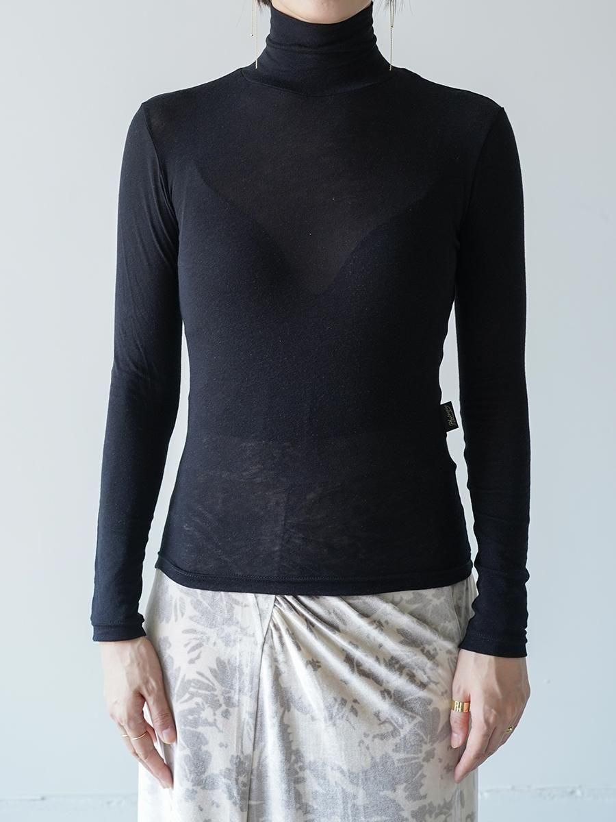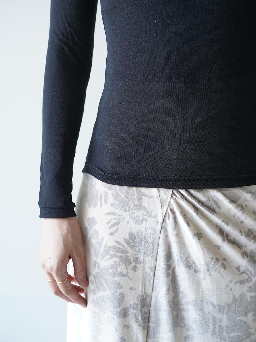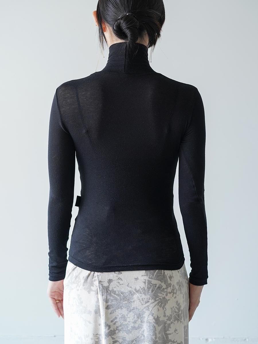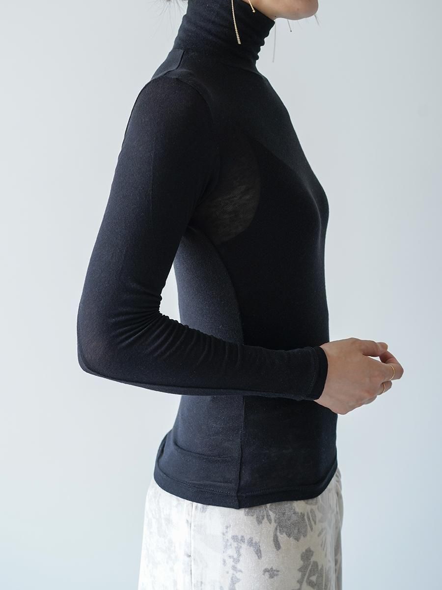 PHOTOCOPIEU(フォトコピュー)から、シルク混のベア天を使用したハイネックインナーのご紹介です。ポリウレタンを含むことで、優れたストレッチ性を持たせ、タイトなシルエットでありながらも快適な着心地を実現した一枚。もっちりとした肌あたりで、体に心地よく寄り添いながら、動きやすさも持ち合わせているのも魅力です。ほんのりと透ける質感が軽やかさを引き立て、上品で洗練された印象を演出します。一枚での着用はもちろん、インナーとして様々なアイテムとレイヤードするのに活躍する万能アイテムです。