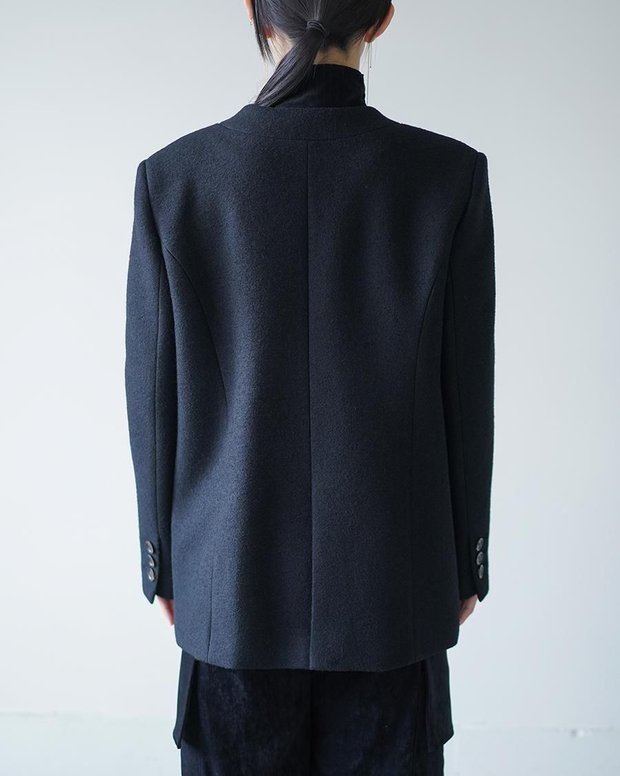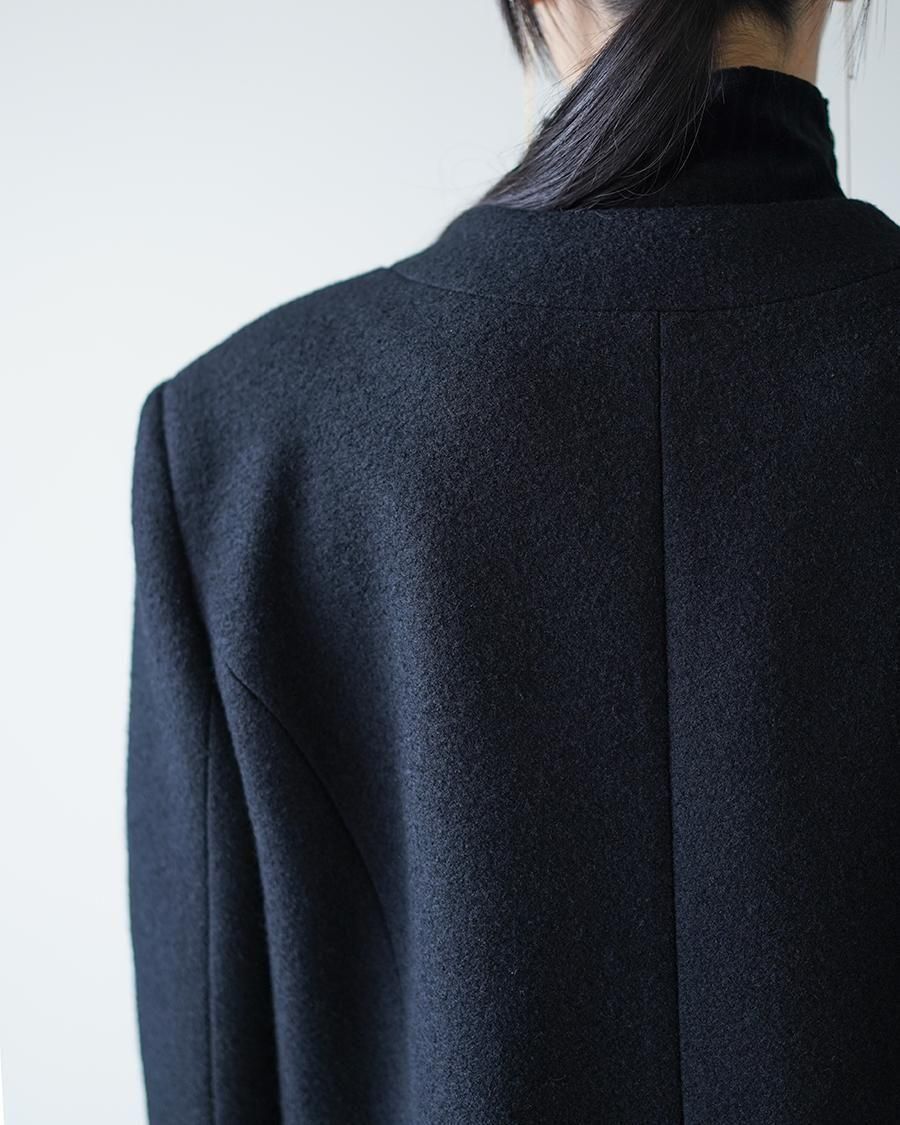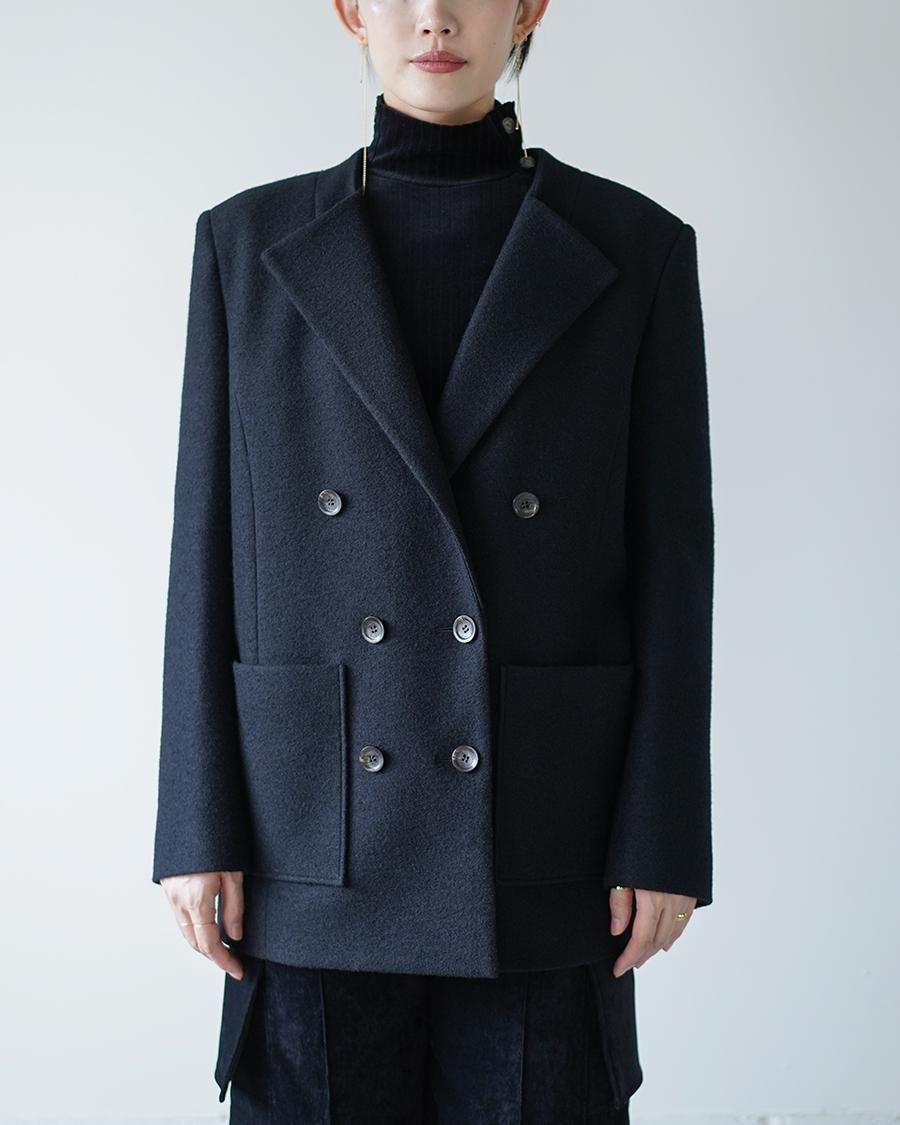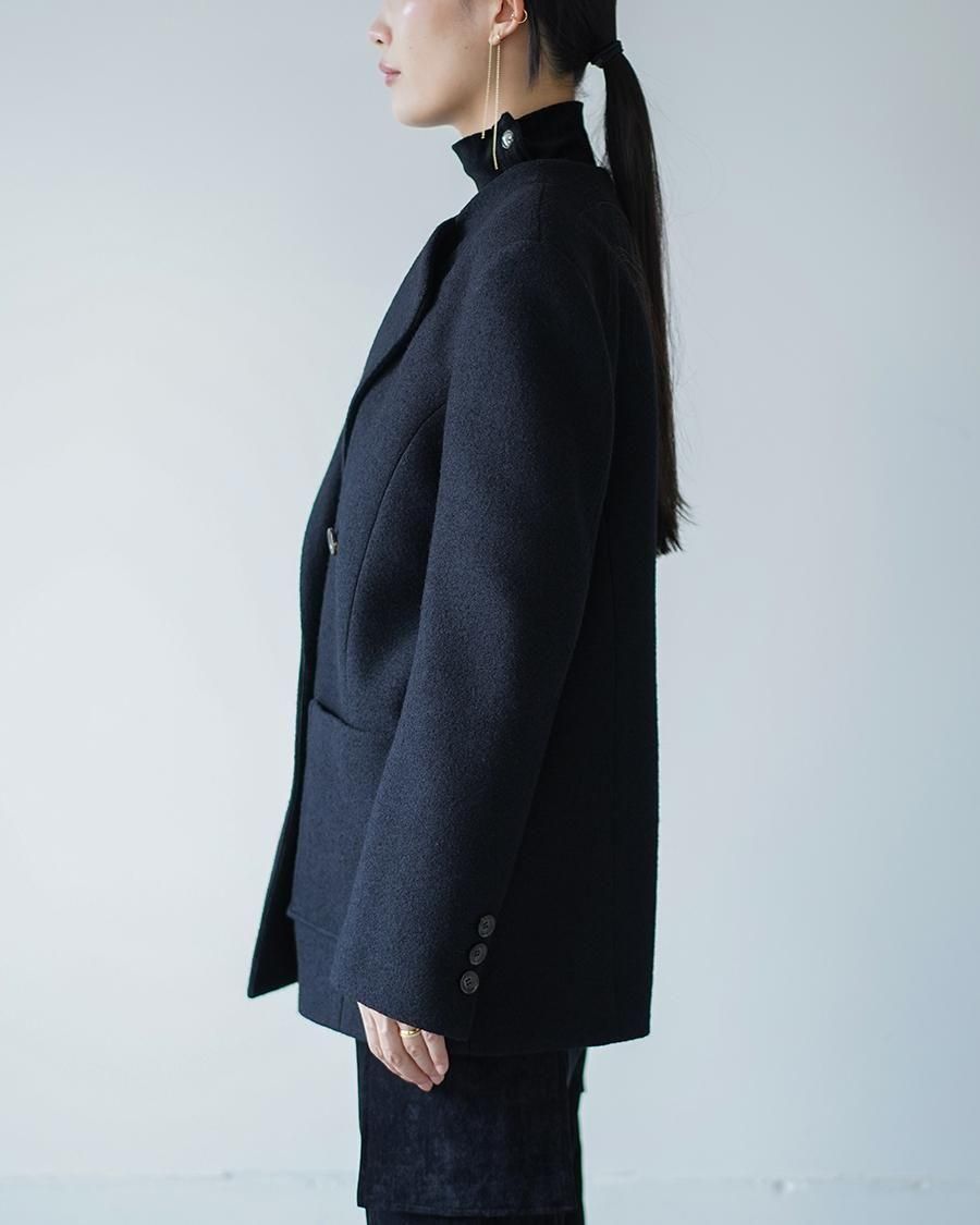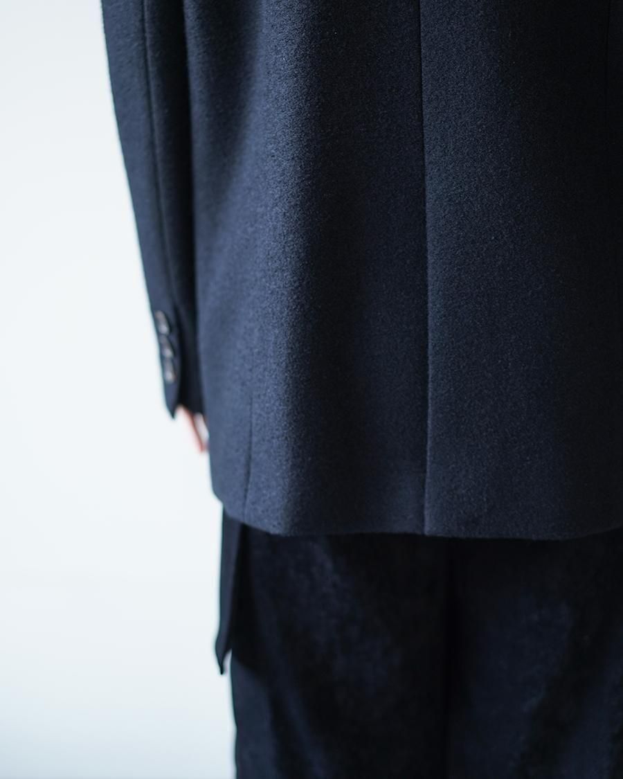 一見ミニマルなダブルブレストのテーラードジャケットでありながら、ラペルのバランスやボディのシルエットにAKIRANAKAらしい個性を宿しており、得意とするカッティング技術を十分に感じられる一着として完成しました。素材に採用した独特な質感を持つ梨地ブークレーは、体を包み込むような柔らかな風合いで洗練された大人の気負わないムードを演出します。