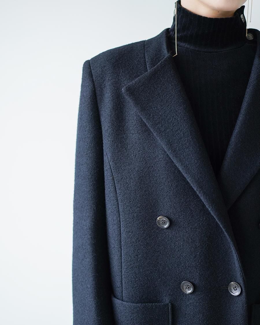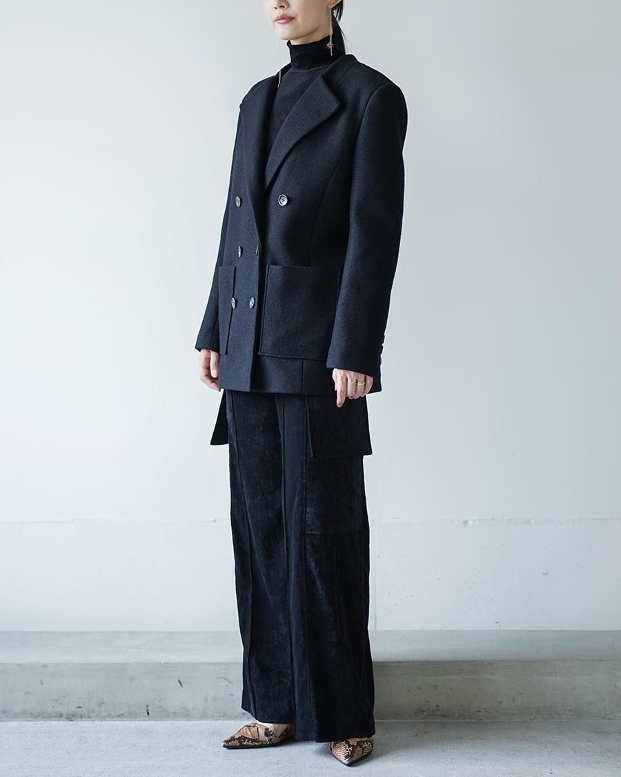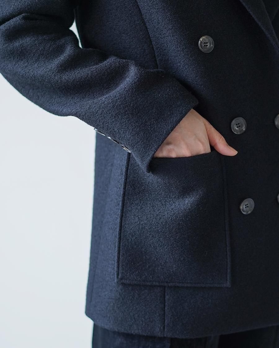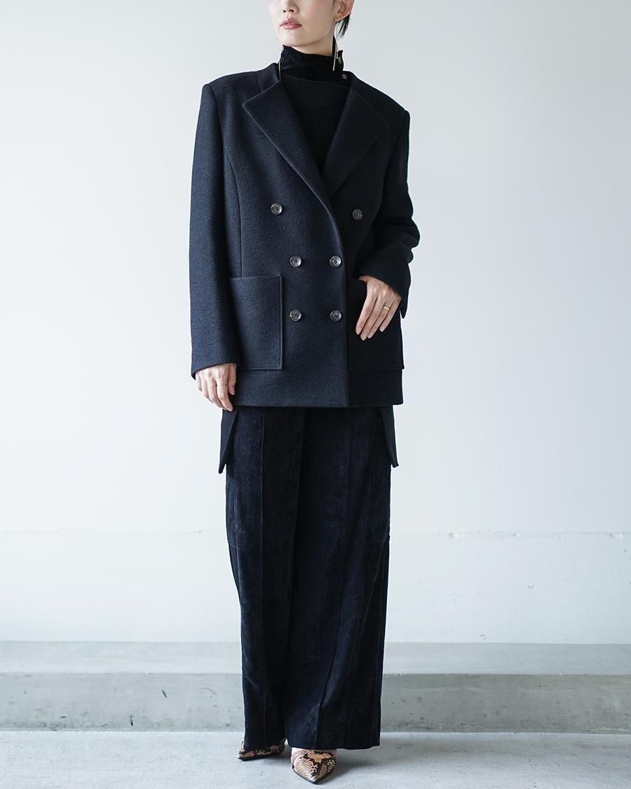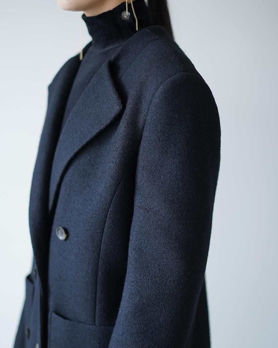 一見ミニマルなダブルブレストのテーラードジャケットでありながら、ラペルのバランスやボディのシルエットにAKIRANAKAらしい個性を宿しており、得意とするカッティング技術を十分に感じられる一着として完成しました。素材に採用した独特な質感を持つ梨地ブークレーは、体を包み込むような柔らかな風合いで洗練された大人の気負わないムードを演出します。