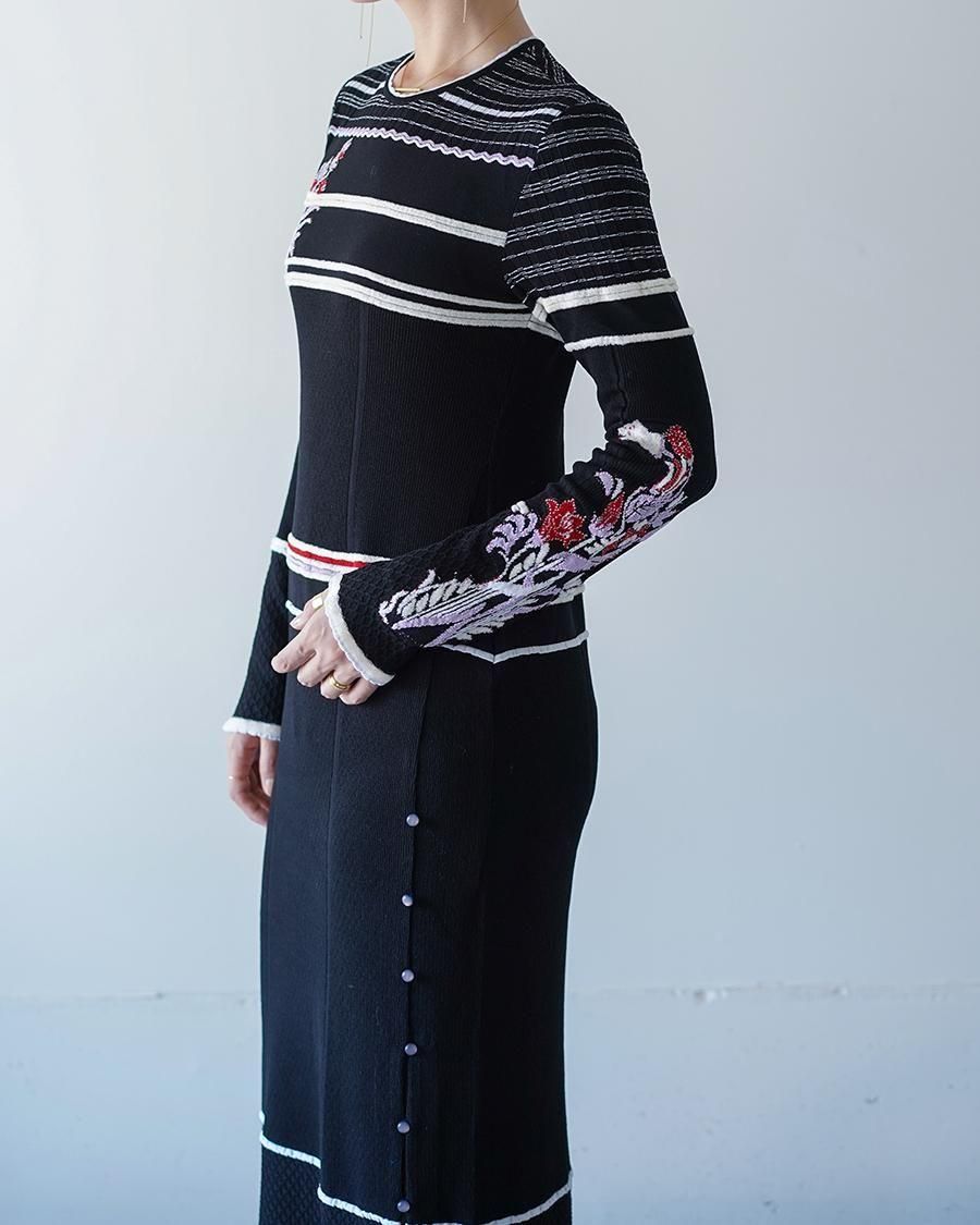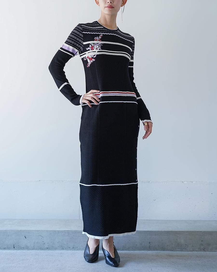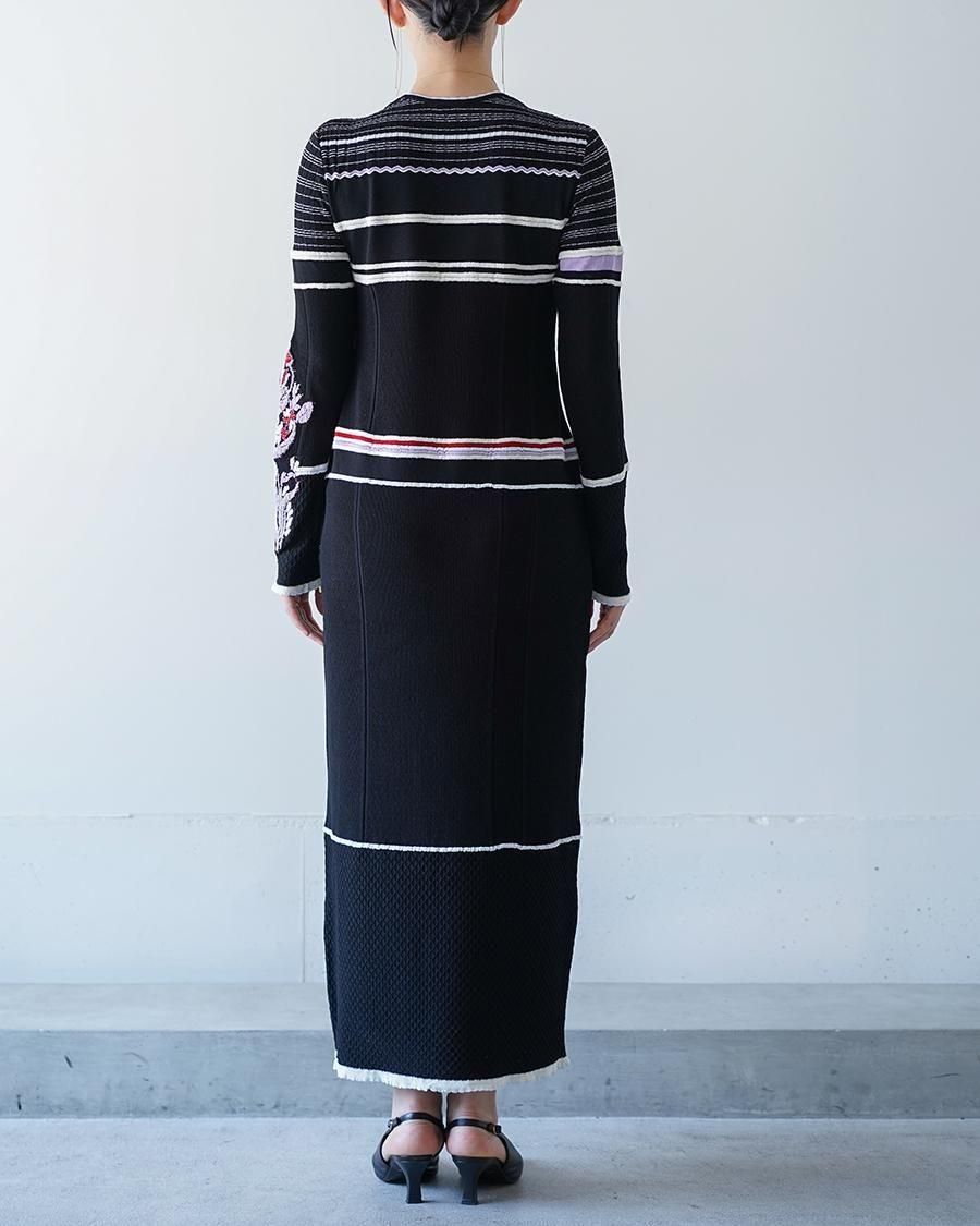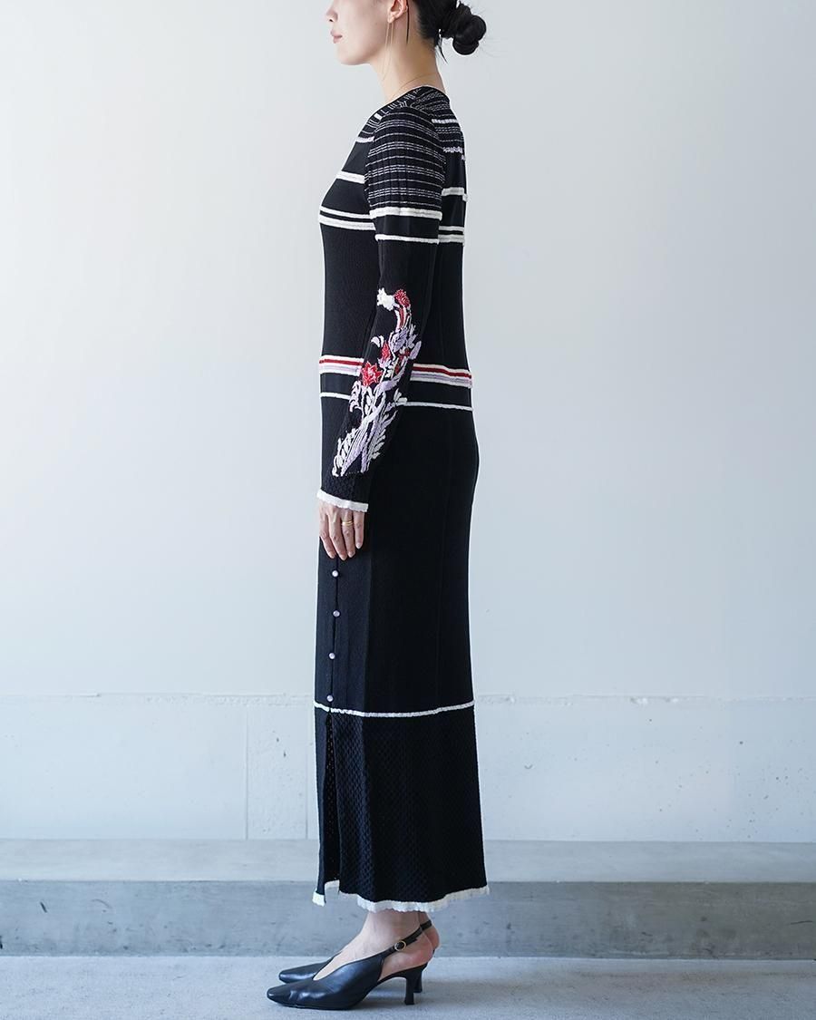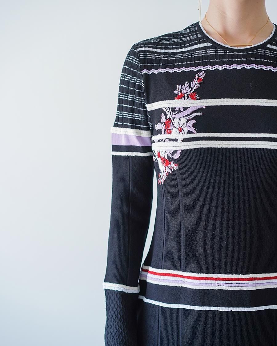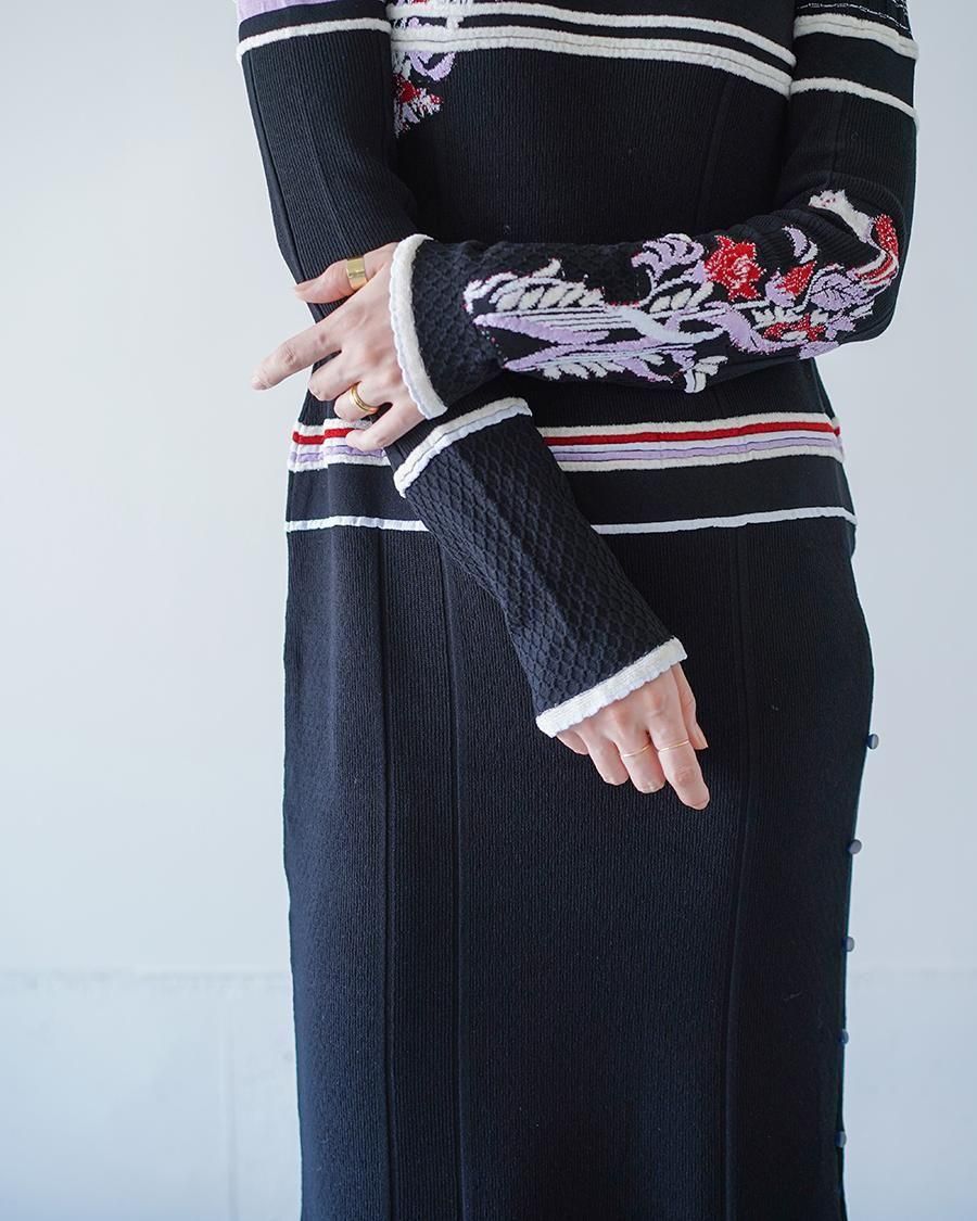 MameKurogouchi(マメクロゴウチ)から、花柄モチーフが浮かび上がる、ピンタック仕立てのすっきりとしたシルエットのニットドレスのご紹介です。