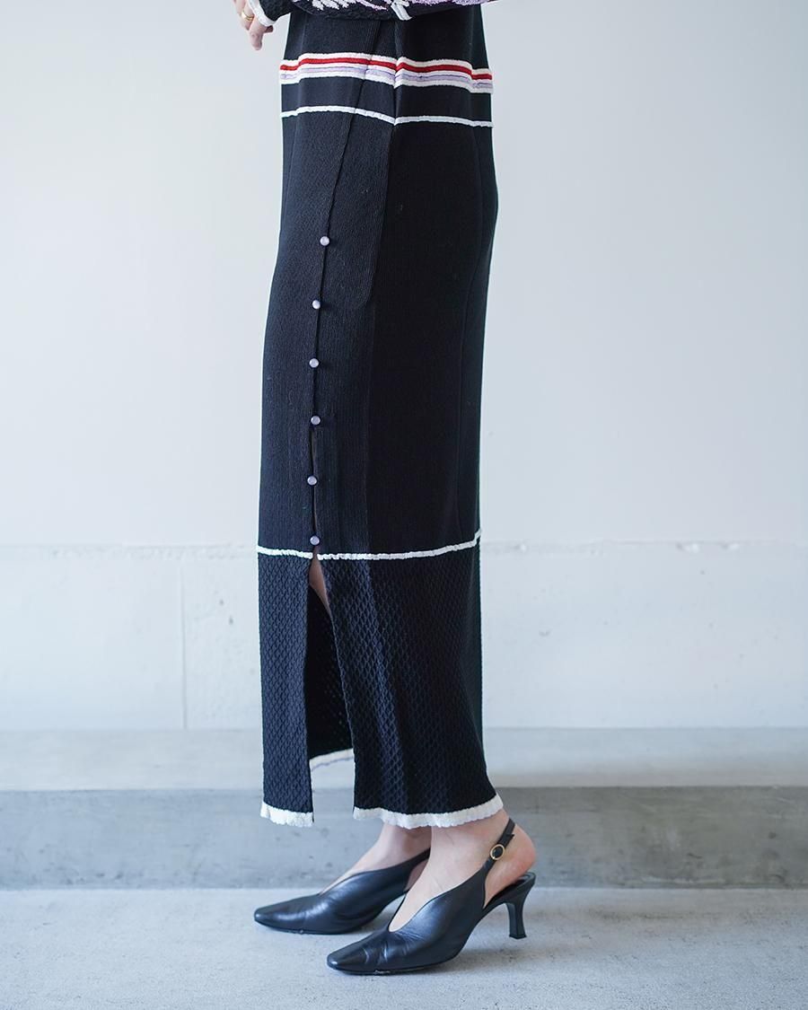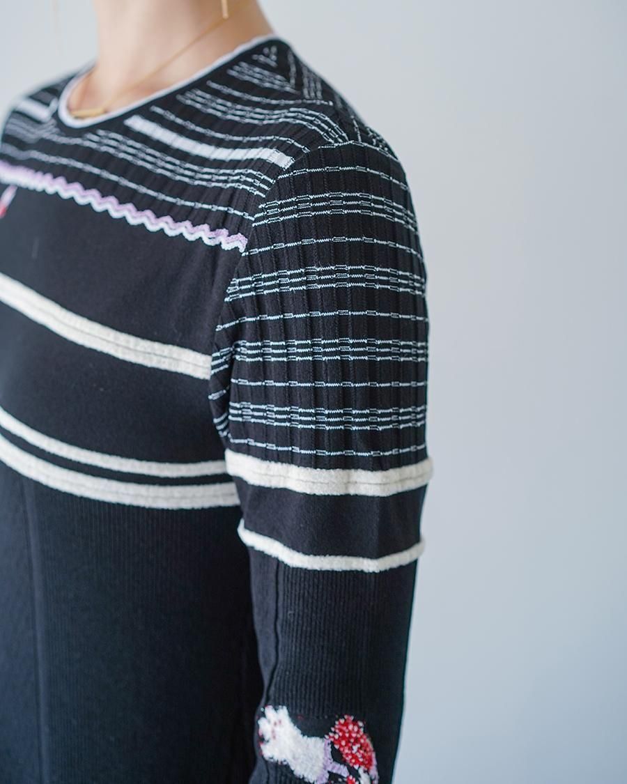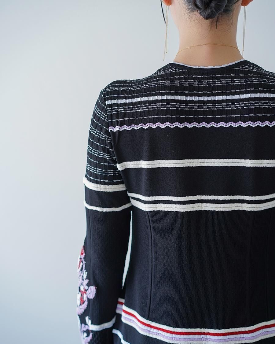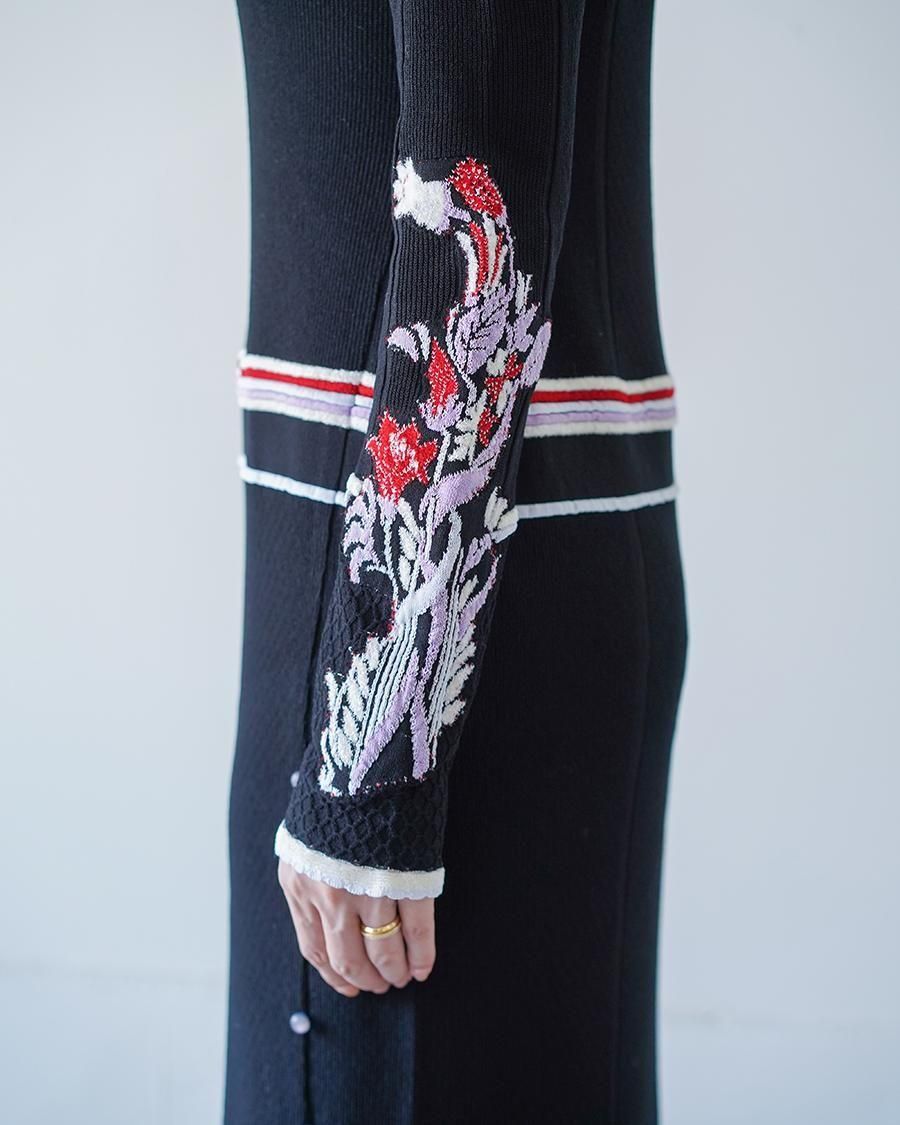 ハイストレッチ糸を使用し、ピンタックの内部に大胆な花柄がステッチのように現れるデザイン。柄部分には極細のモール糸など異素材を組み合わせ、テクスチャーに奥行きをもたせている。ピンタックの配色が上品さと華やかさを添え、裾のボタンの開閉によってスリットの位置調整が可能。ボトムスを重ねたレイヤードスタイルにも対応し、カジュアルからエレガントまで、幅広いスタイリングに寄り添う一着。