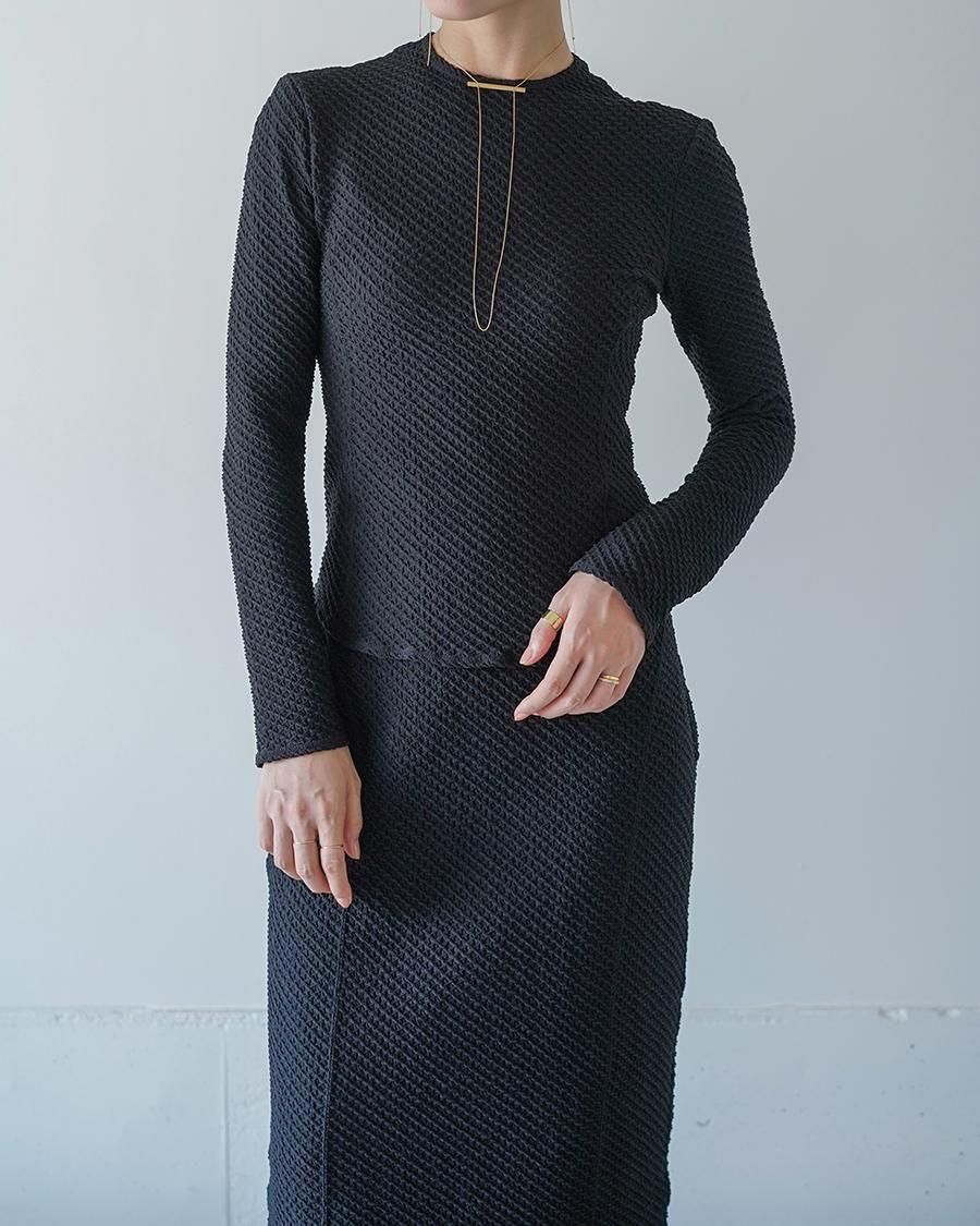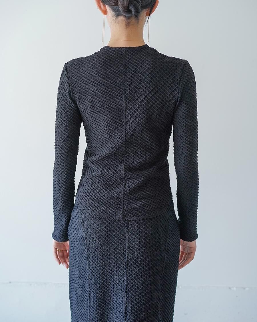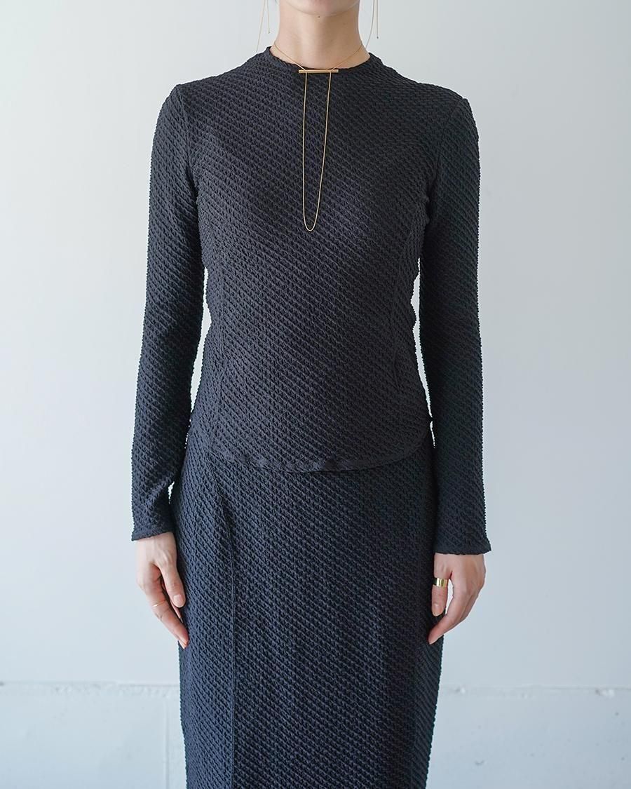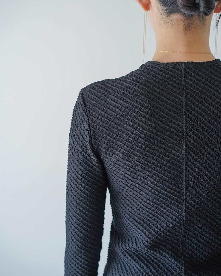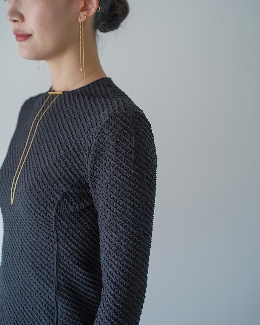 ポリウレタンをポリエステルでカバーリングした伸縮性のある糸で柄を編むことで、立体感のある表情に。コンパクトな身頃が特徴的なトップは、腕周りに優しくフィットする長袖のデザインが汎用性を高め、縫い代をステッチで抑えることによる、滑らかなフィッティングがカジュアルになりすぎない上品さを実現。1枚でトップスとしてもフィットするデザインはインナーとしても活躍する1着。
