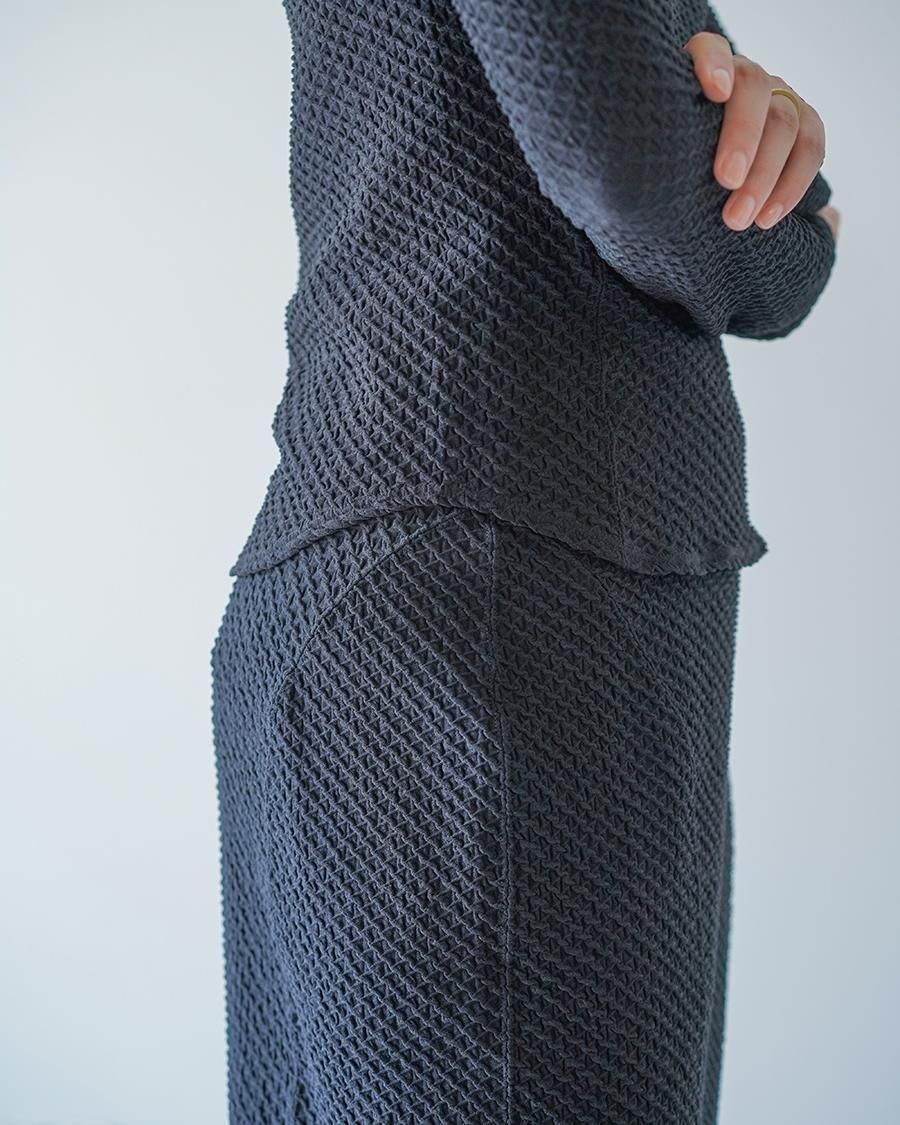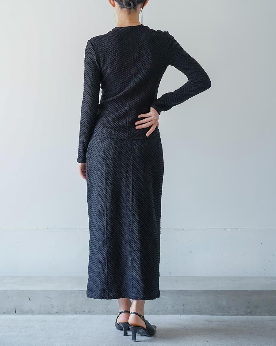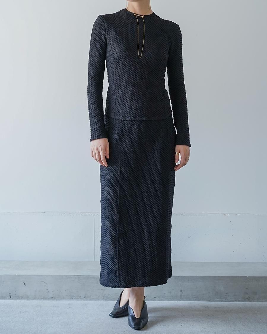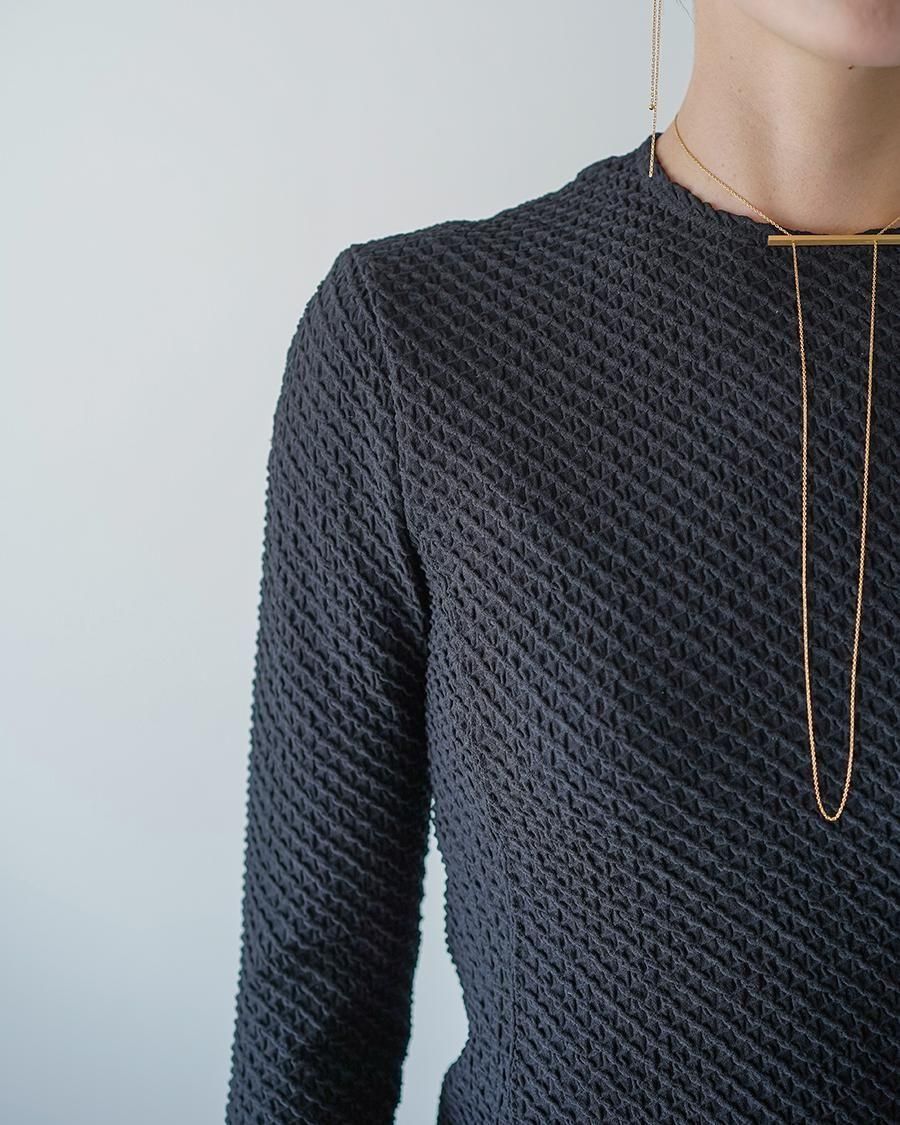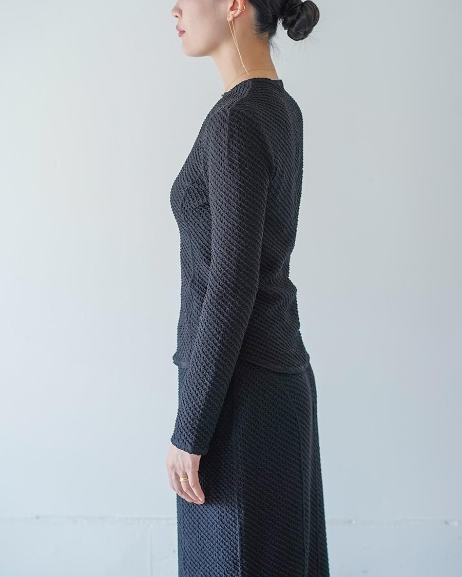 ポリウレタンをポリエステルでカバーリングした伸縮性のある糸で柄を編むことで、立体感のある表情に。コンパクトな身頃が特徴的なトップは、腕周りに優しくフィットする長袖のデザインが汎用性を高め、縫い代をステッチで抑えることによる、滑らかなフィッティングがカジュアルになりすぎない上品さを実現。1枚でトップスとしてもフィットするデザインはインナーとしても活躍する1着。