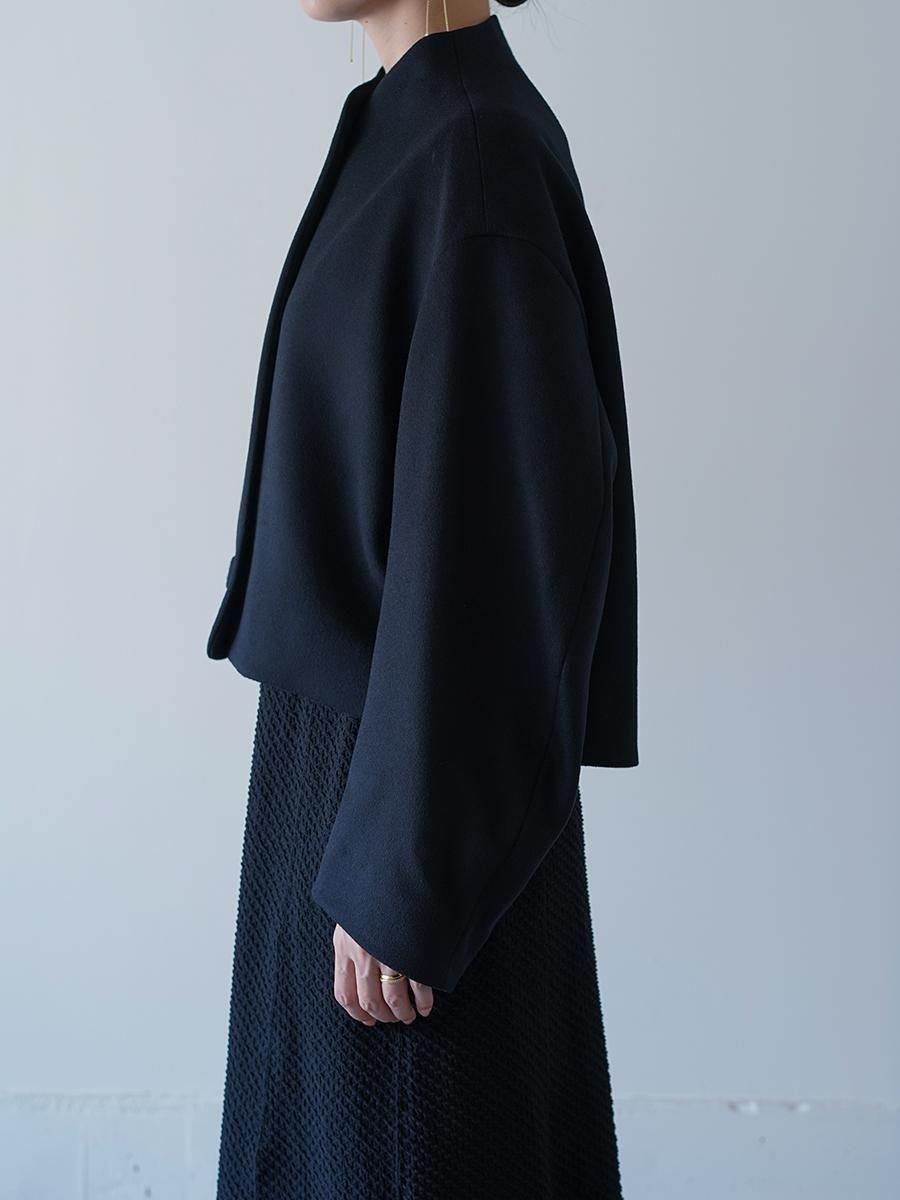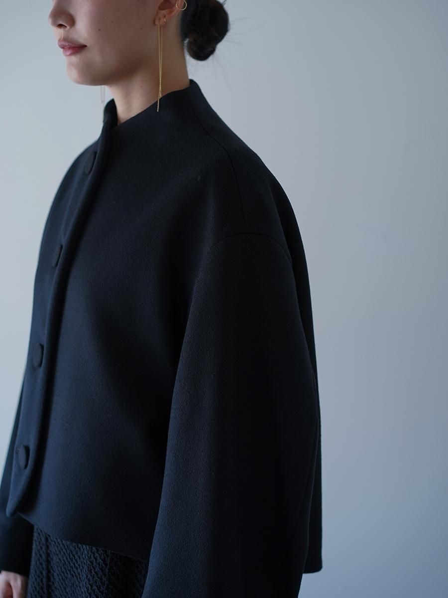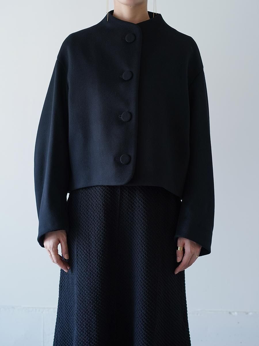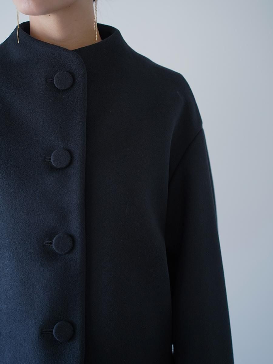 スーパー120S繊度の原料を使⽤することで、軽くしなやかな肌触りとなめらかでぬめり感のある素材に。メルトンとしては⽐較的薄めの⾁感で、しっかりと防寒もしながら温かく重すぎないコートは、丸みのある袖と、⾸元を優しく包み込む曲線の襟とブランドらしいディテールが随所に詰まった1着に。短い着丈でバランスがとりやすくドレスやハイウエストのボトムとあわせることで、幅広いスタイルにフィットする。