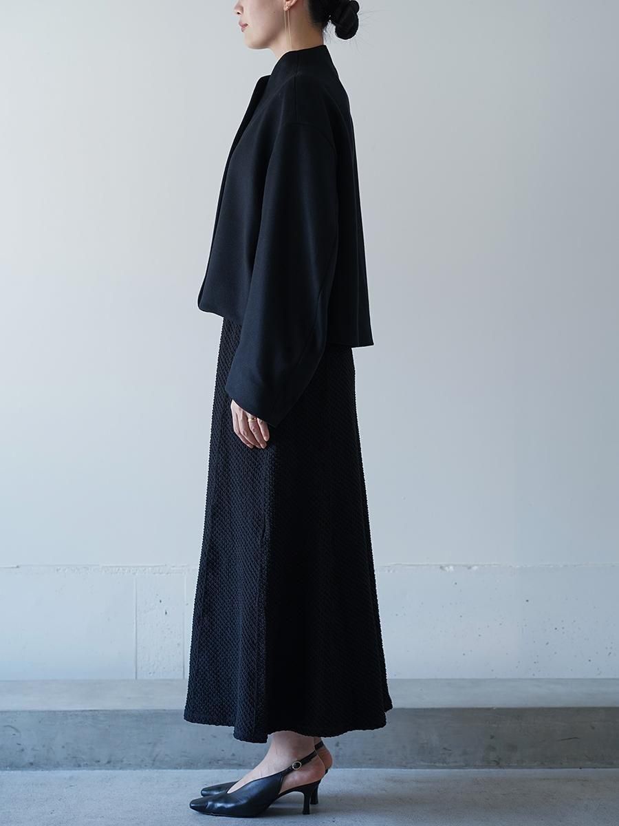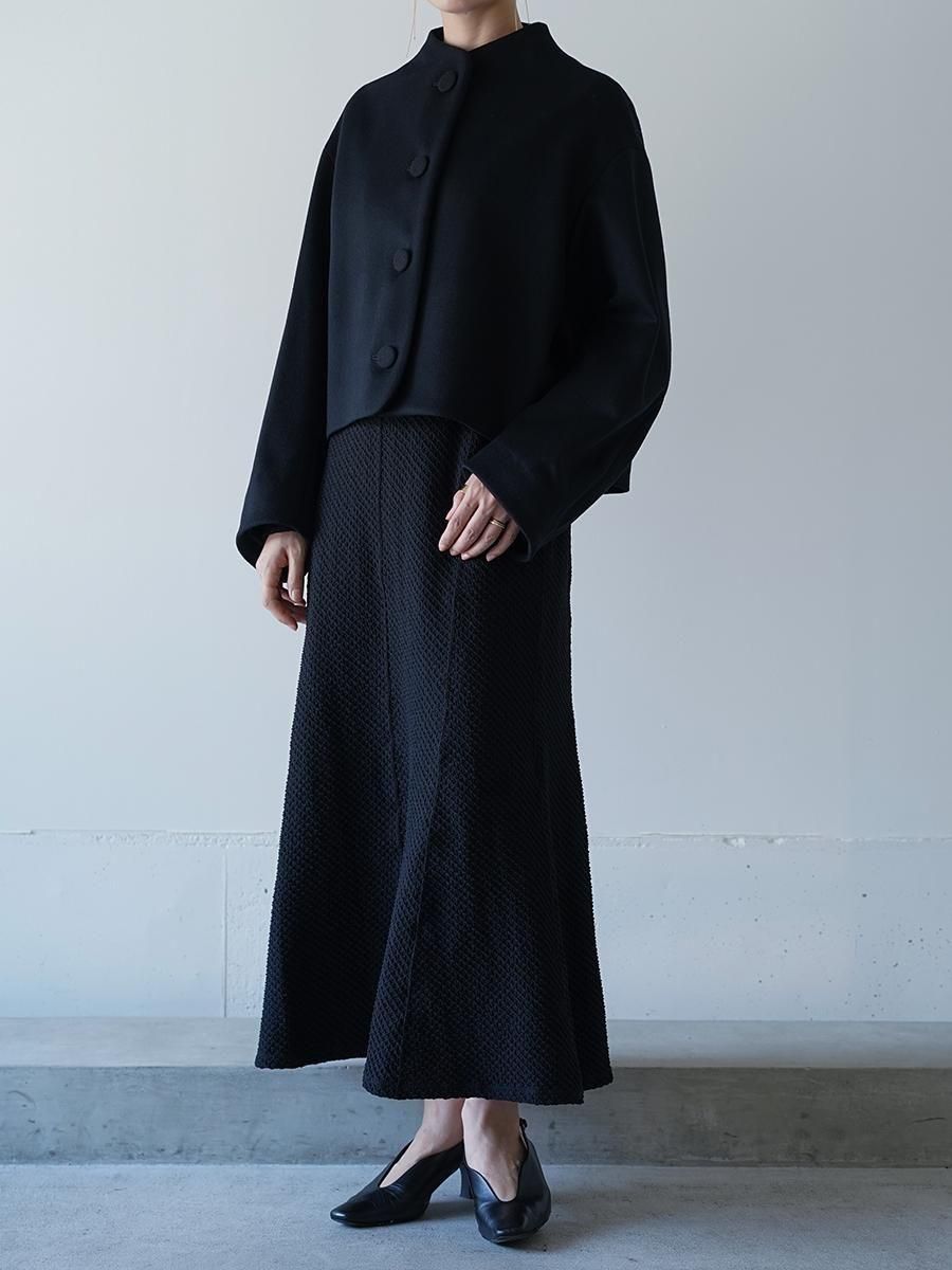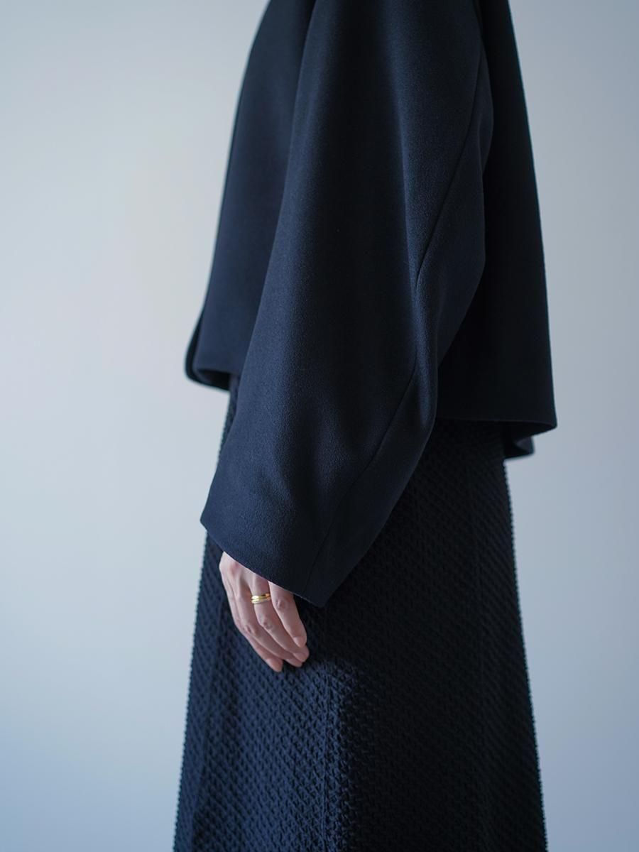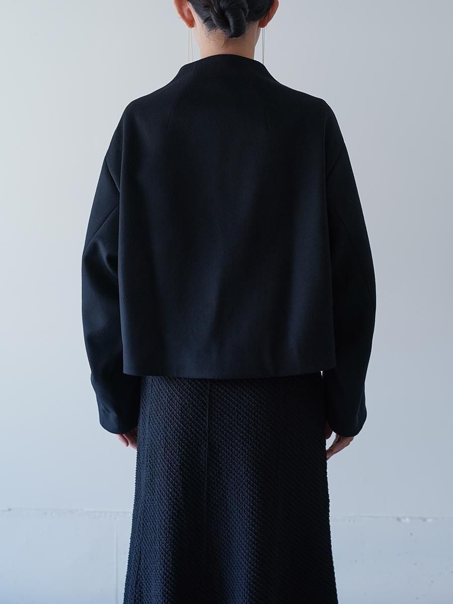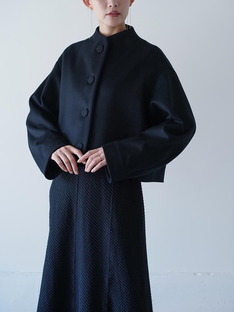 スーパー120S繊度の原料を使⽤することで、軽くしなやかな肌触りとなめらかでぬめり感のある素材に。メルトンとしては⽐較的薄めの⾁感で、しっかりと防寒もしながら温かく重すぎないコートは、丸みのある袖と、⾸元を優しく包み込む曲線の襟とブランドらしいディテールが随所に詰まった1着に。短い着丈でバランスがとりやすくドレスやハイウエストのボトムとあわせることで、幅広いスタイルにフィットする。