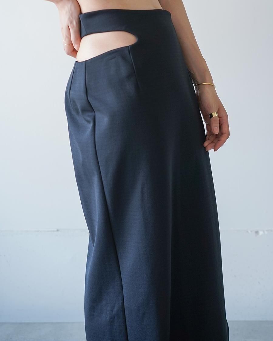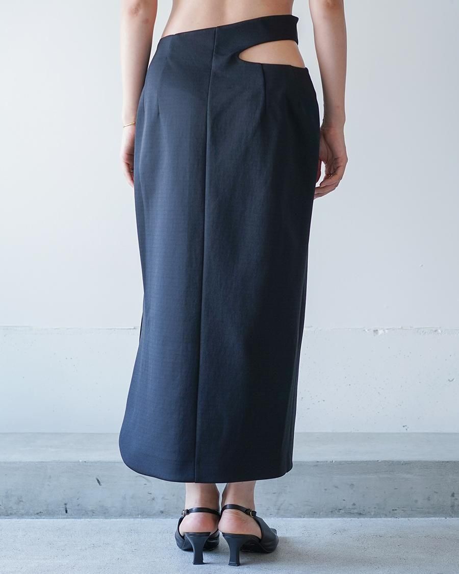柔らかくしなやかな生地に仕上げ、肌に触れる裏面にはコットンを配することで、カジュアルながらも柔らかで快適な着心地を叶えた。適度な光沢感とアシンメトリーなカッティングが上品なスカートは、ウエストに配された丸みを帯びた大胆なカッティングがセンシュアルかつプレイフルなスタイリングを可能にする。同素材のビスチェとセットアップで着用することで、オケージョンにもデイリーにも幅広いシーンで活躍する1着に。