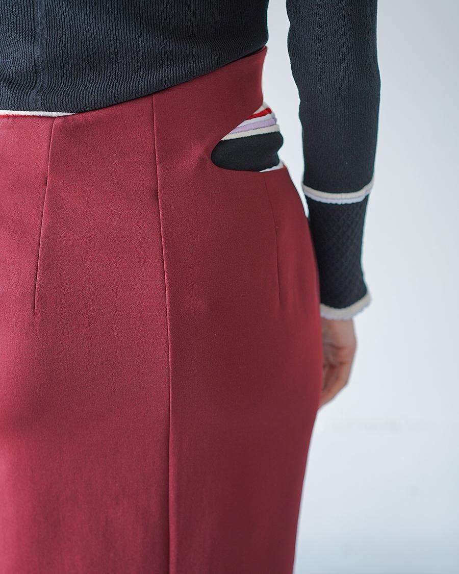 柔らかくしなやかな生地に仕上げ、肌に触れる裏面にはコットンを配することで、カジュアルながらも柔らかで快適な着心地を叶えた。適度な光沢感とアシンメトリーなカッティングが上品なスカートは、ウエストに配された丸みを帯びた大胆なカッティングがセンシュアルかつプレイフルなスタイリングを可能にする。同素材のビスチェとセットアップで着用することで、オケージョンにもデイリーにも幅広いシーンで活躍する1着に。