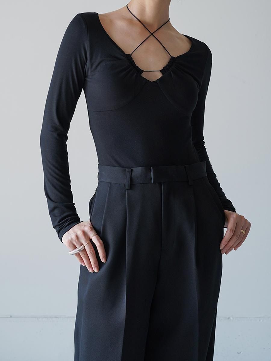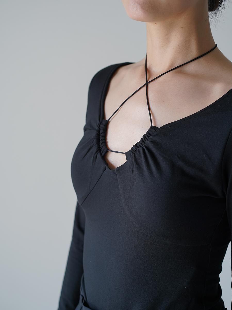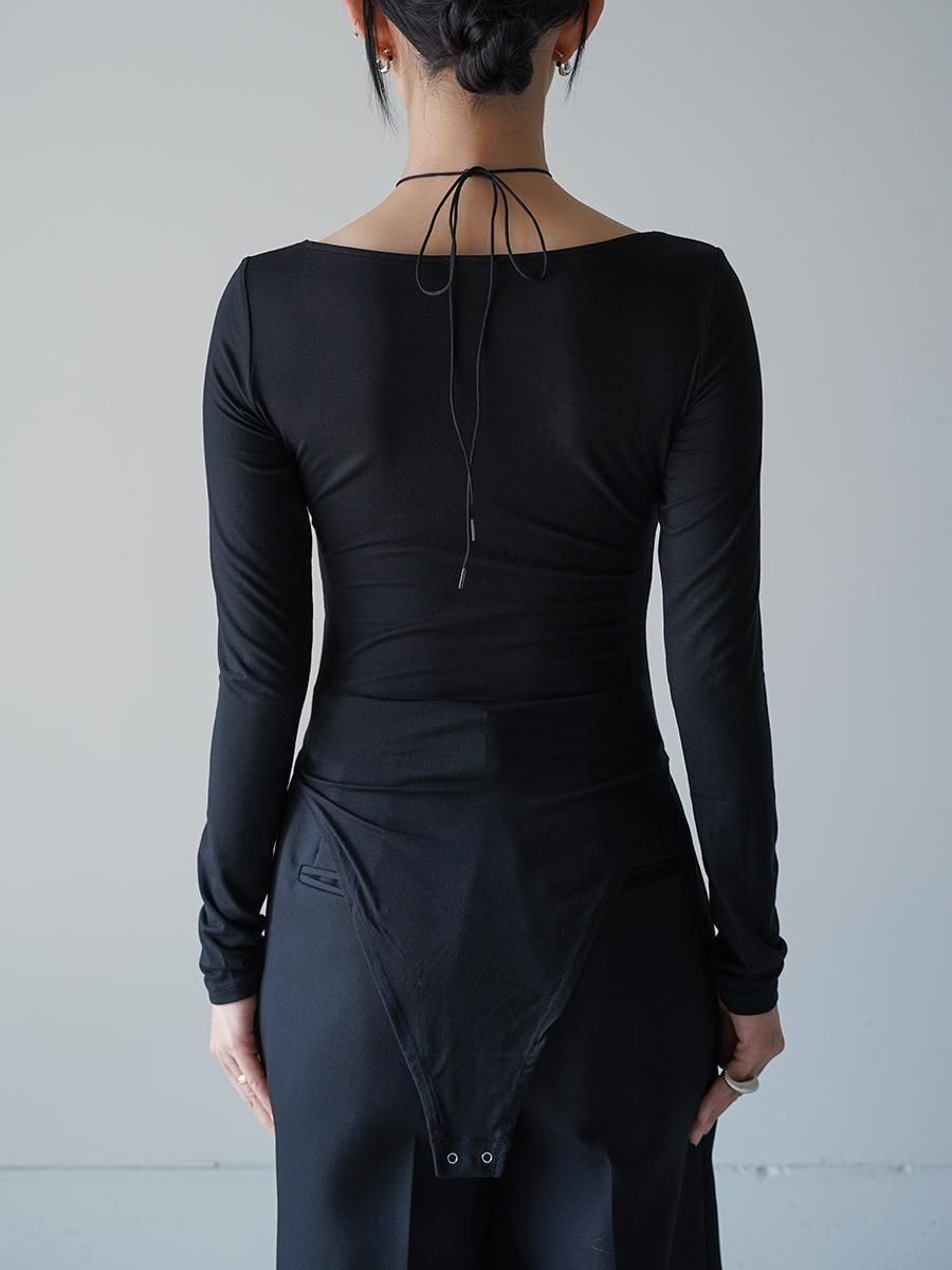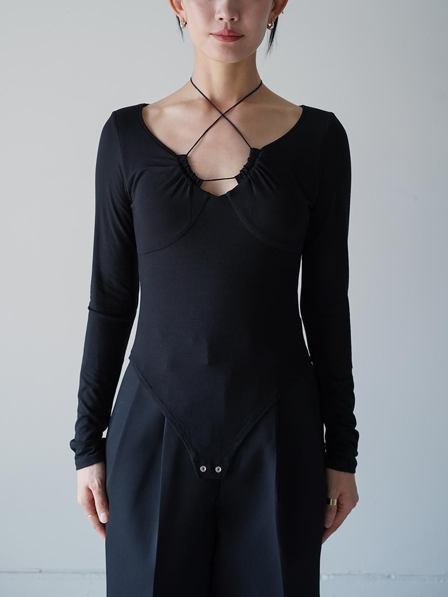 determ;(デターム)から、コラーゲンを含んだ生地でデザインしたボディースーツのご紹介です。ブランドの特徴である魚鱗由来のコラーゲンを含んだ生地は、他にはないしっとりとした肌触りが魅力。高い保湿性や通気性に加え、消臭性・UVカット効果・抗菌性といった機能性も備えた一枚です。バスト部分にはカップが付いており一枚で着用が可能。首元にデザインされたスパゲティーストラップは、クロスさせたり、そのまま首の後ろで結んだりと、結び方のアレンジで様々な雰囲気に変化します。一枚ではもちろん、ジャケットなどのインナーとしてなど幅広く活躍するアイテムです。