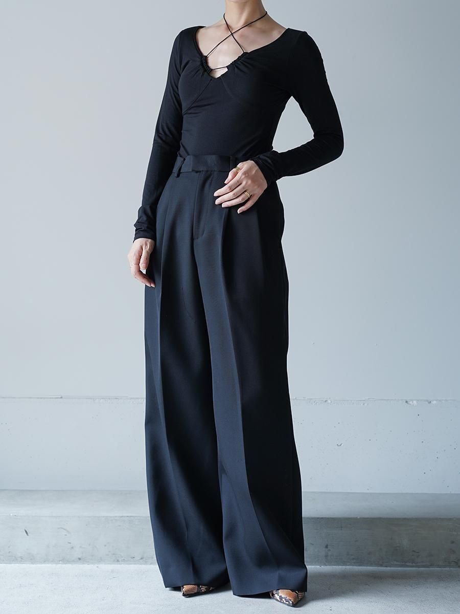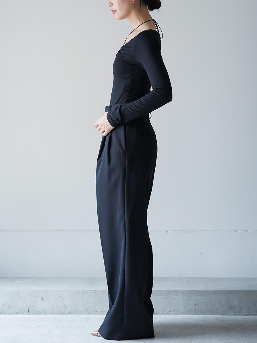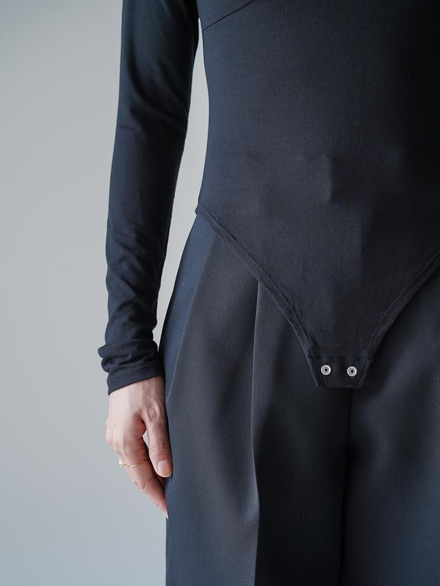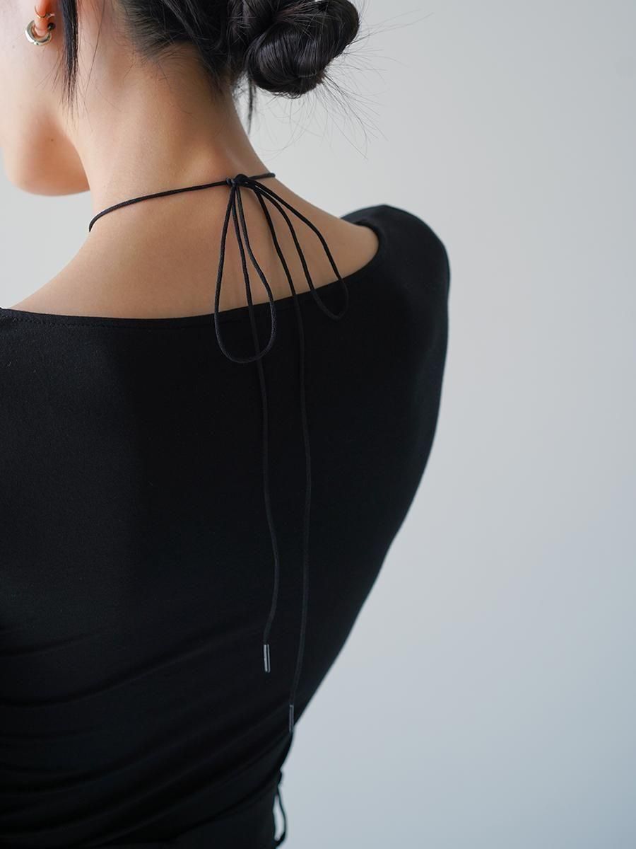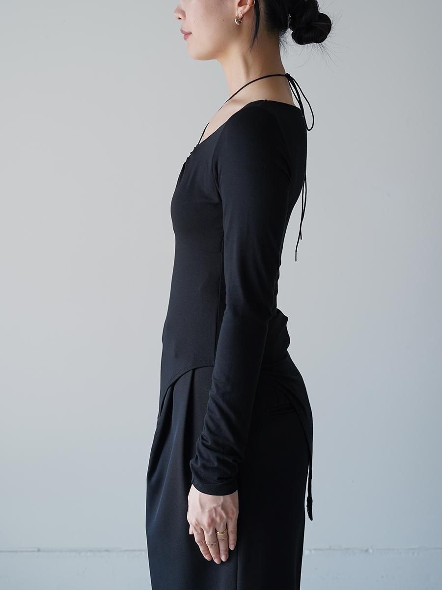 determ;(デターム)から、コラーゲンを含んだ生地でデザインしたボディースーツのご紹介です。ブランドの特徴である魚鱗由来のコラーゲンを含んだ生地は、他にはないしっとりとした肌触りが魅力。高い保湿性や通気性に加え、消臭性・UVカット効果・抗菌性といった機能性も備えた一枚です。バスト部分にはカップが付いており一枚で着用が可能。首元にデザインされたスパゲティーストラップは、クロスさせたり、そのまま首の後ろで結んだりと、結び方のアレンジで様々な雰囲気に変化します。一枚ではもちろん、ジャケットなどのインナーとしてなど幅広く活躍するアイテムです。