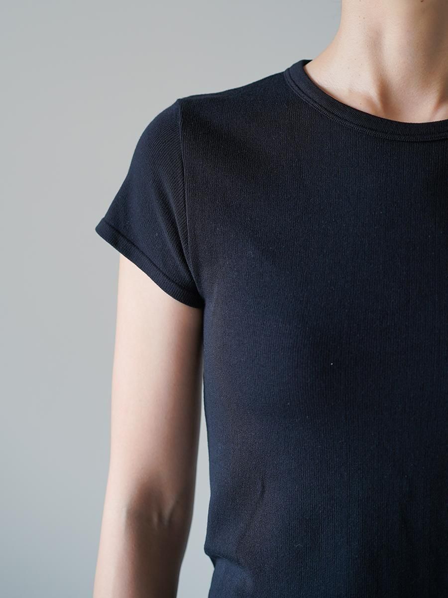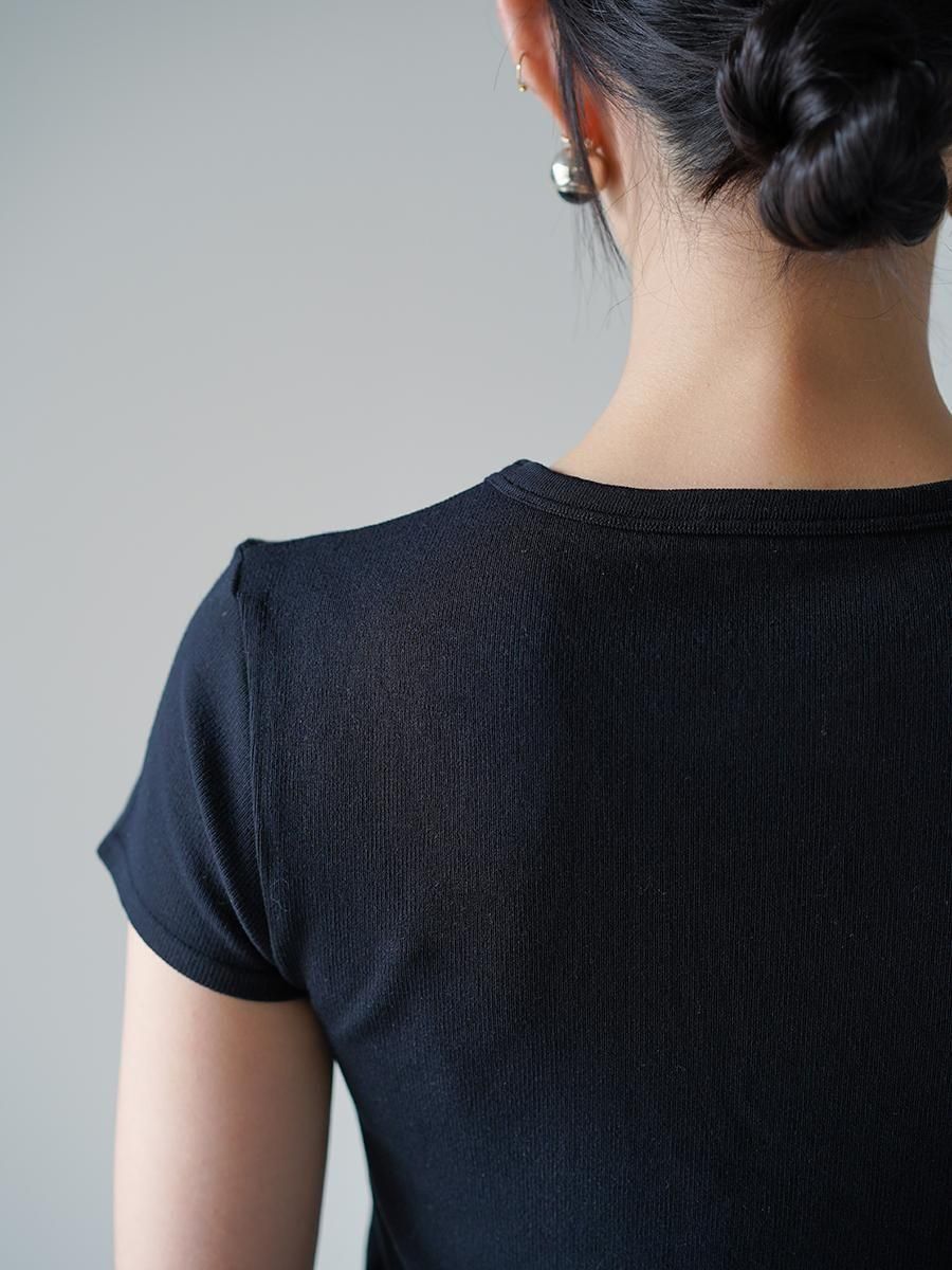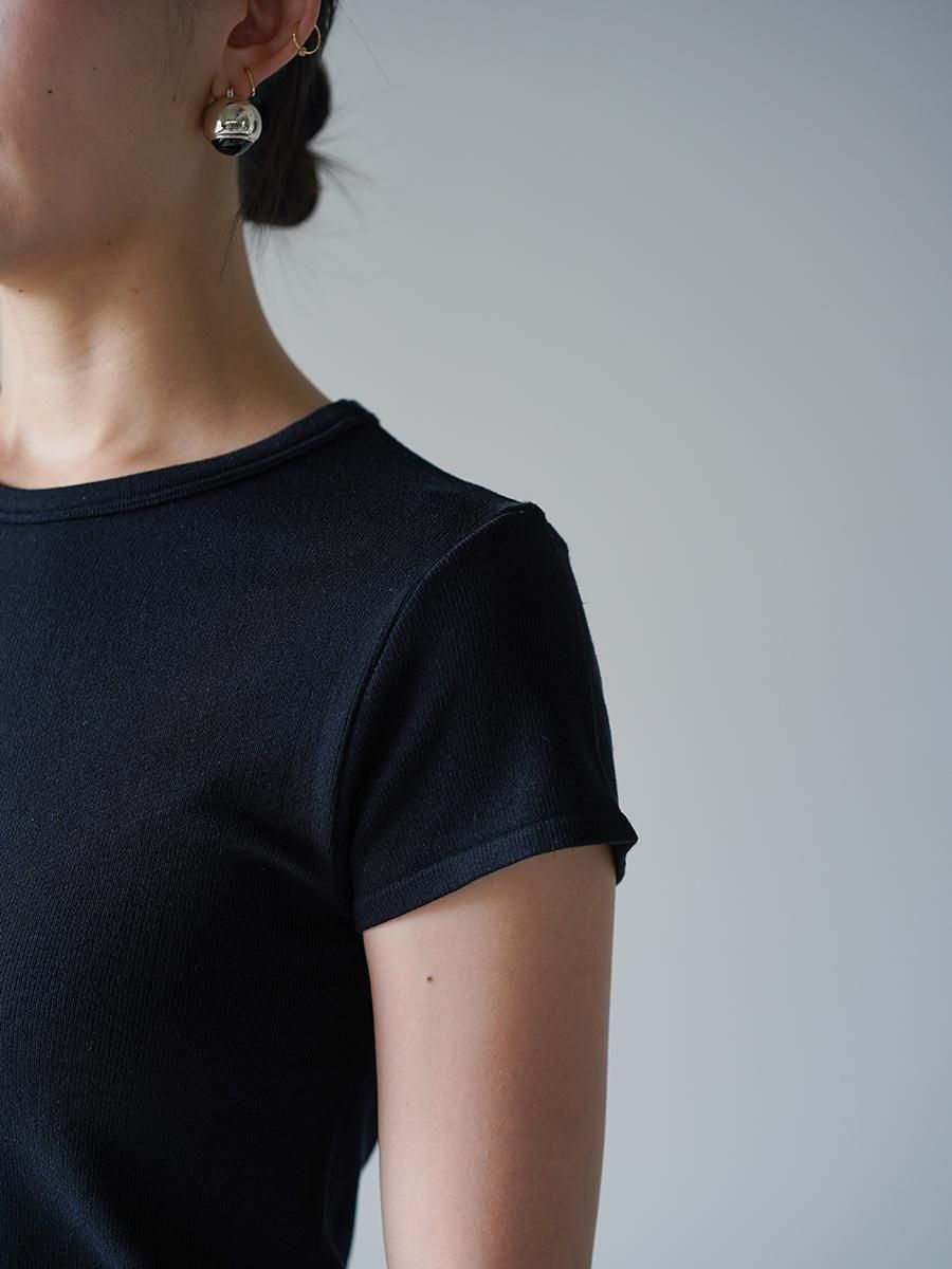 determ;(デターム)から、コラーゲンを含んだ糸を丸編み機で編み立てたコラーゲンリブのTシャツのご紹介です。シームレスなつくりで、優しい肌あたりにこだわったアイテム。ブランドの特徴である魚鱗由来のコラーゲンを含んだ生地は、他にはないしっとりとした肌触りが魅力です。高い保湿性や通気性に加え、消臭性・UVカット効果・抗菌性といった機能性も備えた一枚。デザインはミニマルで、幅広く使い回しが可能です。一枚で着ても、ジャケットのインナーとしてなど幅広く活躍してくれる一着です。