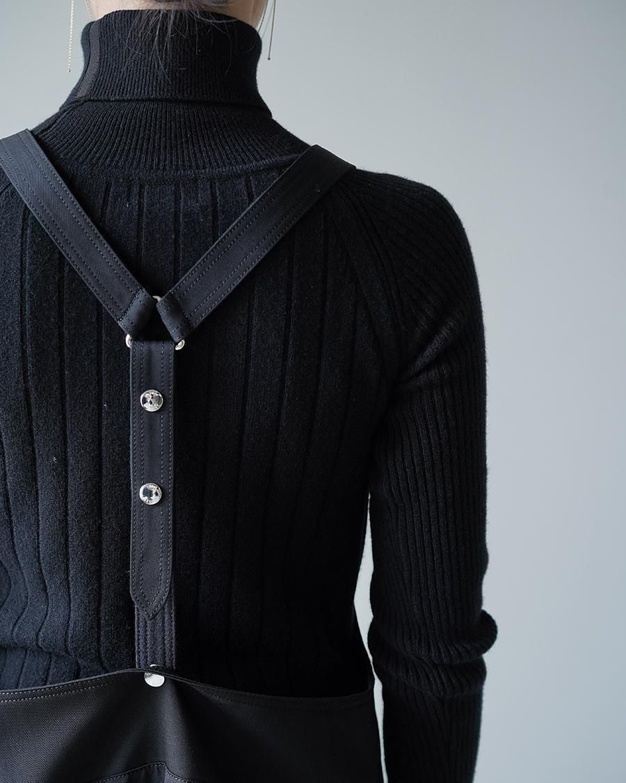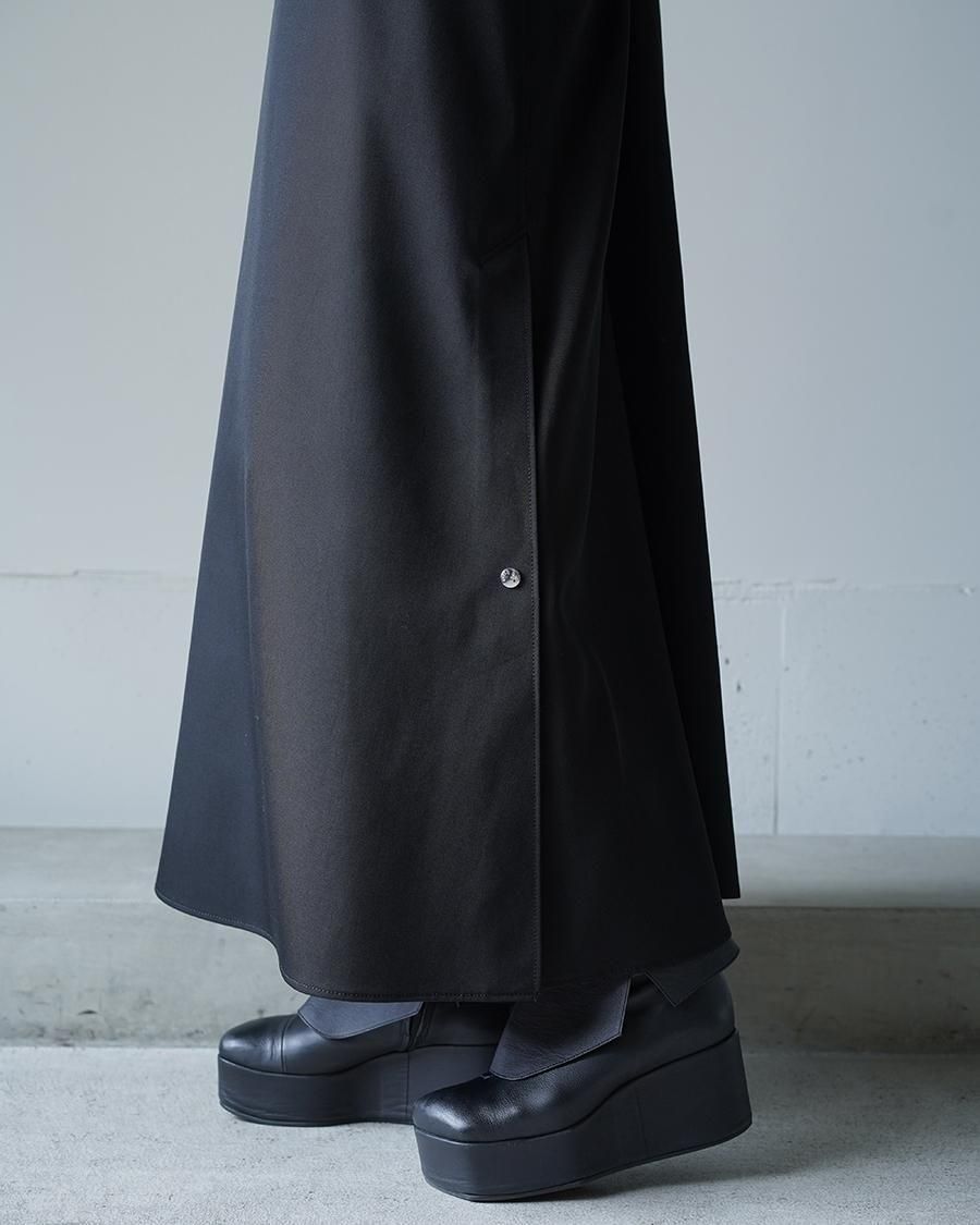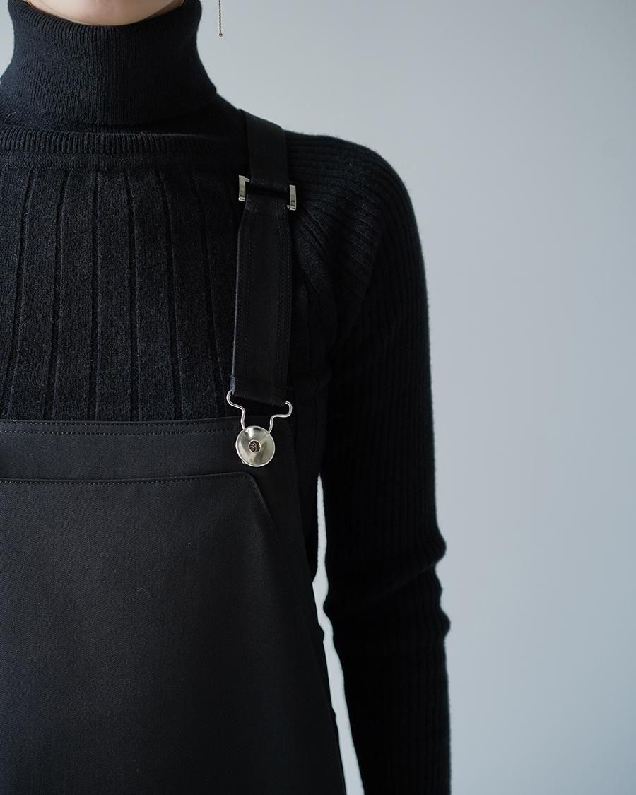 エプロンというアイテムをTHE RERACSの解釈でミニマルにデザインしました。フロントの切り替えを活かしたパーカーを思わせるカンガルーポケット、深めに設定した裾スリットは汎用性を高め、重厚感のあるバックルや大き目なネオバー釦などパーツは高級感を演出しながら、光沢感とハリ感のある素材を使用しAラインのシルエットにすることで女性らしい美しいラインを形成します。 一枚でスタイリングが成立するTHE RERACS定番のドレスです。