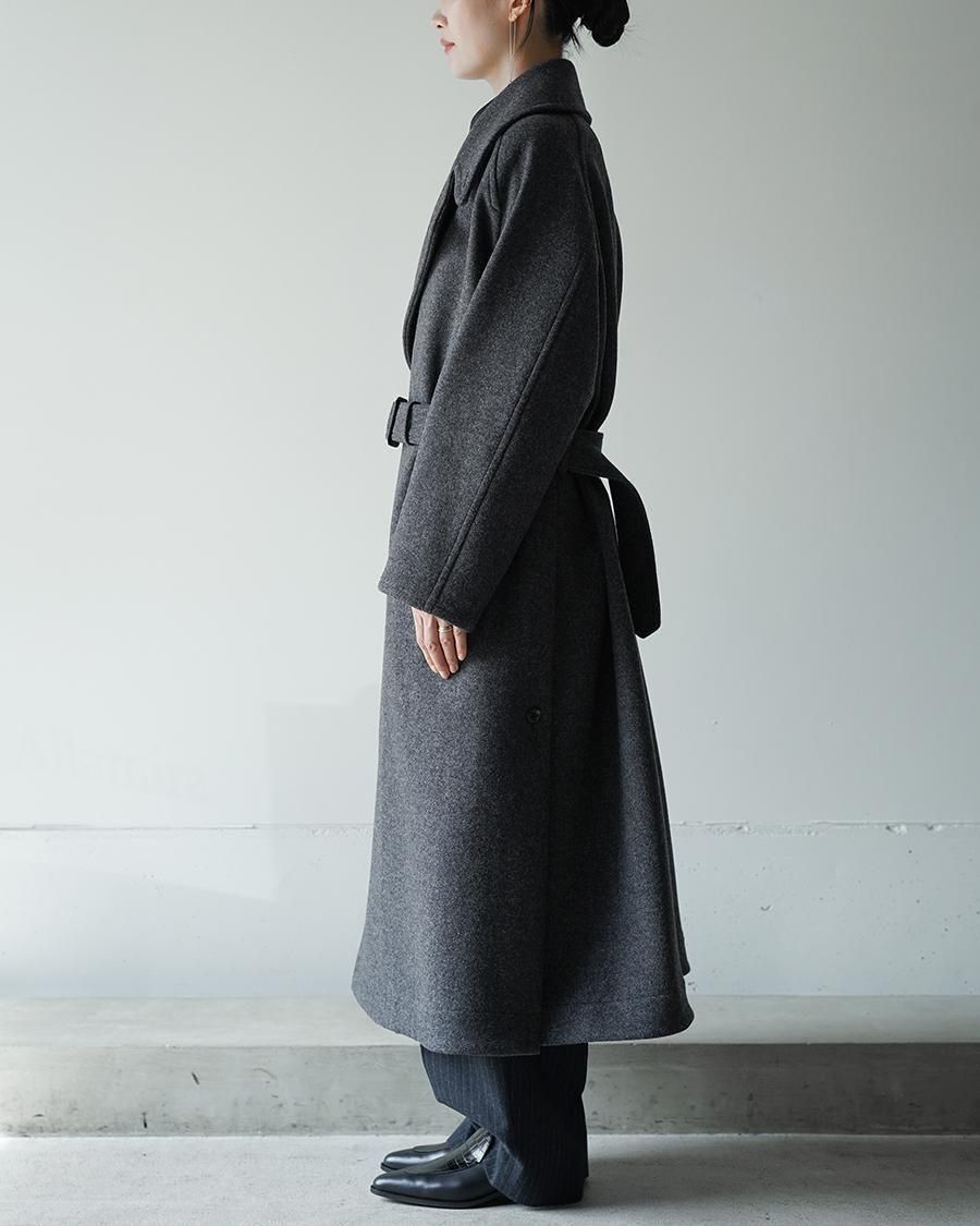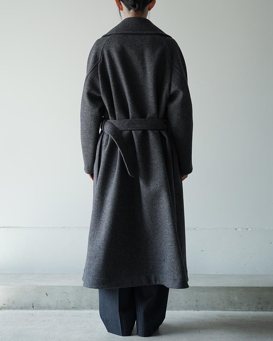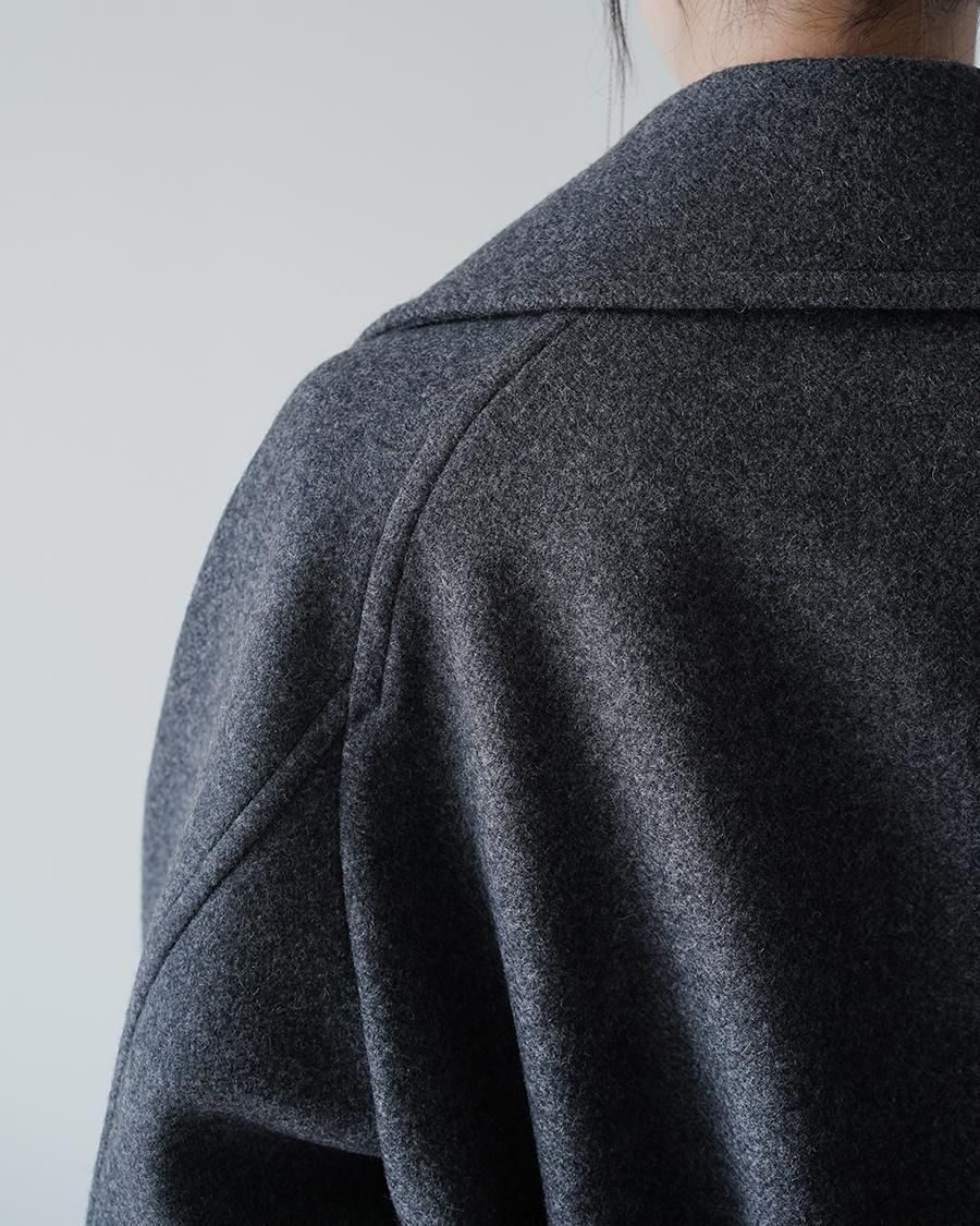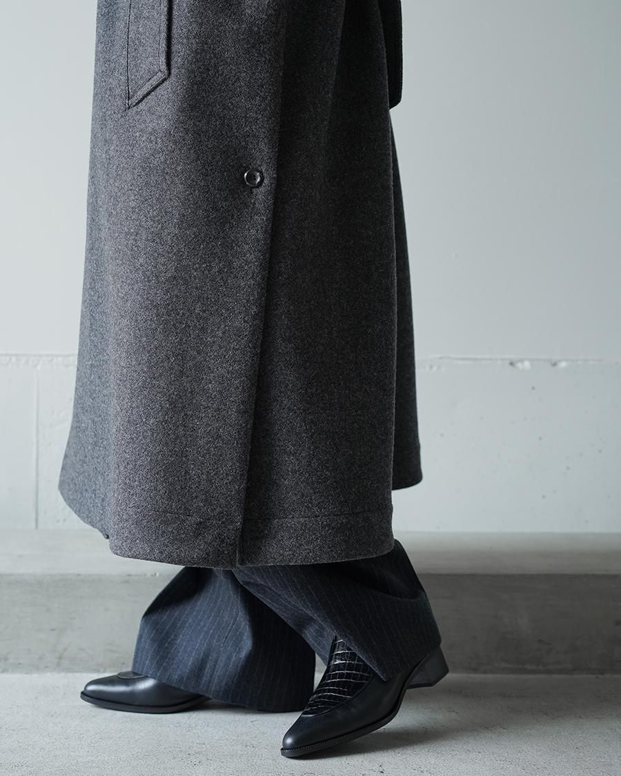 スーツの上からでも着用可能なダイナミックなシルエットを表現しつつ、極限までディテールをそぎ落としたデザインで、RERACSの考えるラグジュアリーを追求した仕上がりとなっております。フロントのボタンは表から見えない比翼仕立てになっており洗練された印象を付与しています。また、大きく設定された襟ぐりがアクセントとなっております。襟は折り返して着用する以外に、襟を立たせてボタンを留めることでスタンドカラーとしても着用できる設計です。両脇裾の高めのスリットはボタンで開閉でき、パンツのポケットにスムーズに手を入れられるようになっており、また足元に動きをもたせるなど実用性とデザイン性を兼ね備えた設計となっております。ドレスの様に完全に1枚で仕立て、THE RERACS独自の解釈にて構築した今期を象徴する一着となっております。