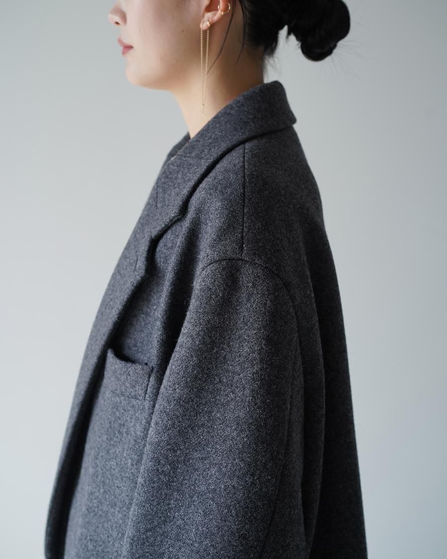 素材のもつハリ感から生み出されるダイナミックなAラインシルエットが特徴です。フロントの重なりを深く設定することで、よりクラシックで重厚感のある印象に仕上げています。緻密なパターン寸設計により表現されたドロップショルダーは、重力に対し袖がまっすぐに落ちることでアームホールに無駄なしわがなくバストの抱きが美しく見えるデザインとなっています。腰のポケットはフラップポケットでトラディショナルな印象を付与しています。フロントのボタンは表から見えない比翼仕立てになっており、極力デザインをそぎ落とし、ミニマルに仕上げています。両脇裾の高めのスリットはボタンで開閉でき、パンツのポケットにスムーズに手を入れられるようになっており、また足元に動きをもたせるなど実用性とデザイン性を兼ね備えた設計となっております。THE RERACSらしいアイテムを更にモダンにアップデートした一枚です。
