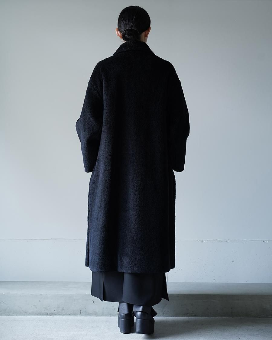 厚みのある生地を使用しているコートの為、肩のラインを下げ、腕や胴回りにゆとりをもたせることで着用時の圧迫感が少なく、袖通りの良い設計です。ウールとシルクをブレンドした素材を使用し、ボリュームと弾力がありながらも軽い風合いに仕上げています。また厚みのある生地に対し、ボタンで調節可能なスリットをいれることで動きを出すなど、ラグジュアリーなデザインと実用性のバランスを取る為の工夫が組み込まれたTHE RERACS定番のバルカラーコートを再構築した1枚です。