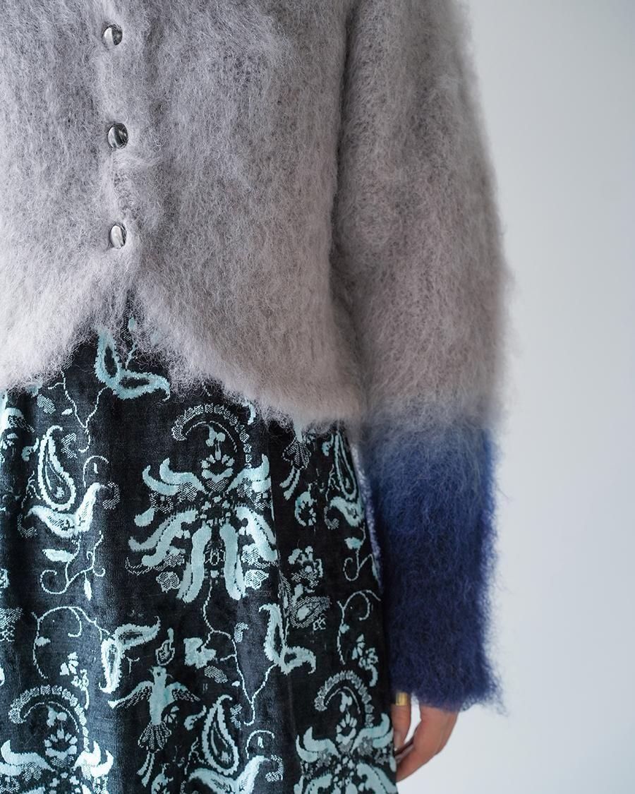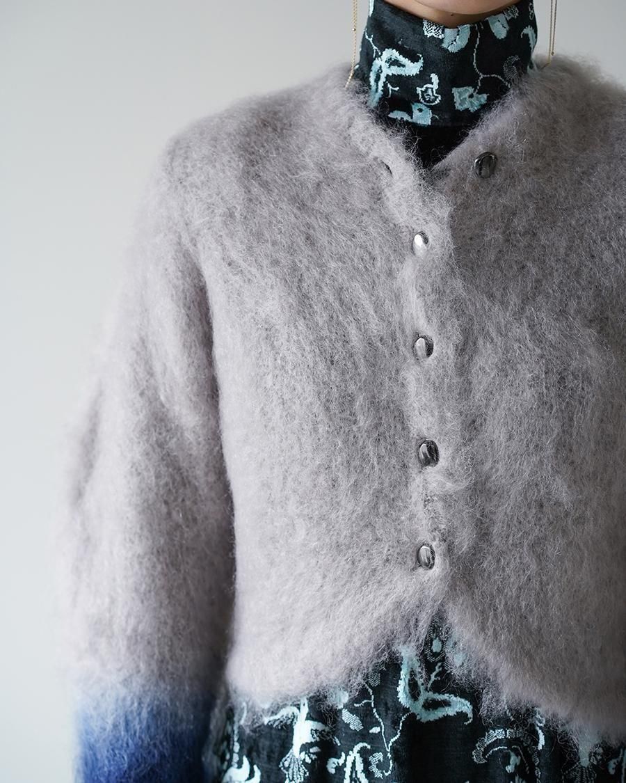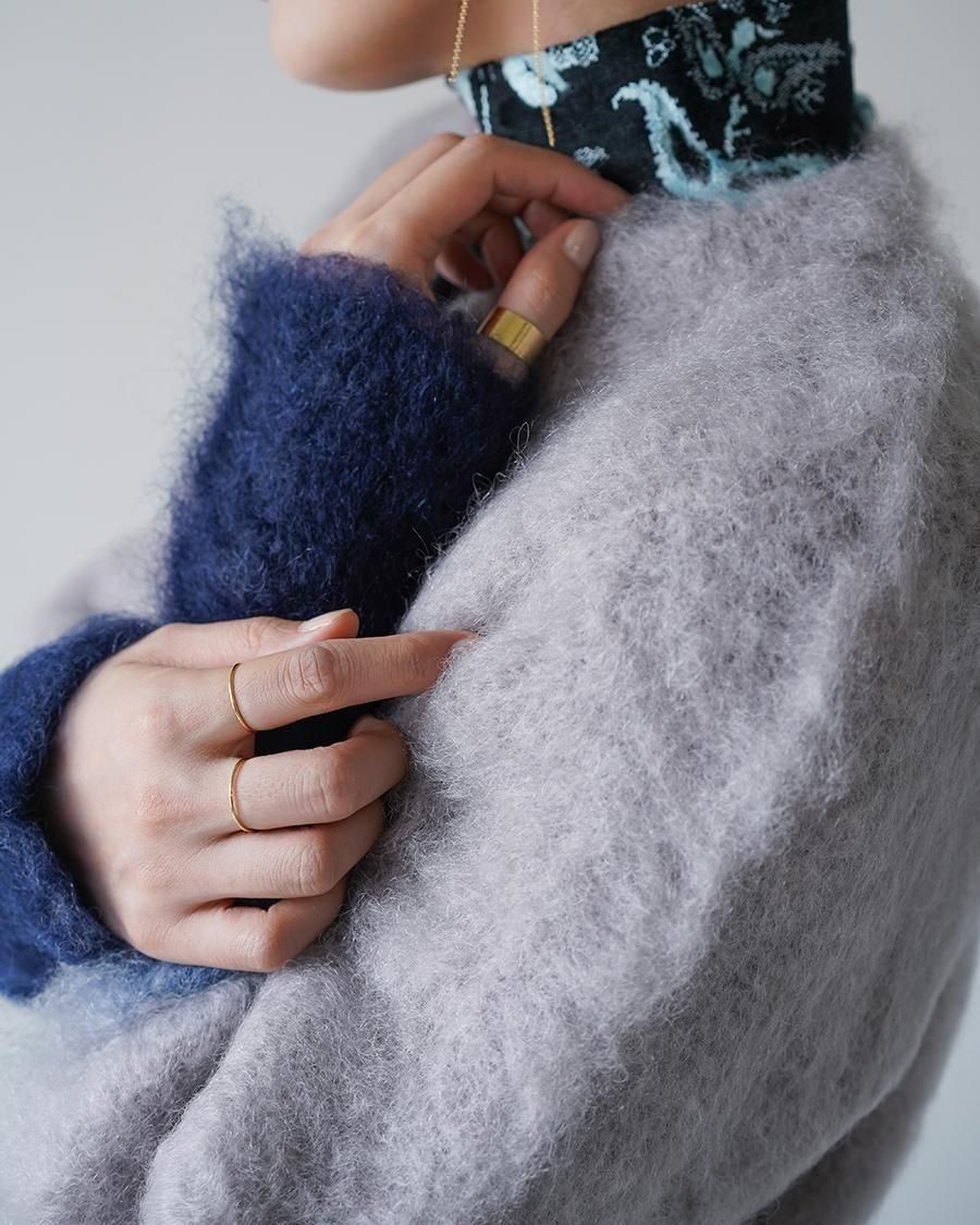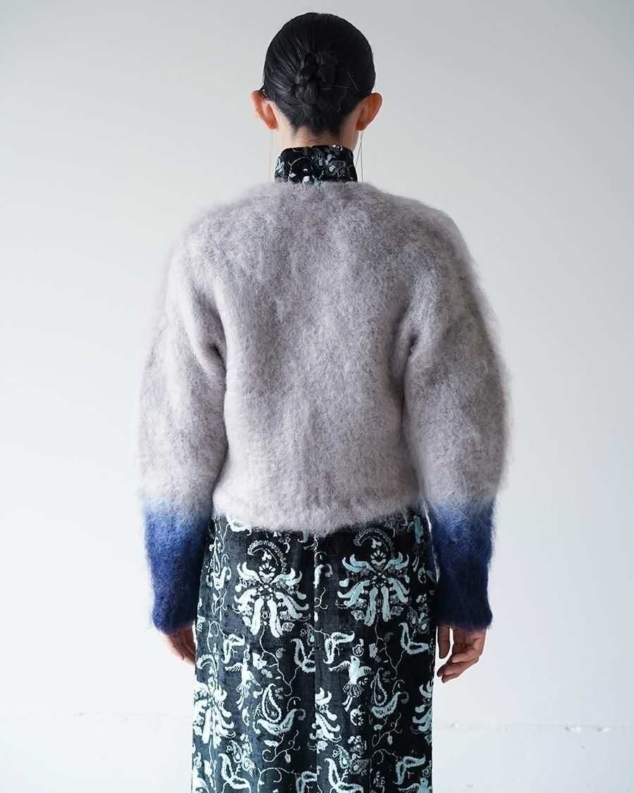1点ずつ丁寧に手作業で起毛加工を施すことで、軽やかで柔らかな質感と、立体的で豊かな表情を生み出した。光沢感とハリのあるモヘア糸を使用し、丸みのある袖のフォルムと、フィット感のあるコンパクトな身頃がデザインにメリハリを与える。袖口に吊るし染めによる鮮やかな色彩をあしらうことで、シンプルながらも気品ある印象に仕上げている。シンプルなシルエットは、カジュアルからエレガントまで幅広いスタイルに寄り添う一着。