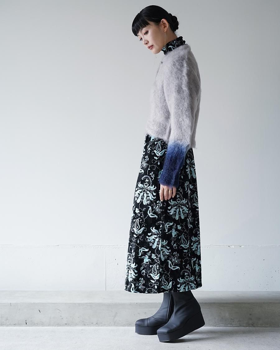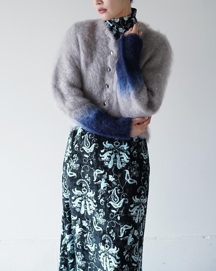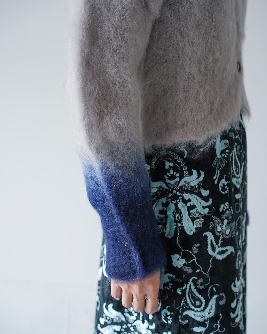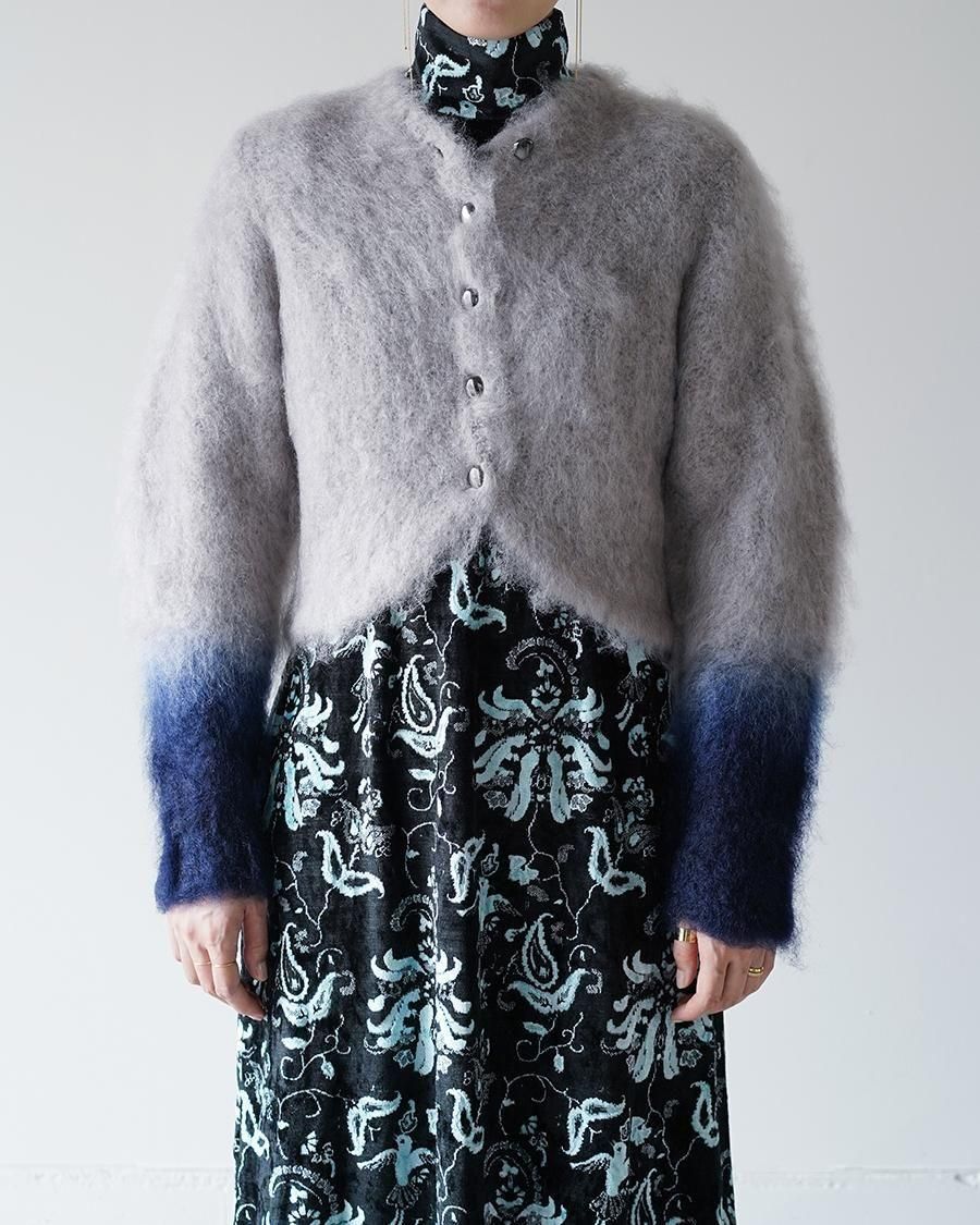 1点ずつ丁寧に手作業で起毛加工を施すことで、軽やかで柔らかな質感と、立体的で豊かな表情を生み出した。光沢感とハリのあるモヘア糸を使用し、丸みのある袖のフォルムと、フィット感のあるコンパクトな身頃がデザインにメリハリを与える。袖口に吊るし染めによる鮮やかな色彩をあしらうことで、シンプルながらも気品ある印象に仕上げている。シンプルなシルエットは、カジュアルからエレガントまで幅広いスタイルに寄り添う一着。