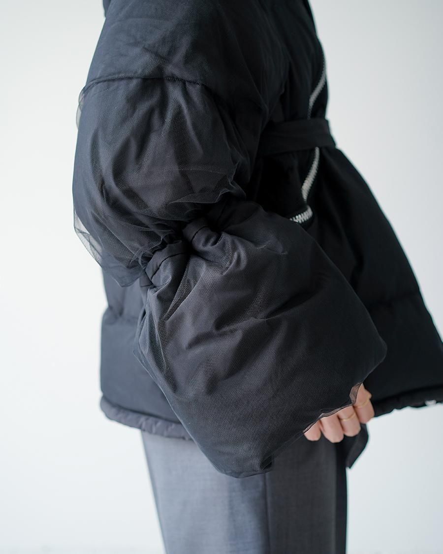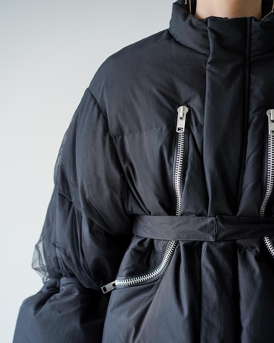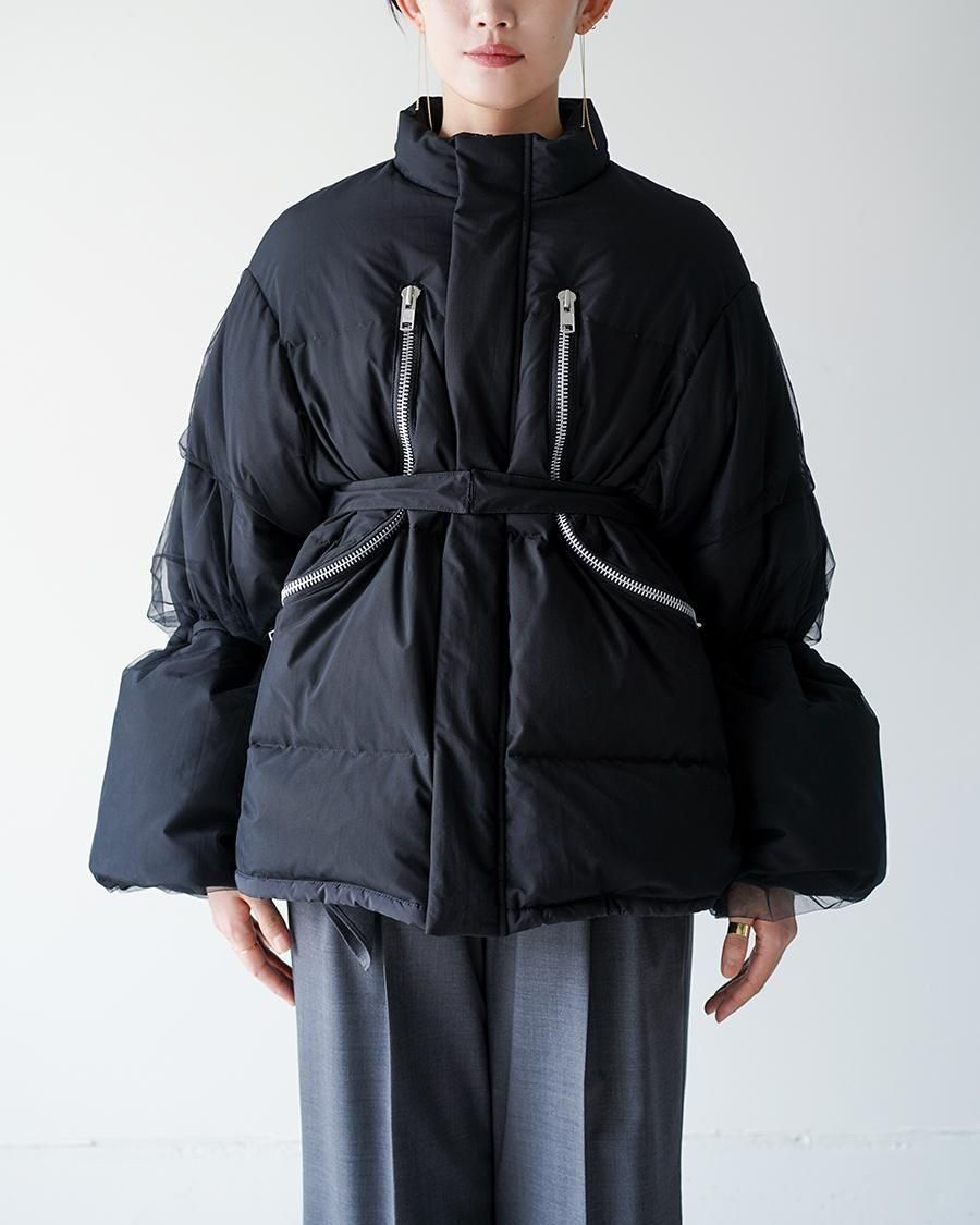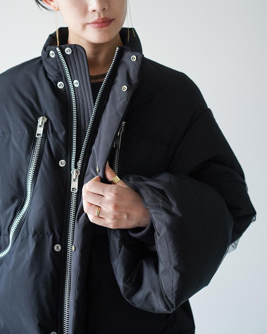Chika Kisada(チカ キサダ)から、スポーティーな要素にモードなエレガンスを掛け合わせたチュールダウンのご紹介です。フロント左右のジップを開けてインナーを覗かせたり、袖のドローコードでシルエットを自在にアレンジしたりと、着こなし次第で様々な表情を演出します。異素材チュールの奥行きや、甘めのニュアンスカラーが華やかさと女性らしさをプラス。一枚でモードとフェミニンを共存させる、洗練された一着です。