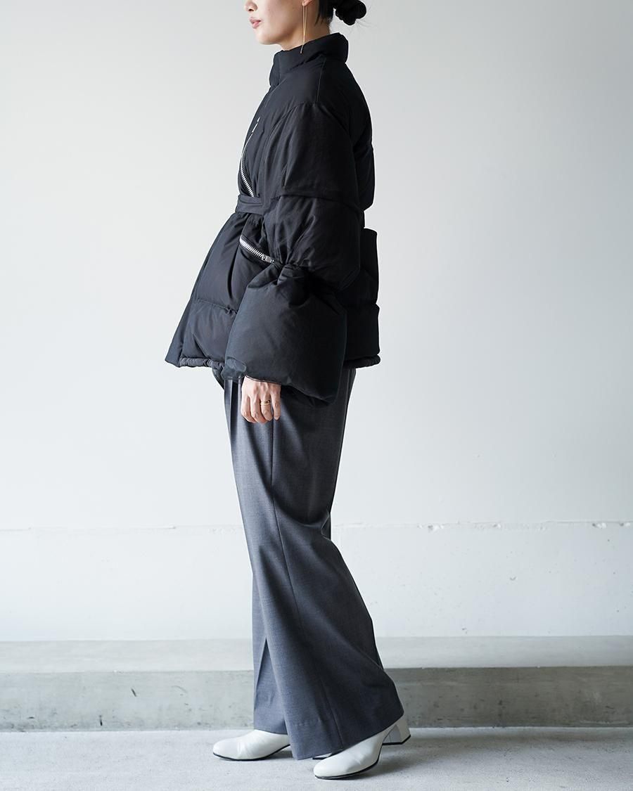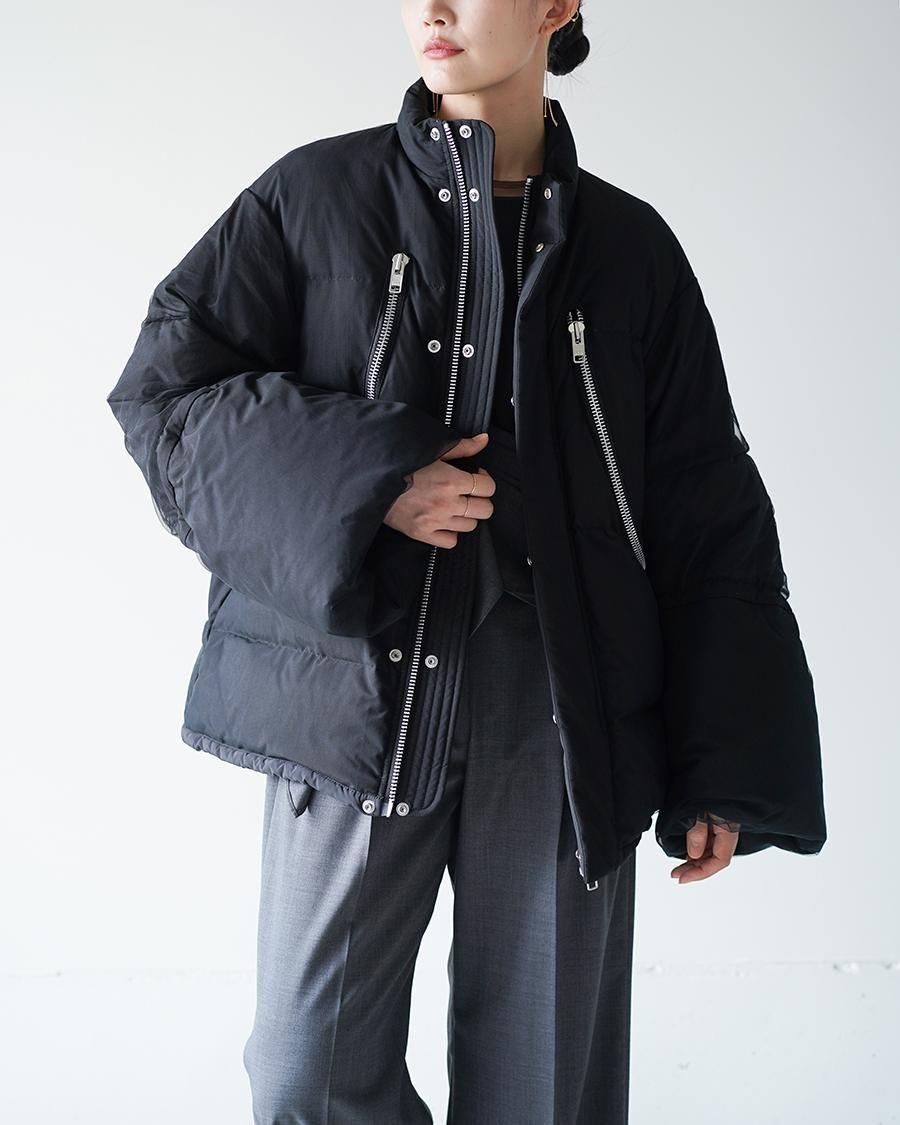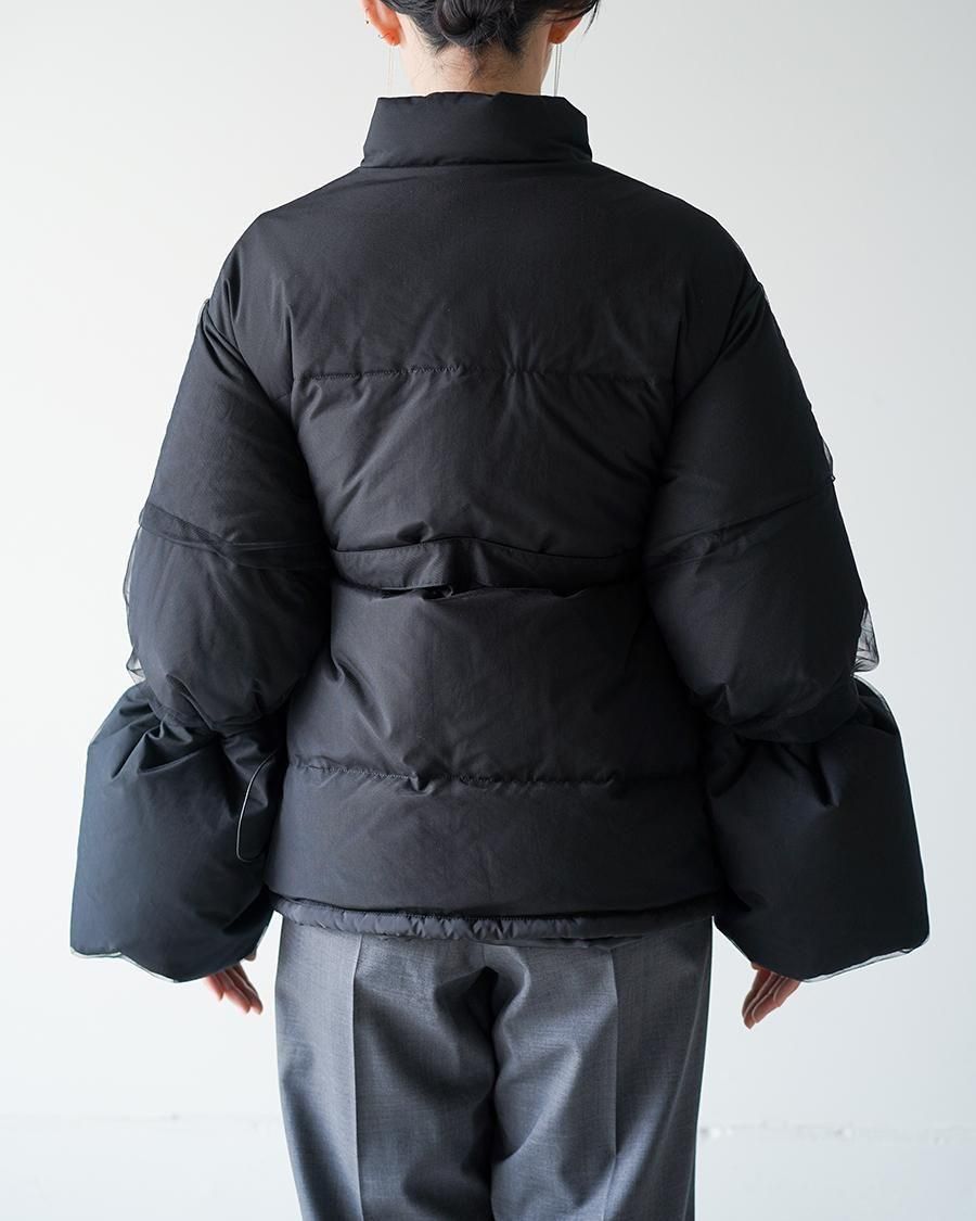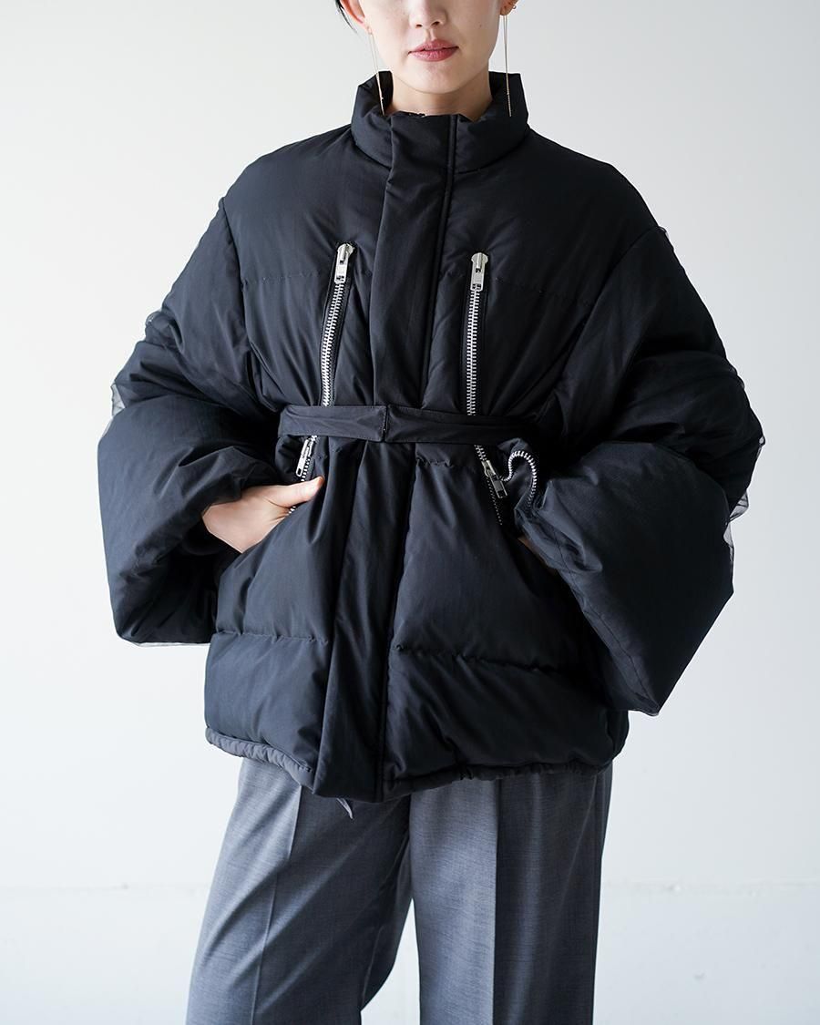 Chika Kisada(チカ キサダ)から、スポーティーな要素にモードなエレガンスを掛け合わせたチュールダウンのご紹介です。フロント左右のジップを開けてインナーを覗かせたり、袖のドローコードでシルエットを自在にアレンジしたりと、着こなし次第で様々な表情を演出します。異素材チュールの奥行きや、甘めのニュアンスカラーが華やかさと女性らしさをプラス。一枚でモードとフェミニンを共存させる、洗練された一着です。
