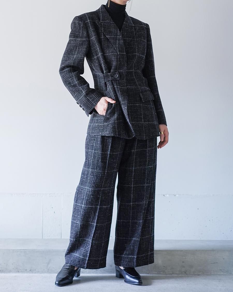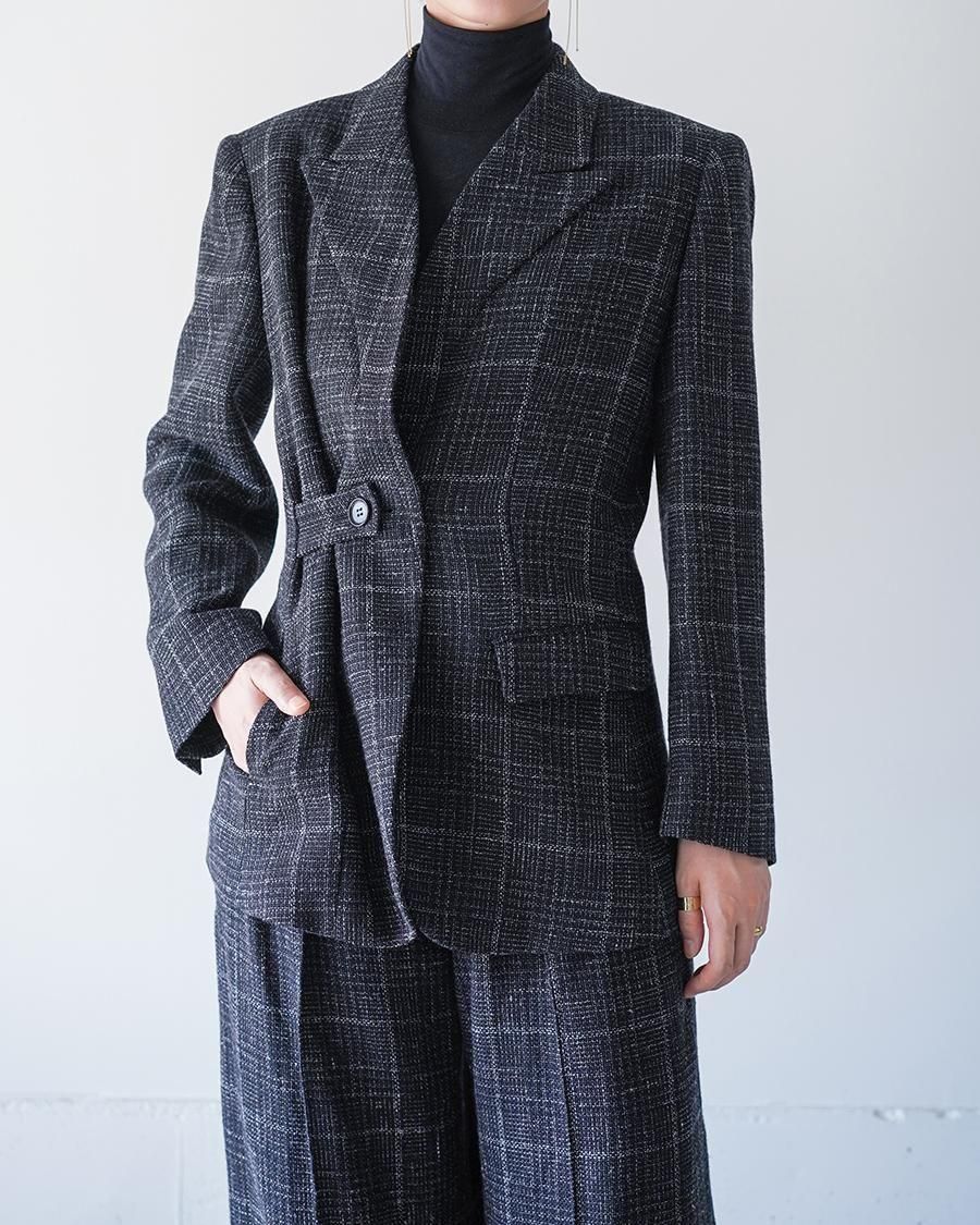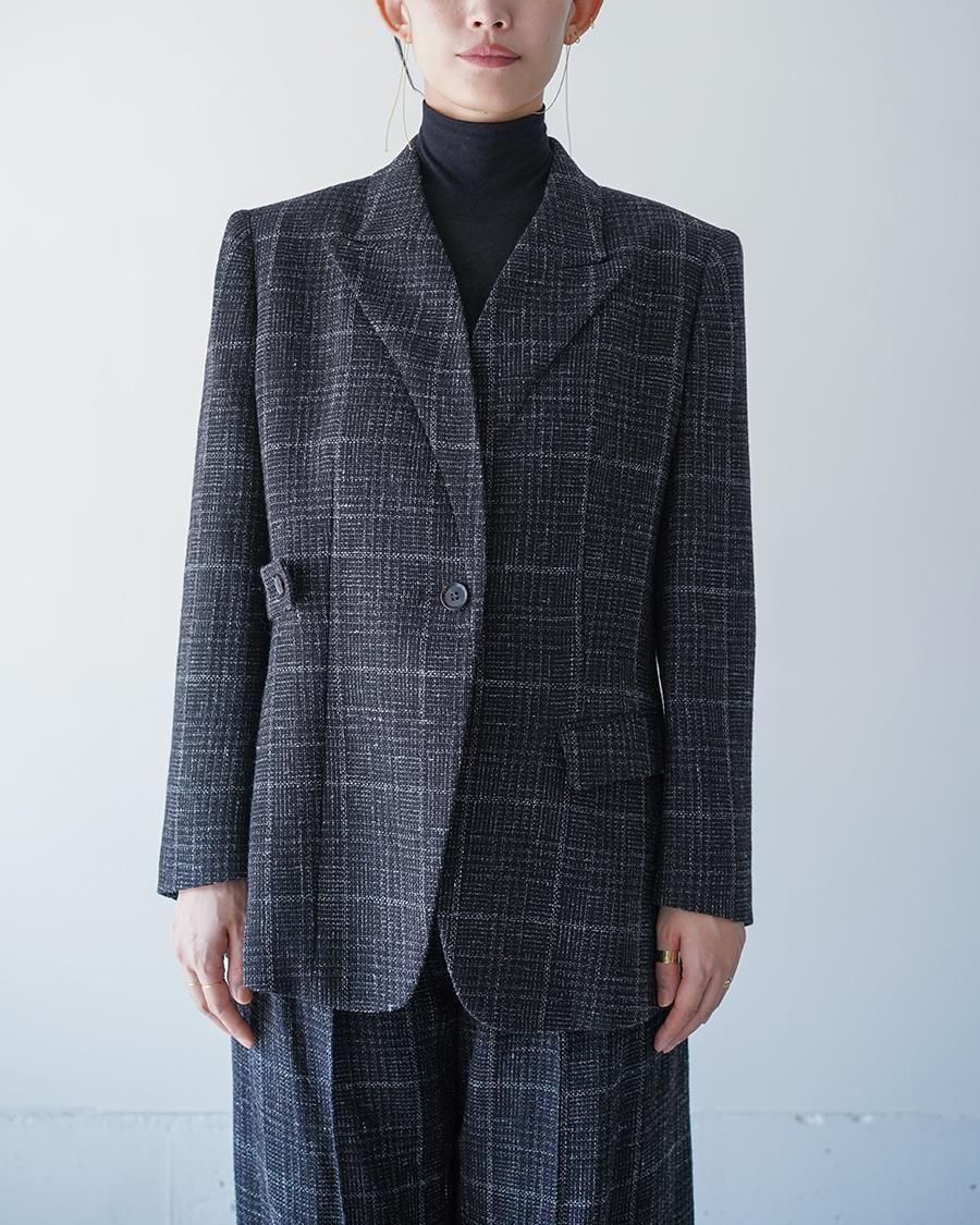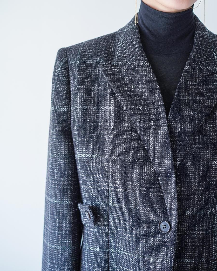 ボタンの留める位置によって、ドレープ感を出したりとシルエットの変化も楽しんでいただけるジャケットです。