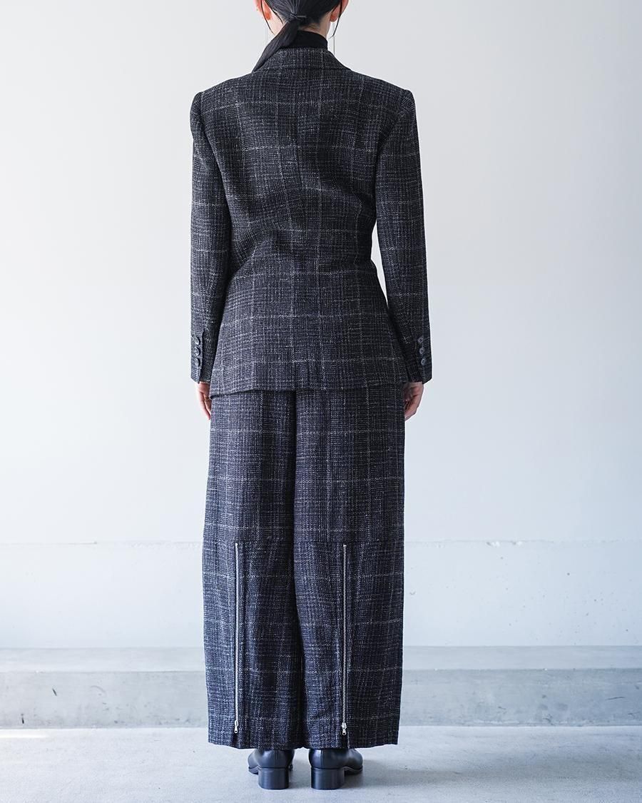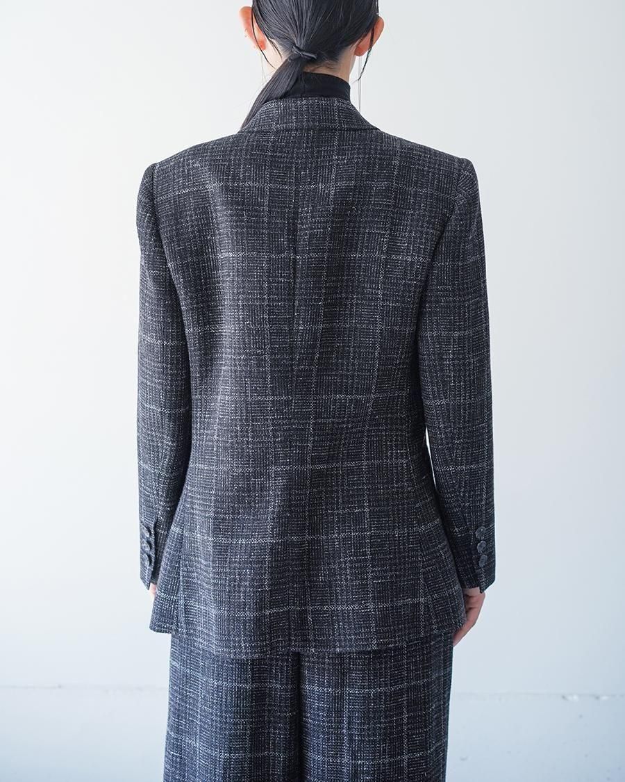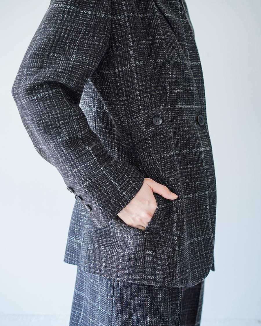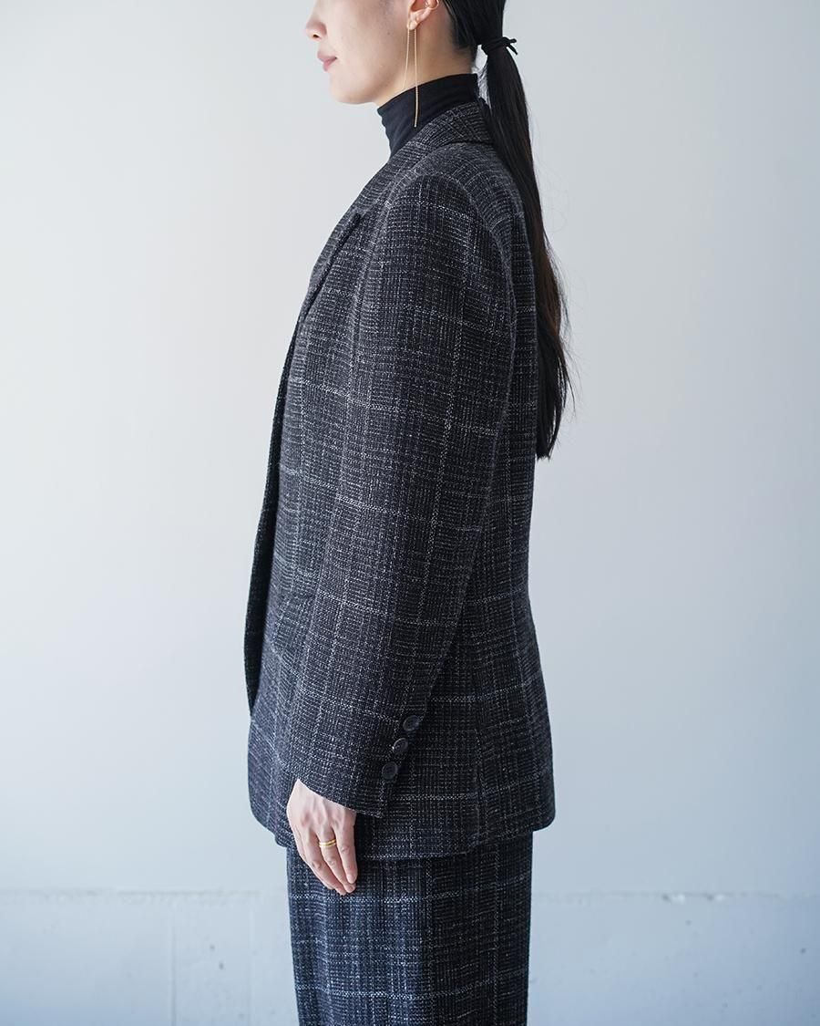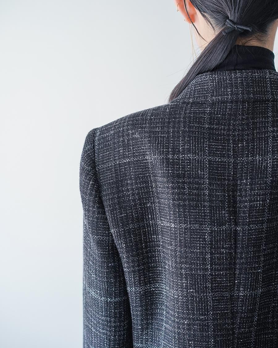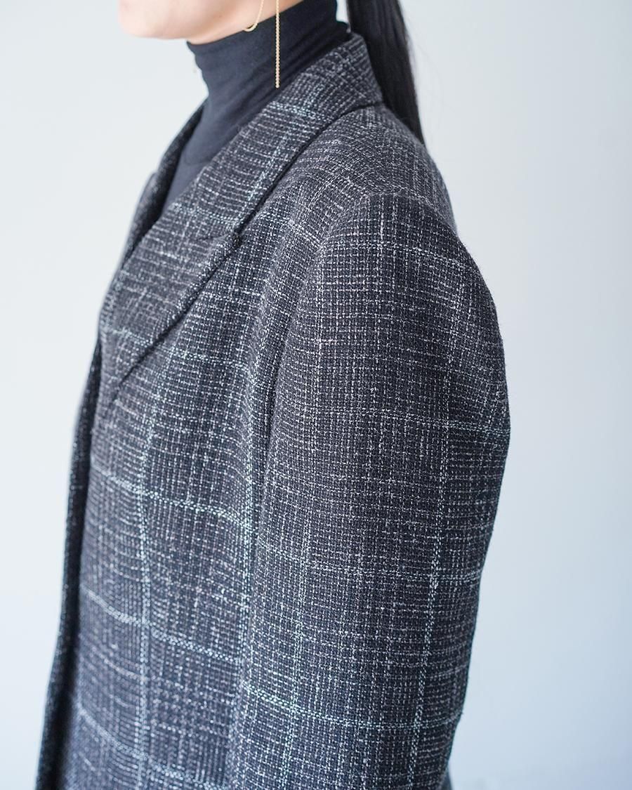 リネンウールの紡毛のラフな見た目に対してエアリーでしなやかな軽さ、透け感を生かすため、一枚仕立てにすることで軽やかな作りに。肩まわりはシルエットをきっちりと、裾にかけては柔らかい印象に仕上げたブランドらしさのあるシルエット。メンズテーラードを専門とする東北の工場で仕立てた、確かな仕立て、風格ある佇まいに仕上がりました。テーラードのラペルは直線的な開きではなく、カーブの構造になるカッティングを採用しており、本来直線であるものを曲線にすることでの、固定観念に対する流動性を期待した、今期のテーマを表す一着です。