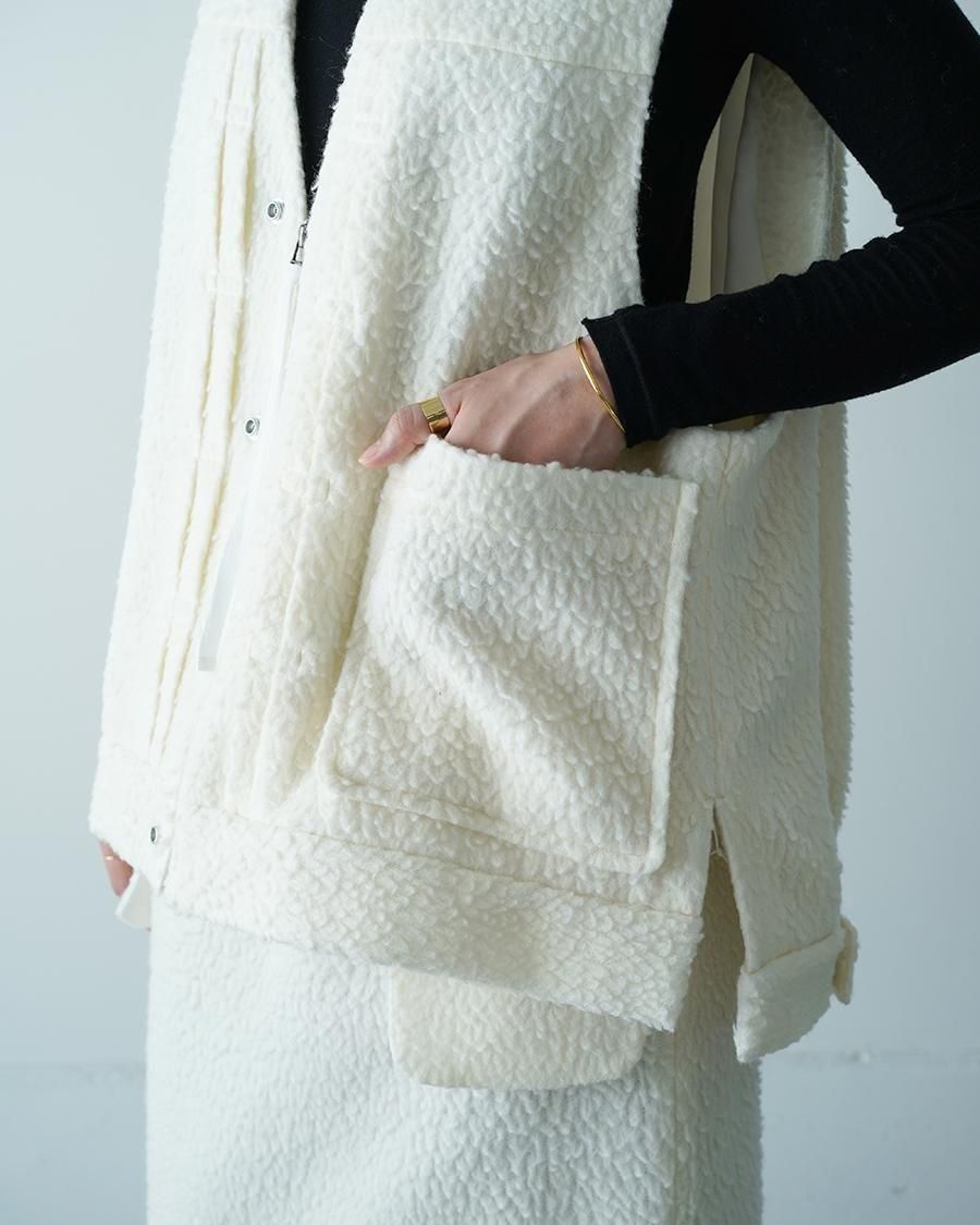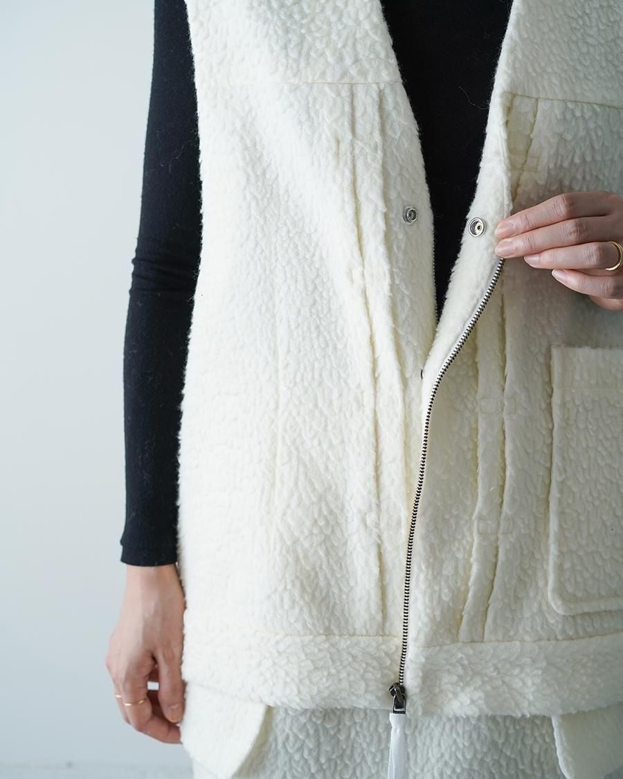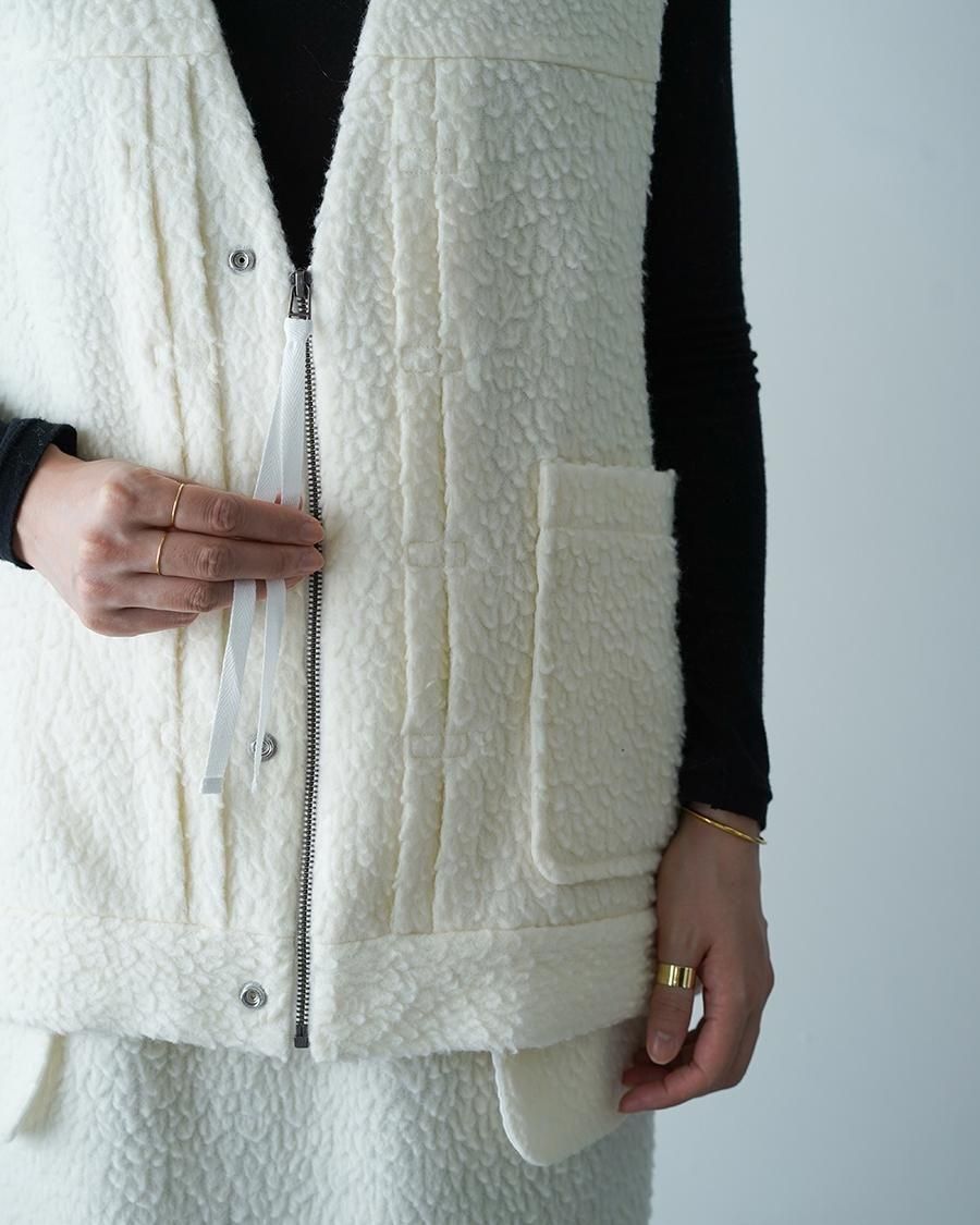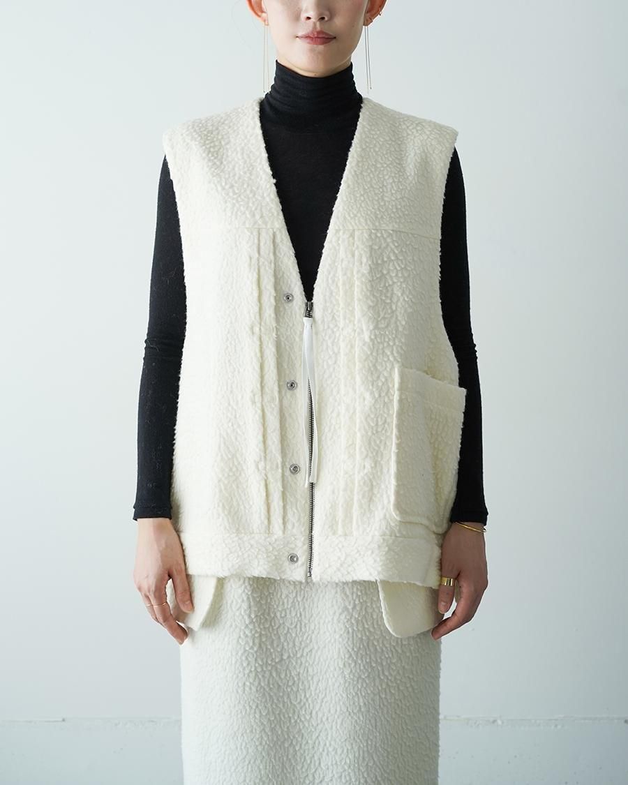 RYU KAGA(リュウカガ)から、ウールボアでつくられた立体的なオーバーサイズベストのご紹介です。ブランドのアイコニックアイテムでもあるデニムジャケットをベースとし、プリーツやヨークのディテールを盛り込んだデザイン。アームホールが広くニットなど幅広いインナーとの組み合わせが可能です。フロントはファスナーとドットボタンの2WAY仕様。バックサイドのはアジャストベルトが施されており、ボリュームのあるシルエットもお楽しみいただけます。ウール100%のシープボアを使用しており、アイボリーなので汚れやほこりも目立ちづらい為日常のスタイリングに取り入れやすい一着です。
