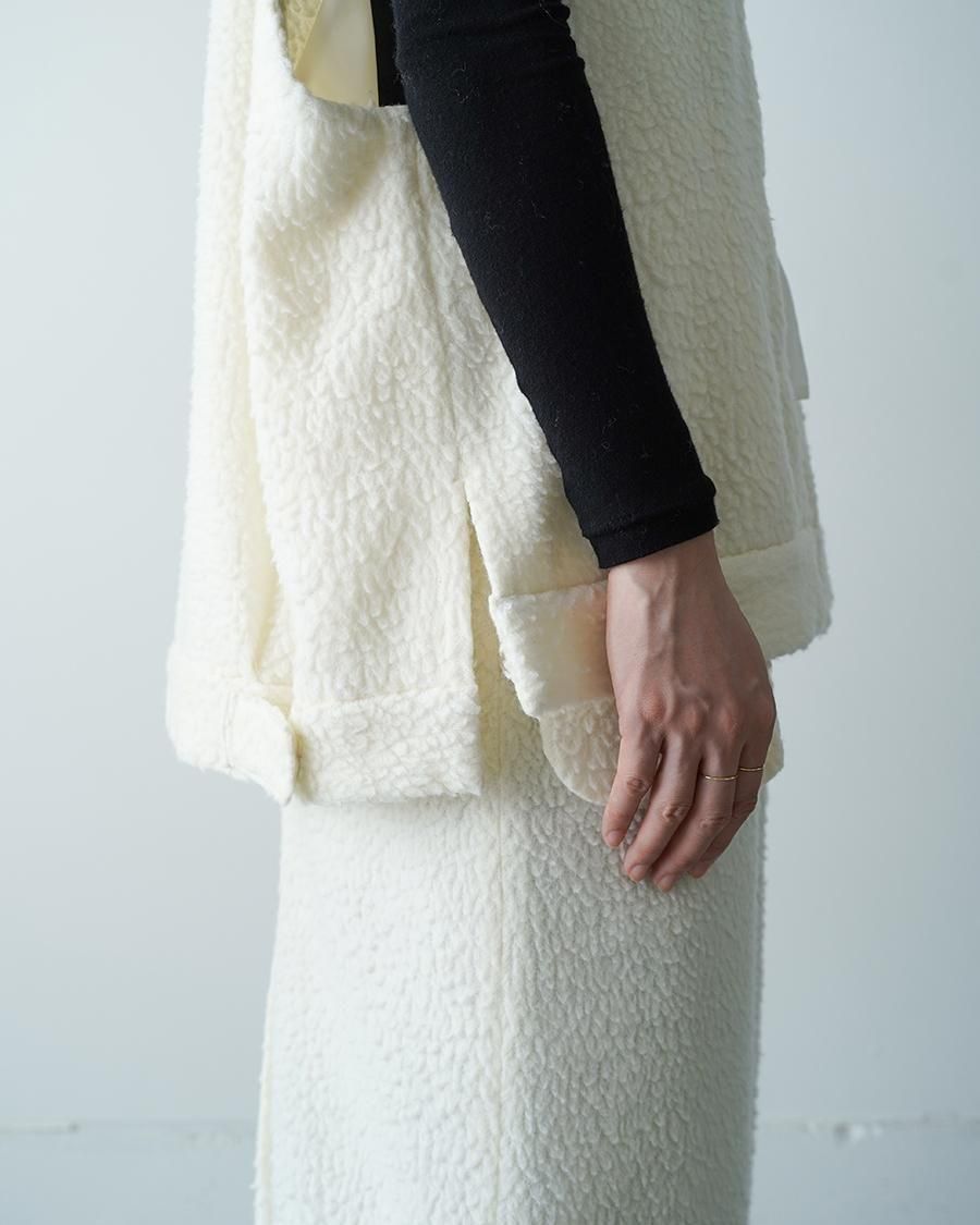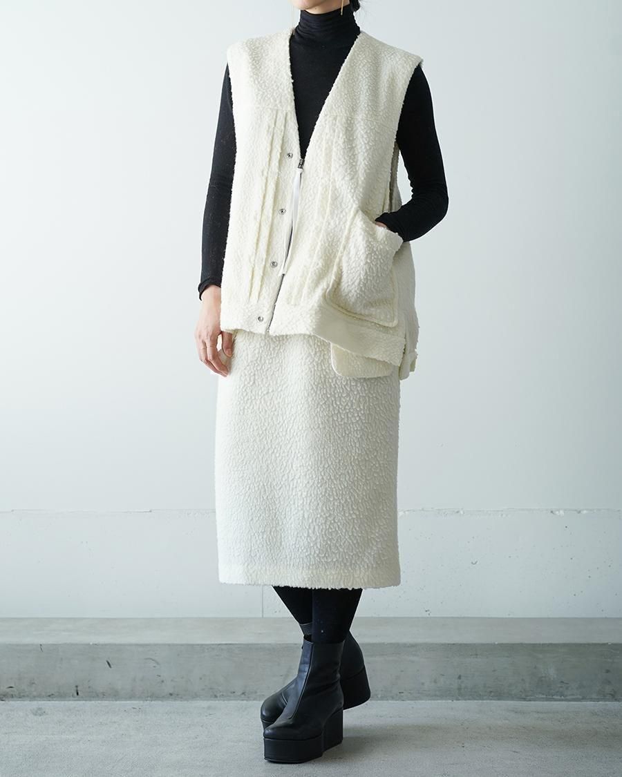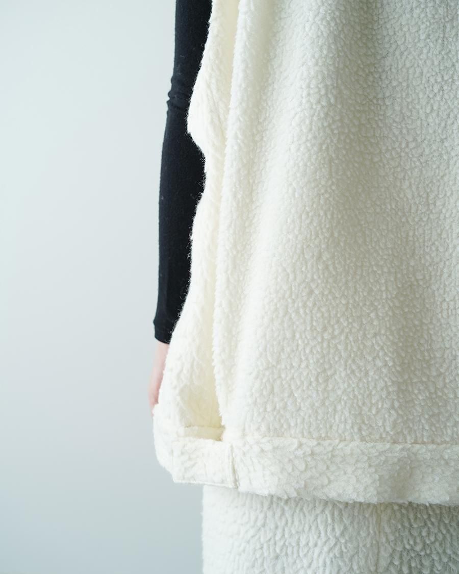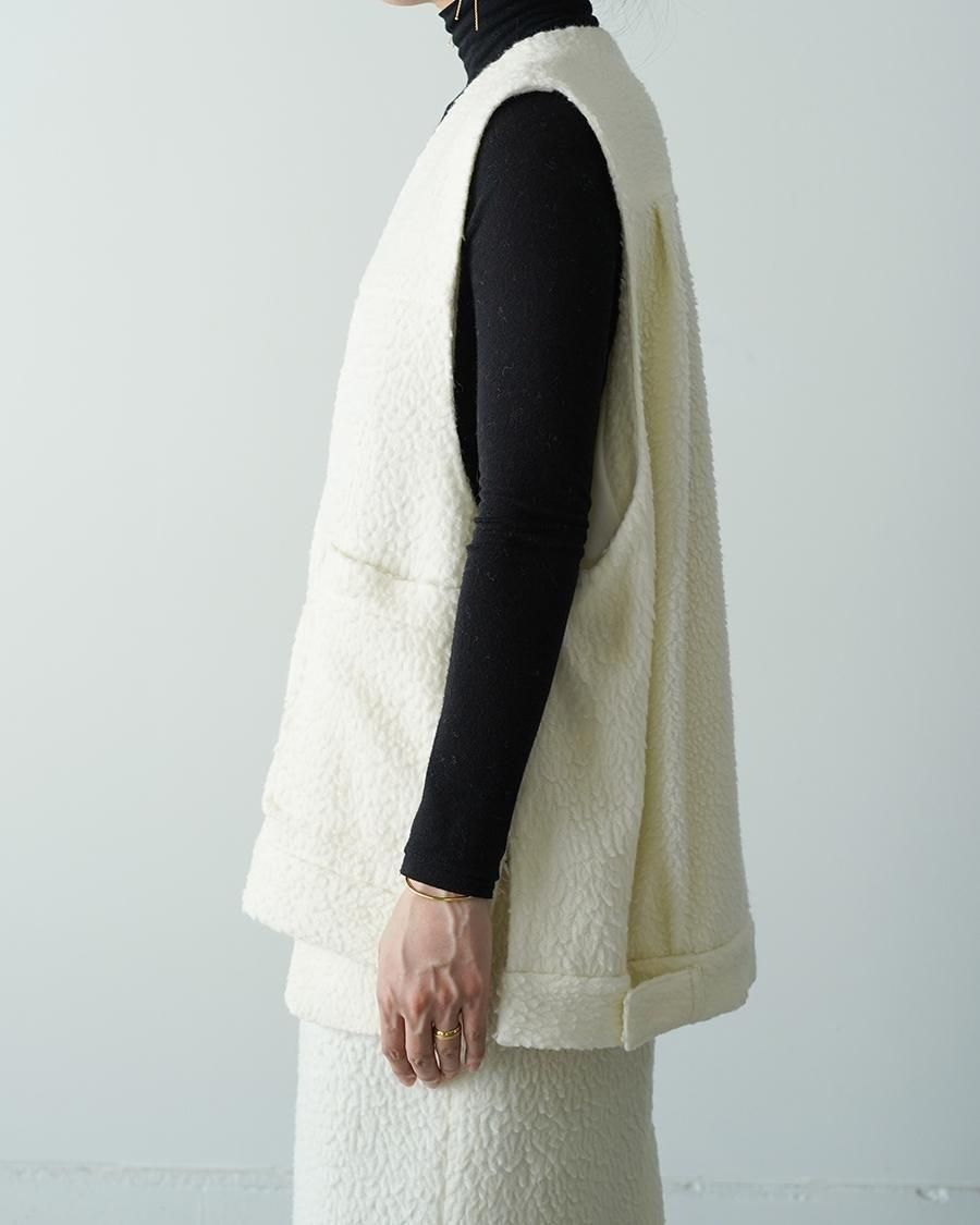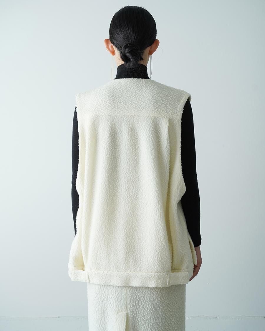 RYU KAGA(リュウカガ)から、ウールボアでつくられた立体的なオーバーサイズベストのご紹介です。ブランドのアイコニックアイテムでもあるデニムジャケットをベースとし、プリーツやヨークのディテールを盛り込んだデザイン。アームホールが広くニットなど幅広いインナーとの組み合わせが可能です。フロントはファスナーとドットボタンの2WAY仕様。バックサイドのはアジャストベルトが施されており、ボリュームのあるシルエットもお楽しみいただけます。ウール100%のシープボアを使用しており、アイボリーなので汚れやほこりも目立ちづらい為日常のスタイリングに取り入れやすい一着です。