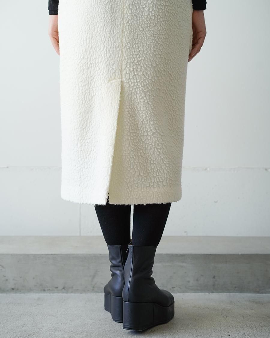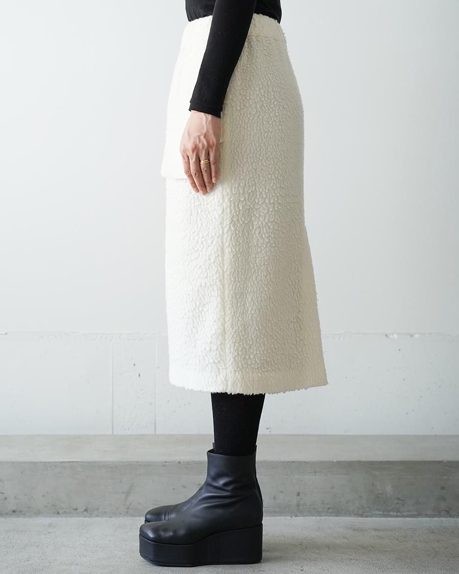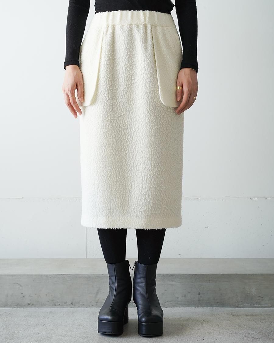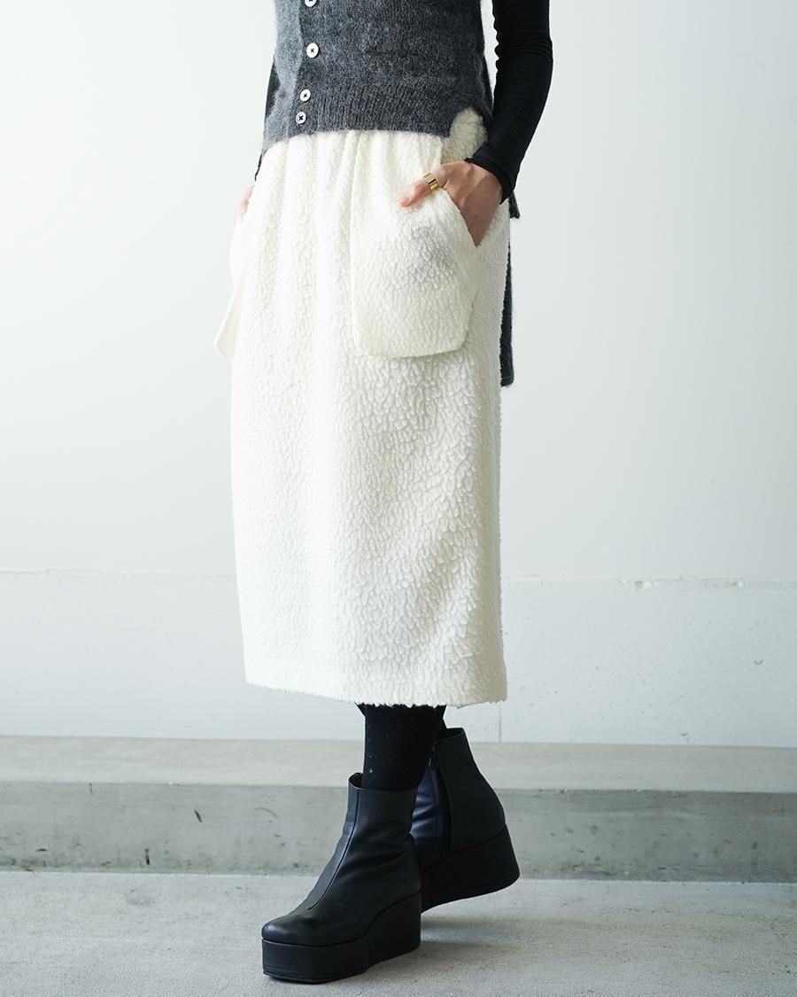 RYU KAGA(リュウカガ)から、ウールボアでつくられたウエストゴムのペンシルスカートのご紹介です。ポケットの袋部分を表に出したような立体的なデザインが特徴の一枚。上品さを感じさせるタイトなシルエットと、可愛らしいボアの素材感の組み合わせがブランドらしさを与えます。ミディ丈のスカートで、バックにはスリットが入っている為、ソックスやシューズによって様々なバランスをお楽しみいただけます。同素材のベストとセットアップでの着用もおすすめ。ウール100%のシープボアを使用しており、アイボリーなので汚れやほこりも目立ちづらい為日常のスタイリングに取り入れやすい一着です。
