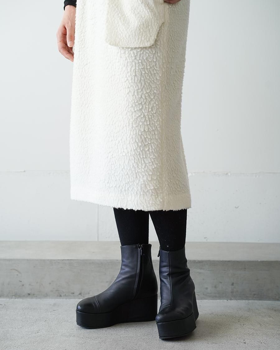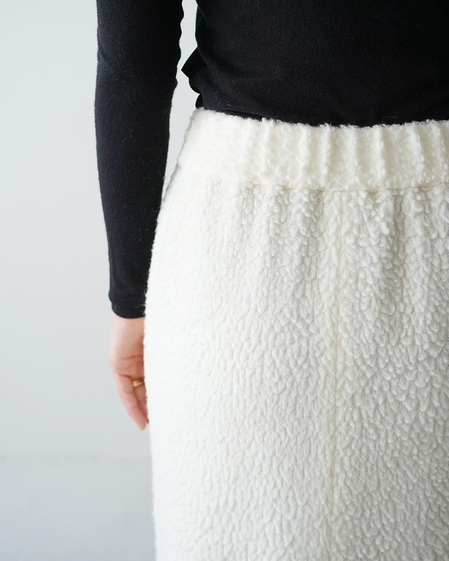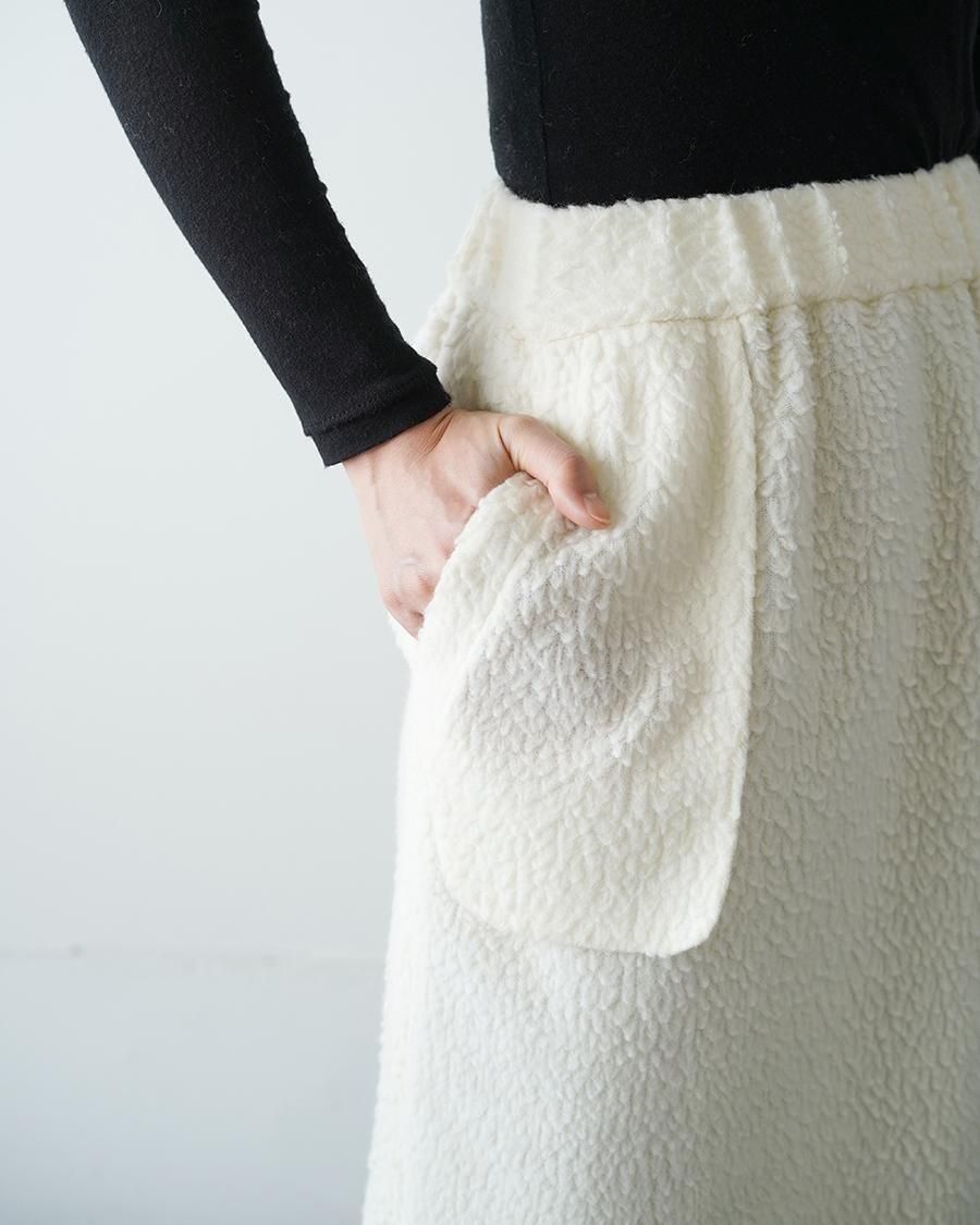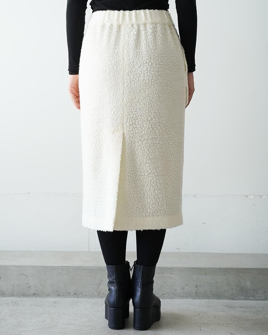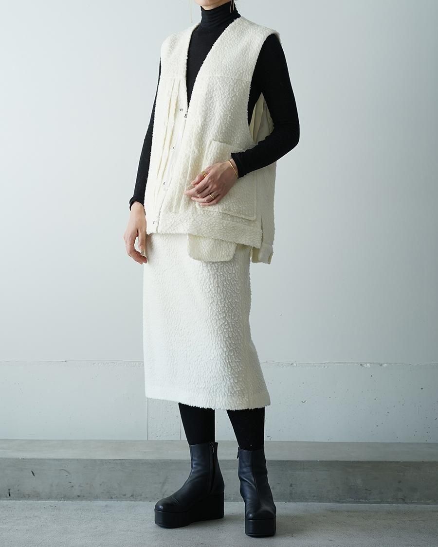 RYU KAGA(リュウカガ)から、ウールボアでつくられたウエストゴムのペンシルスカートのご紹介です。ポケットの袋部分を表に出したような立体的なデザインが特徴の一枚。上品さを感じさせるタイトなシルエットと、可愛らしいボアの素材感の組み合わせがブランドらしさを与えます。ミディ丈のスカートで、バックにはスリットが入っている為、ソックスやシューズによって様々なバランスをお楽しみいただけます。同素材のベストとセットアップでの着用もおすすめ。ウール100%のシープボアを使用しており、アイボリーなので汚れやほこりも目立ちづらい為日常のスタイリングに取り入れやすい一着です。