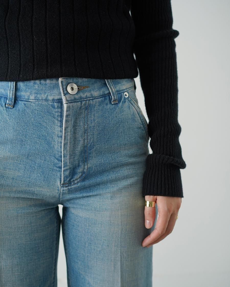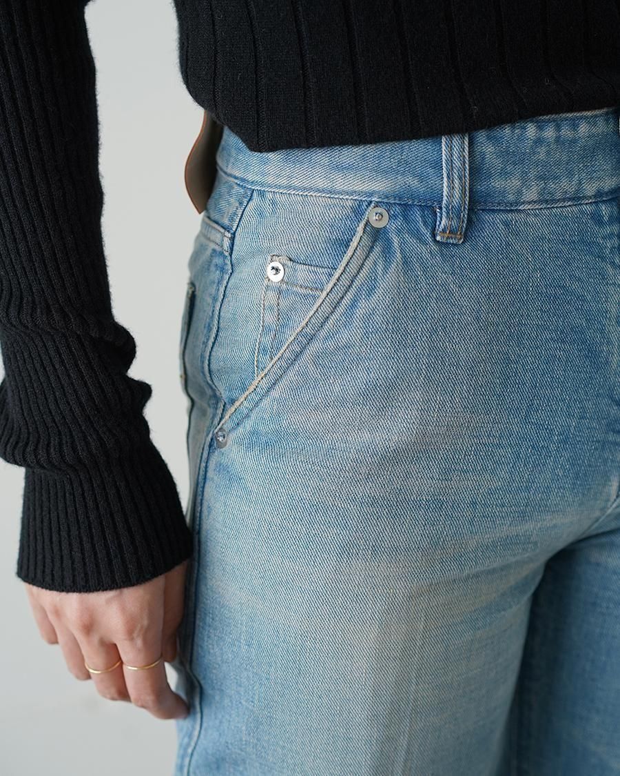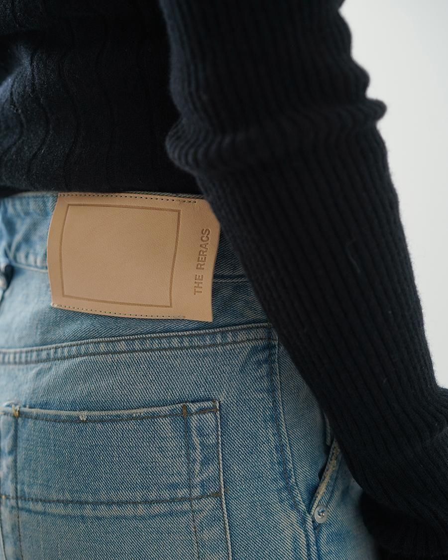 THE RERACS (ザ・リラクス)から、コットン素材のオリジナルレフトハンドデニムを使用したペンシルフレアパンツのご紹介です。ヒップから膝までをコンパクトにし、膝下をフレアにすることで腰回りをすっきり見せる、女性らしい動きのあるシルエットに仕上げております。フロントはL字ポケットを採用し、ボタンはシルバーのオリジナルタックボタンを使用。また、パッチ部分はレザーを使用しクラシックな印象にしています。ウエストは芯地で厚みをだし、保形性を持たせた構築的なパターン設計となっており、デニムを糸の撚りと同じ方向の左綾で織り上げることで、表面がフラットになり、光沢感としなやかな風合いを併せもつ今までにない軽やかな履き心地のデニムパンツに仕上げています。THE RERACSらしい細かなこだわりを感じられるデニムです。