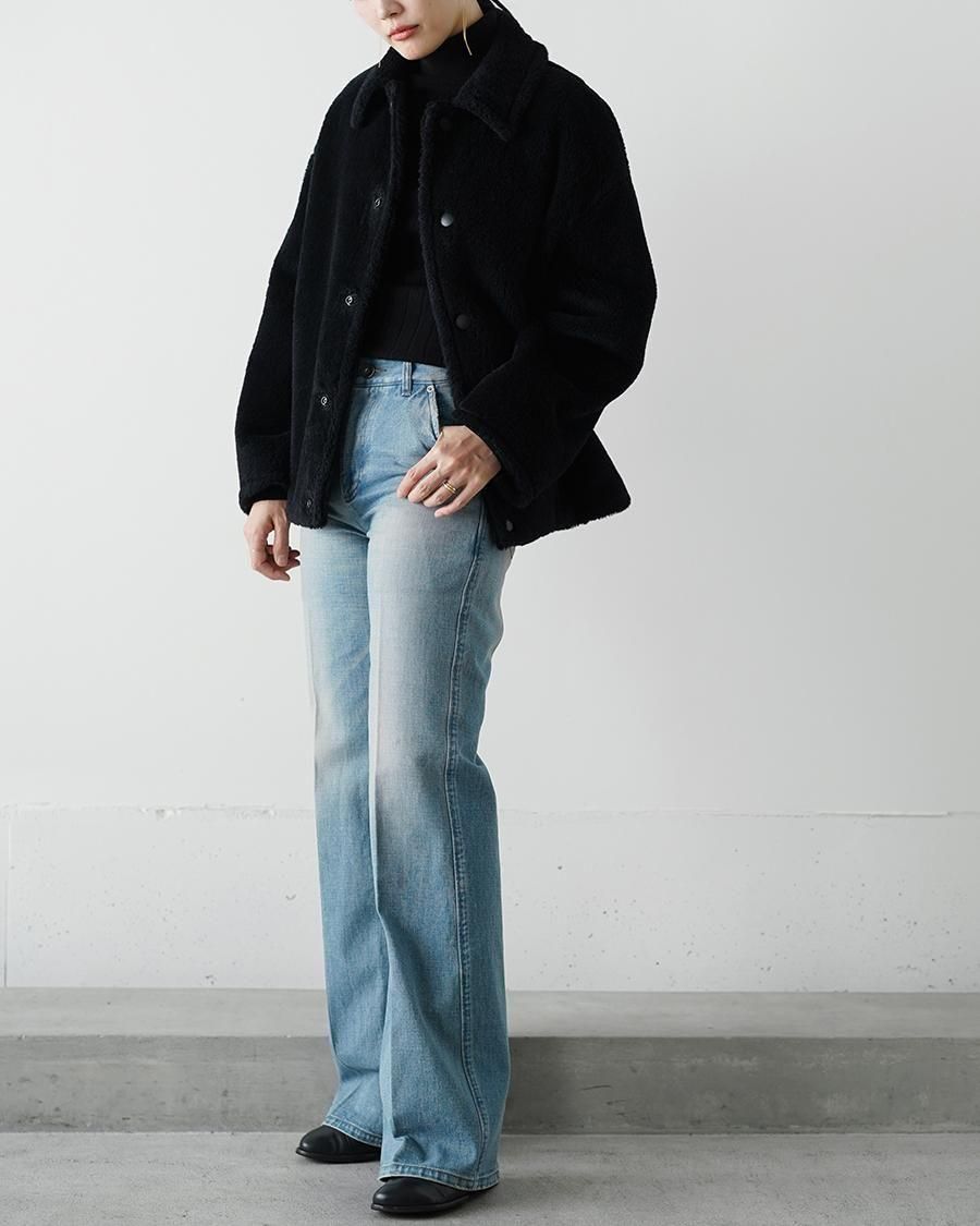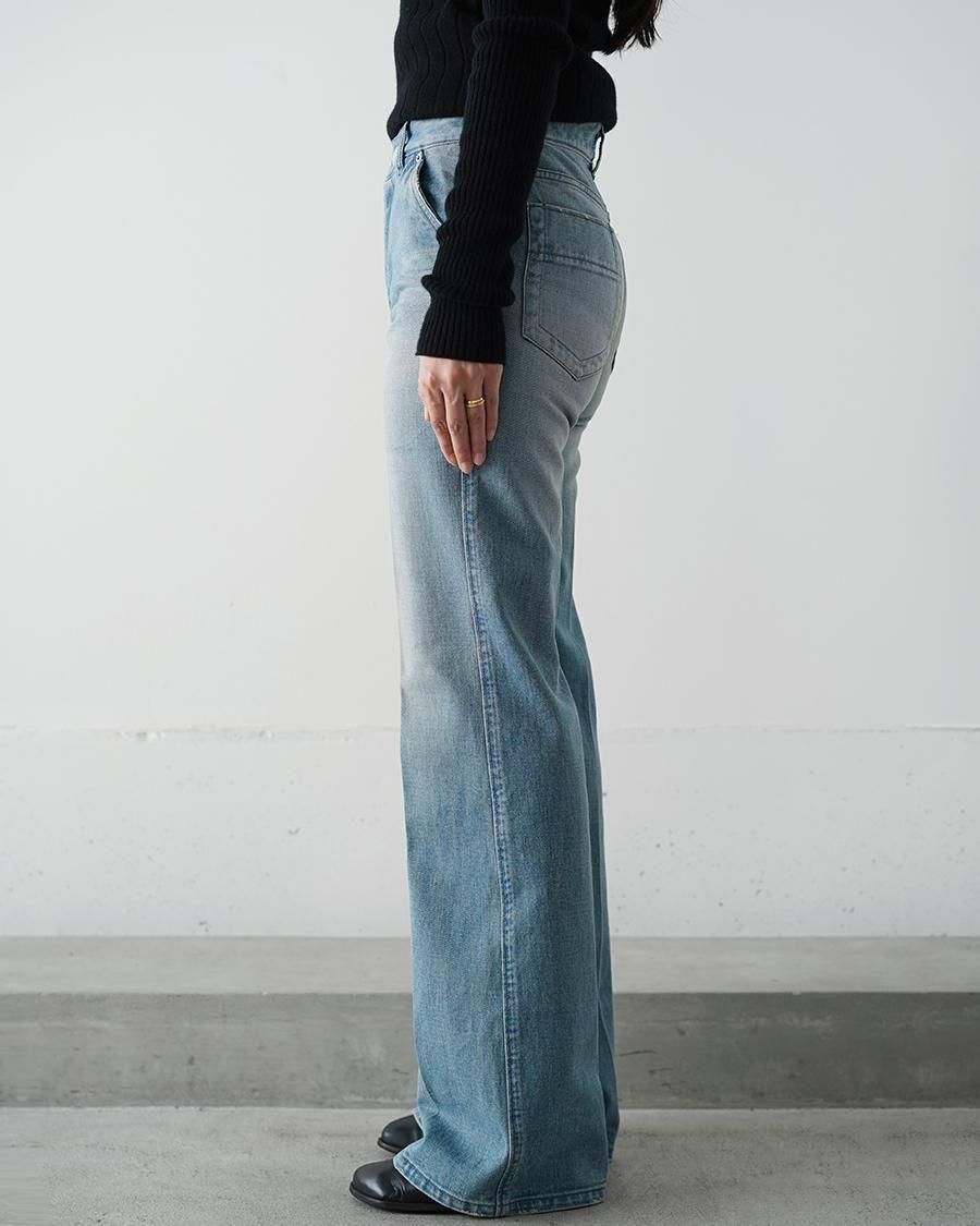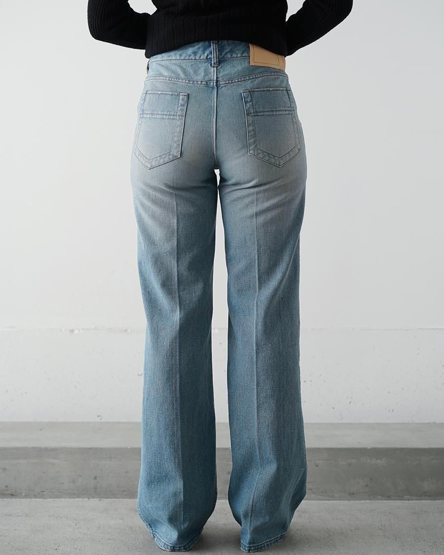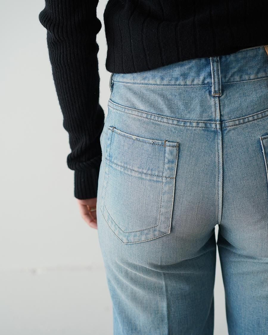 THE RERACS (ザ・リラクス)から、コットン素材のオリジナルレフトハンドデニムを使用したペンシルフレアパンツのご紹介です。ヒップから膝までをコンパクトにし、膝下をフレアにすることで腰回りをすっきり見せる、女性らしい動きのあるシルエットに仕上げております。フロントはL字ポケットを採用し、ボタンはシルバーのオリジナルタックボタンを使用。また、パッチ部分はレザーを使用しクラシックな印象にしています。ウエストは芯地で厚みをだし、保形性を持たせた構築的なパターン設計となっており、デニムを糸の撚りと同じ方向の左綾で織り上げることで、表面がフラットになり、光沢感としなやかな風合いを併せもつ今までにない軽やかな履き心地のデニムパンツに仕上げています。THE RERACSらしい細かなこだわりを感じられるデニムです。