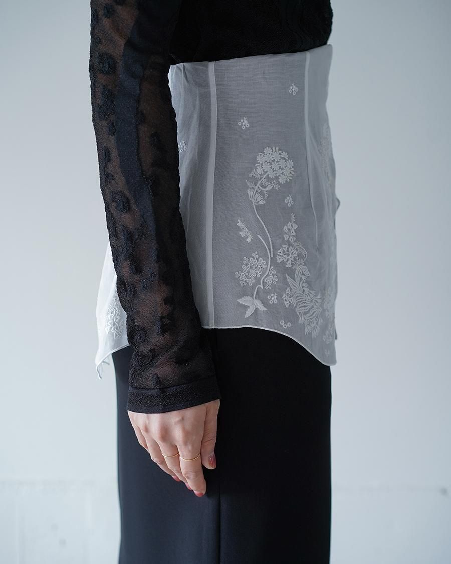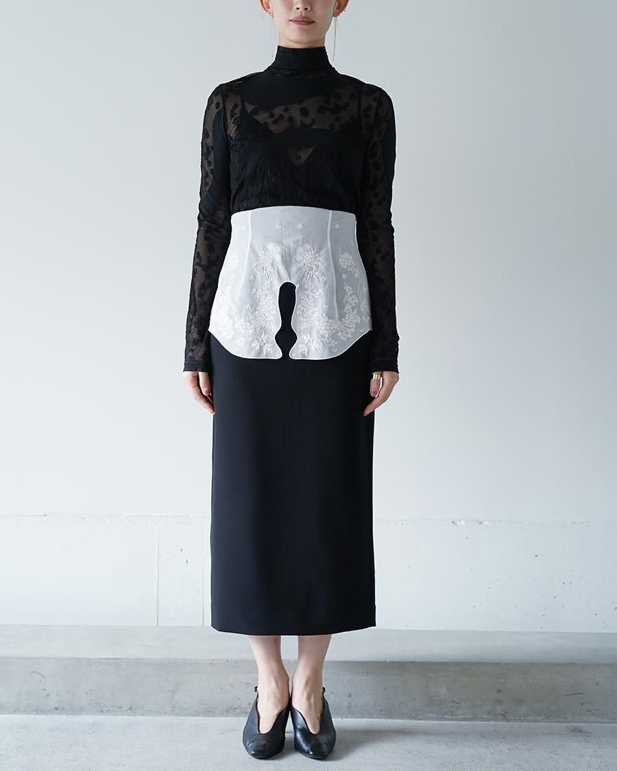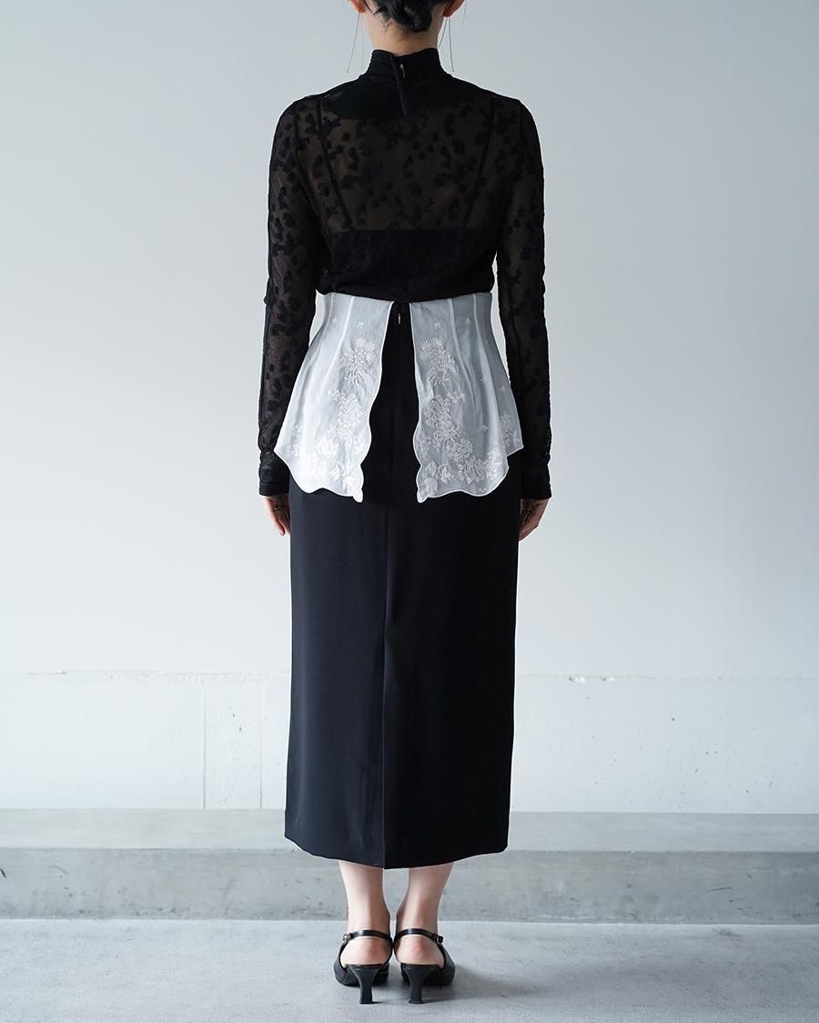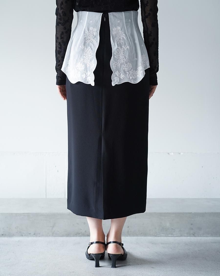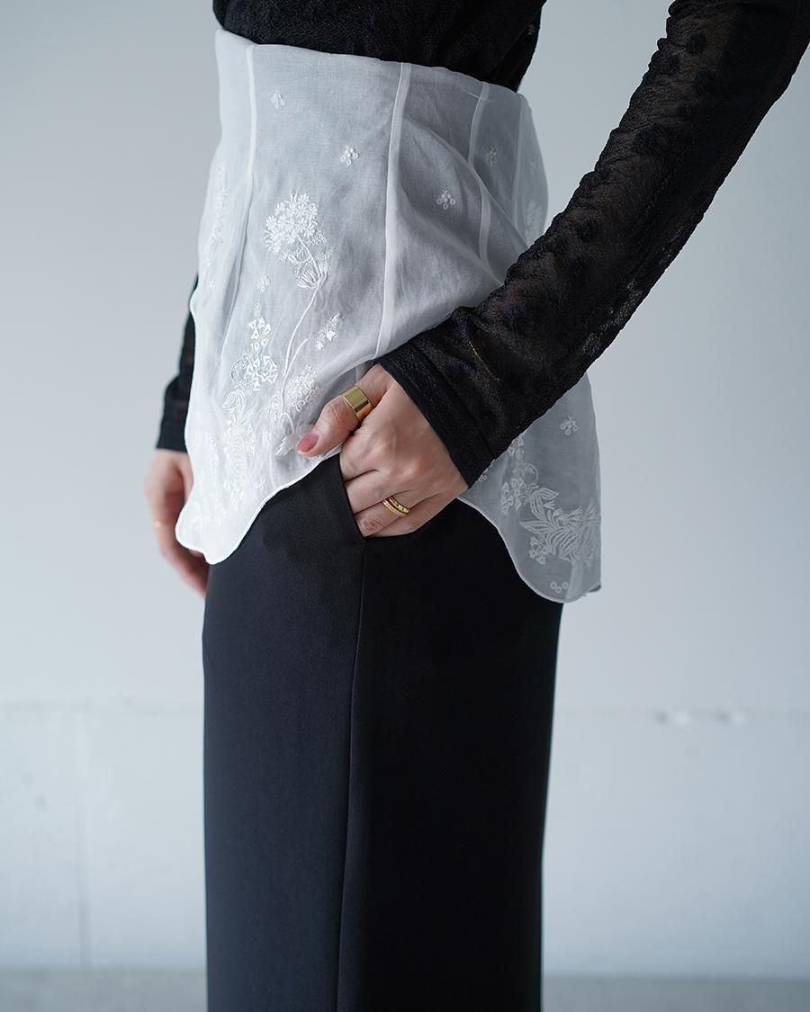 MameKurogouchi(マメクロゴウチ)から、トリアセテートとポリエステルのジョーゼットを使用した刺繍ペプラムスカートのご紹介です。トリアセテートの中でも膨らみのある糸を使用し、ポリエステルを混合することで、ストレッチ性のある生地が扱いしやすく、発色性の良さを獲得しながらシワにもなりにくい素材がイージーケアを叶える。オーガンジーの生地に刺繍を施したペプラムをつけることで贅沢で華やかな印象を与える。オリジナルの花柄を描いたレースのペプラムは取り外してシンプルなペンシルスカートとしても活躍する。ハイウエストのデザインが縦のラインを強調しメリハリのあるシルエットを作り出し、スタイルアップを叶える1着に。