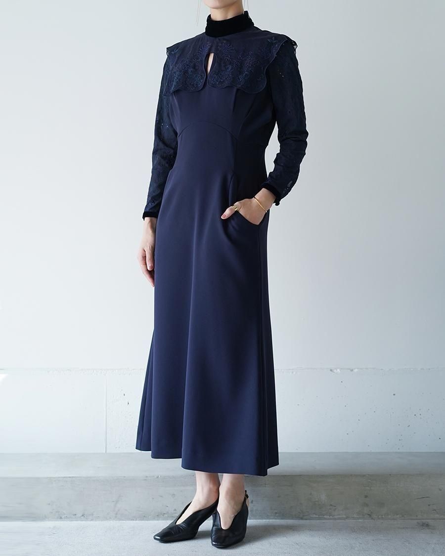 MameKurogouchi(マメクロゴウチ)から、トリアセテートとポリエステルのジョーゼットを使用したベルベットカラードレスのご紹介です。トリアセテートの中でも膨らみのある糸を使用し、ポリエステルを混合することで、ストレッチ性のある生地が扱いしやすく、発色性の良さを獲得しながらシワにもなりにくい素材がイージーケアを叶える。袖の刺繍は薄手のシフォンに、襟の刺繍はオーガンジーにと、異なる生地に施した刺繍が贅沢で華やかな印象を与える。オリジナルの花柄を描いたオーガンジーレースが首から肩にかけて華奢な印象を与え、シェイプされたウエストからすとんと落ちる生地感が縦のラインを強調し、スタイルアップを叶える1着。