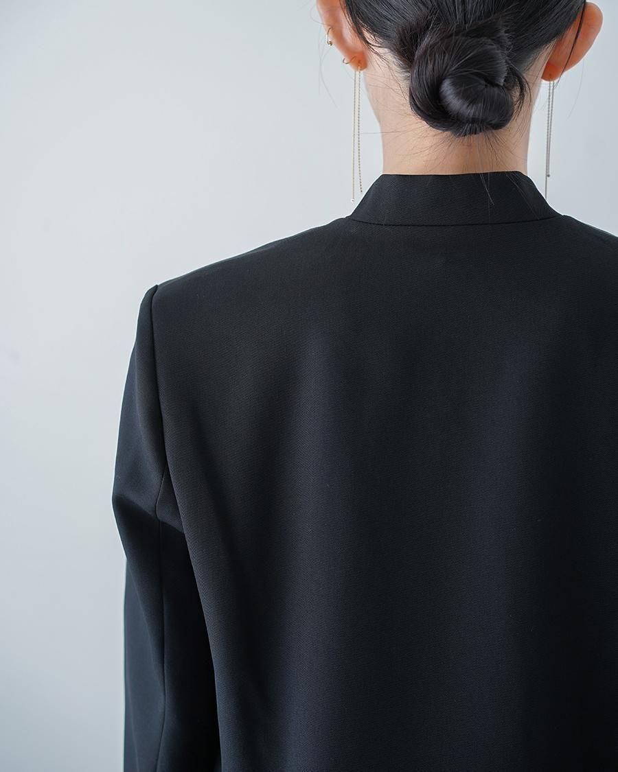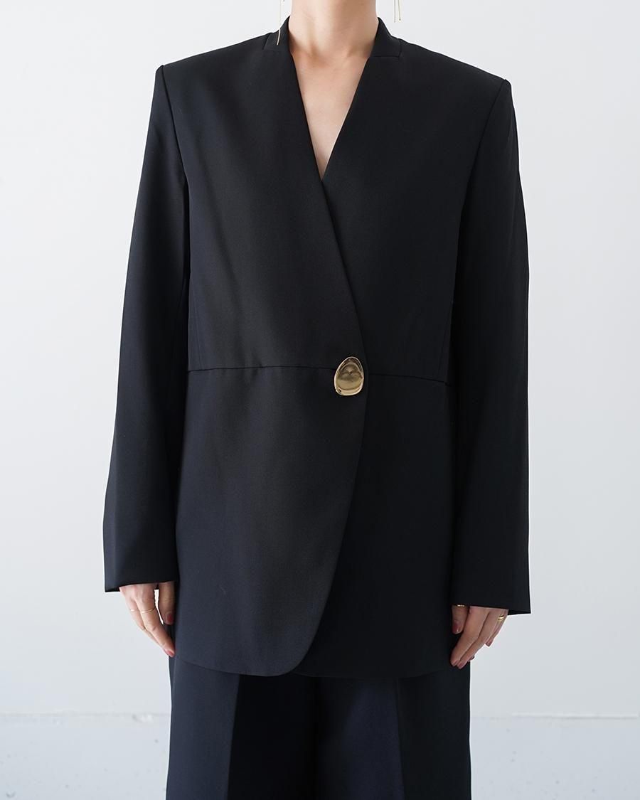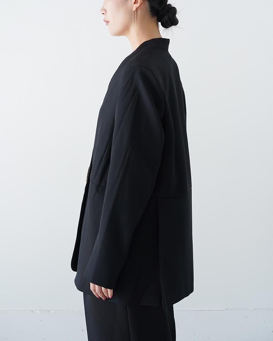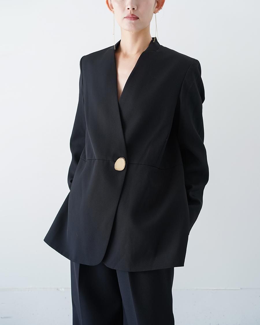 HARUNOBUMURATA(ハルノブムラタ)秋冬新作コレクションより、ブランドのエッセンシャルアイテムとして提案される、ミニマルなカラーレスジャケットのご紹介です。新素材として新たにアップデートされた、滑らかで上品な光沢をもつウール素材を採用した一枚。イタリア製のプレートボタンが、ジュエリーのようなアクセントとしてミニマルな構築美を際立たせます。同素材とのパンツとのセットアップではフォーマルに、単品ではカジュアルなボトムスとも好相性で、幅広いスタイリングに対応します。